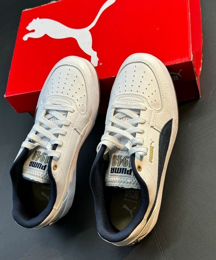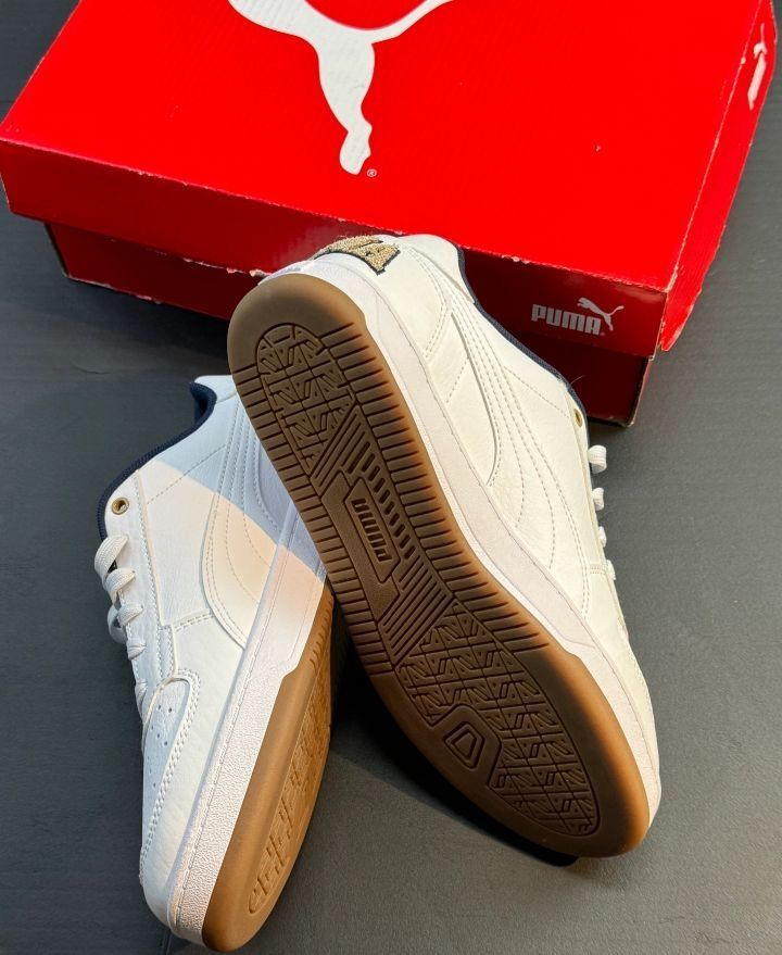 这双彪马休闲鞋,外观简约又不失亮点。白色鞋面搭配深蓝内里,经典耐看,后跟处金色“PUMA”刺绣醒目吸睛。皮革材质质感不错,穿着有型。鞋底软硬适中,走路舒适,日常搭配牛仔裤、运动裤都很合适,是一双兼具颜值与实用性的百搭鞋款。 👟球鞋名称: 📌是否偏码【偏大/不偏码/偏小】: ⛹️性能打分(每项满分均为10): 包裹: 缓震: 抓地: 耐磨: 稳定: 防侧翻: 透气: 重量: 📖总结评价: