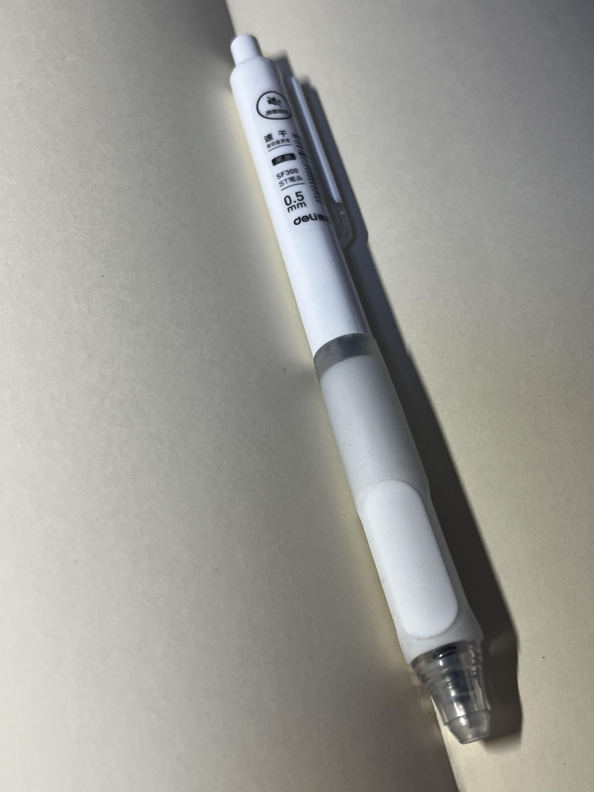得力sf300,不愧是六边形战士。 静音按动设计,在图书馆不会有噪音 双珠st笔头,写起来还很稳 书写顺滑,虽然是直液笔但是不洇墨不羽化 墨水是比较浓郁的黑色,但是油墨是速干的,再也不用担心成小黑手了 适合大量书写,做手账也很适配哦!图源网络,侵删