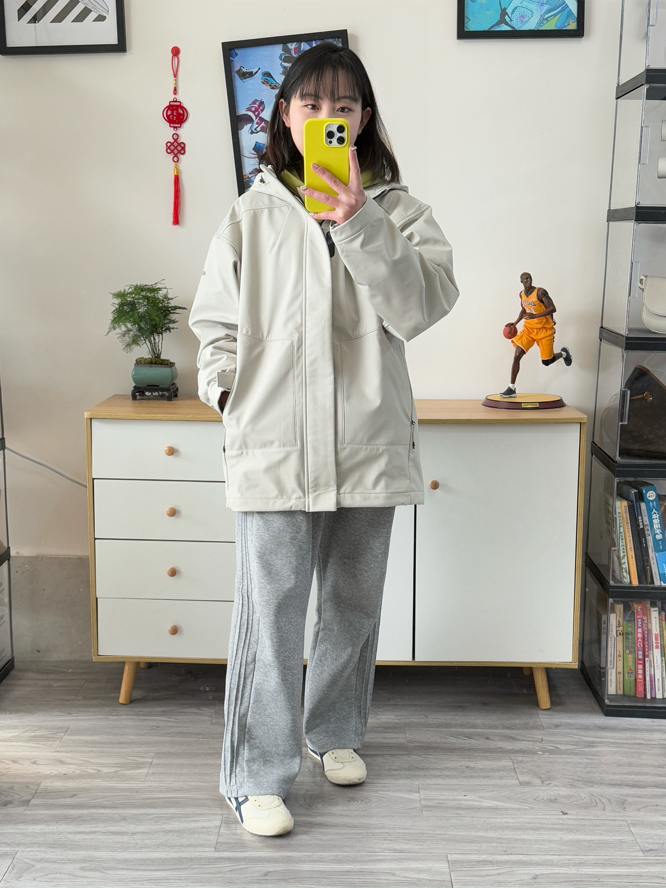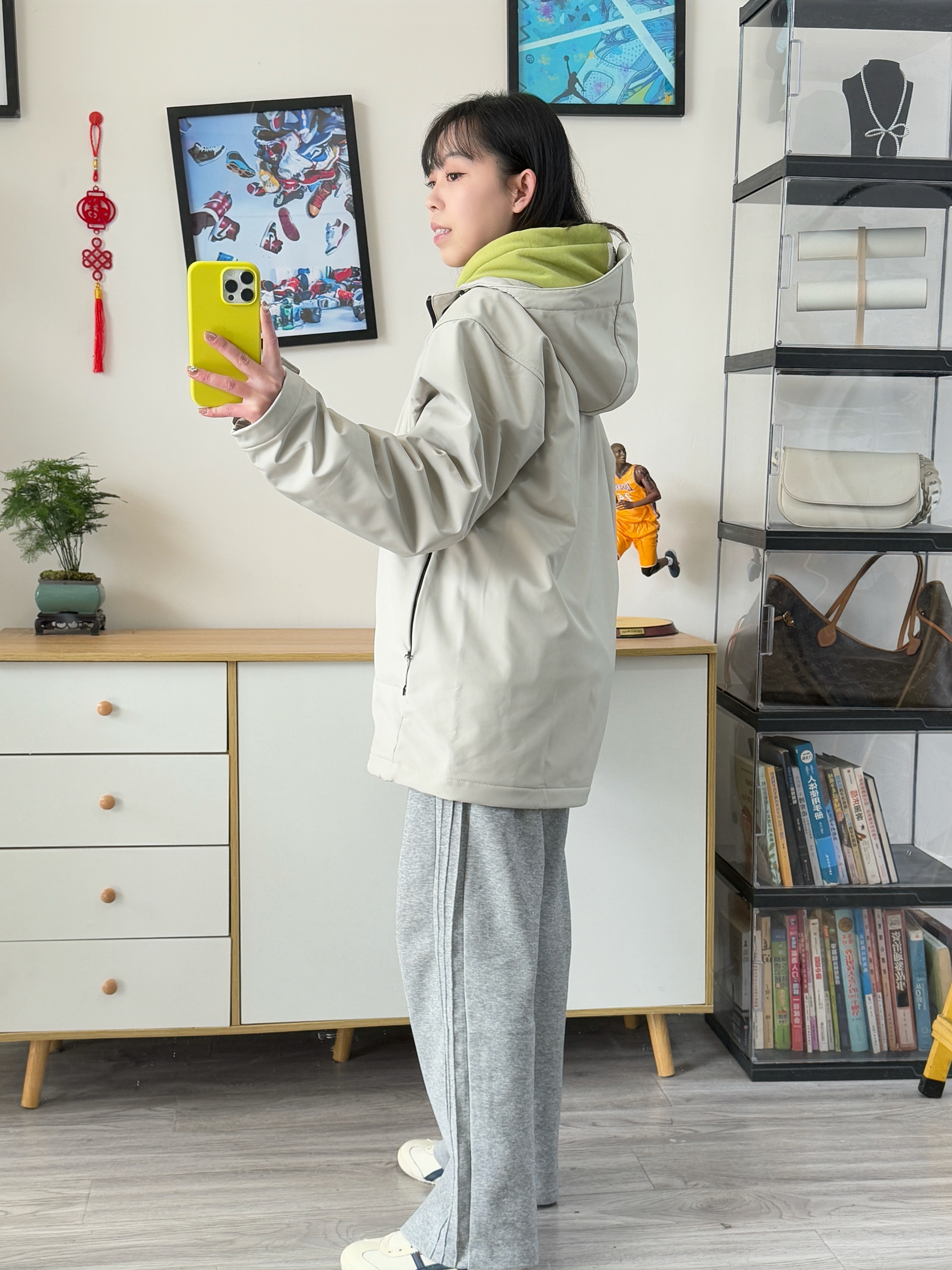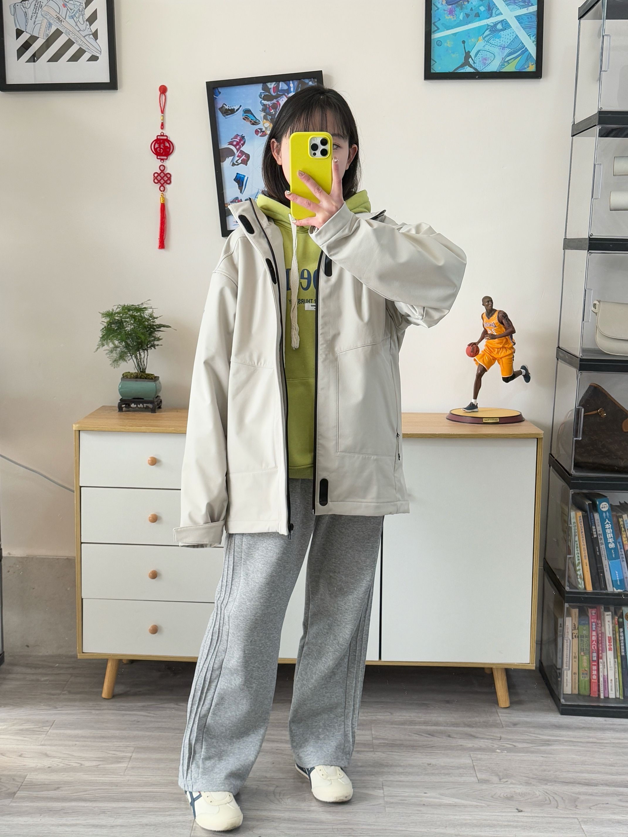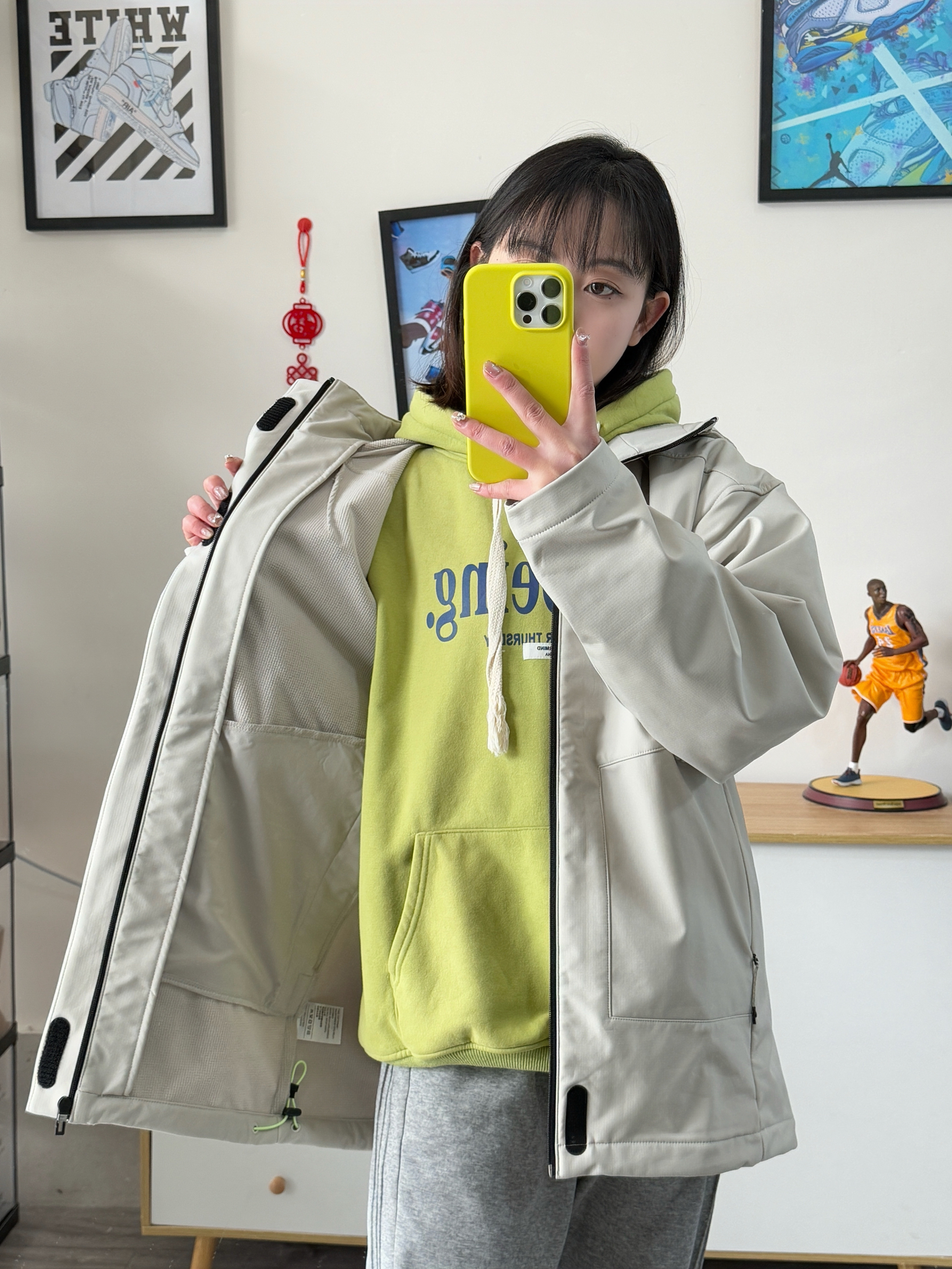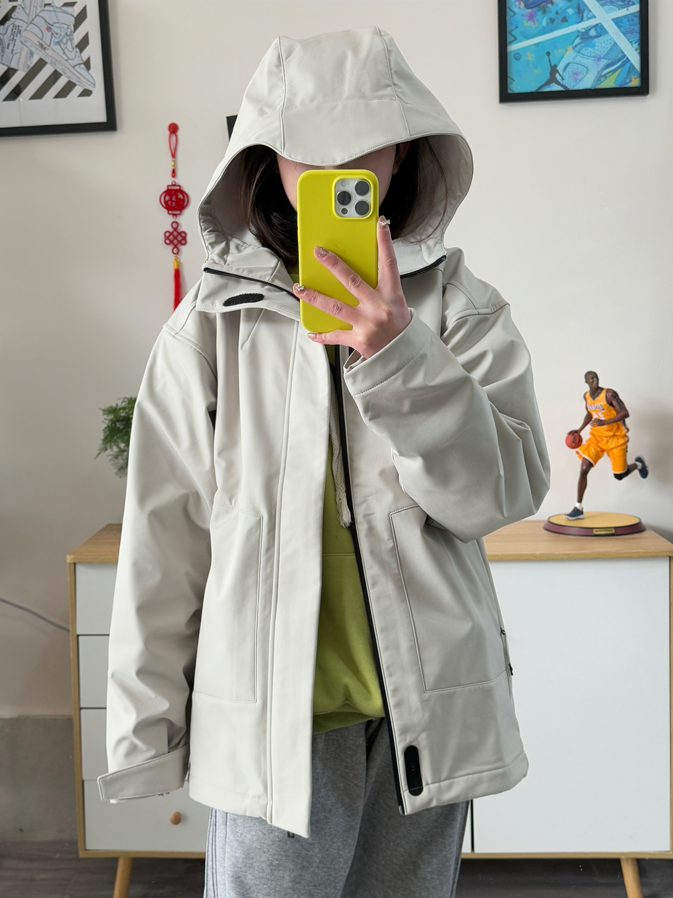 155,86斤穿的s码,男款宽松版型,这款尺码偏大哈!我里面穿厚卫衣穿这个码都挺宽松的,袖子也会长好一些 面料比较厚,防风也防泼水,内里和帽子里面还有一体绒, 颜色浅浅的搭配绿色卫衣,灰色卫裤少年感满满,有春天那个味儿了!