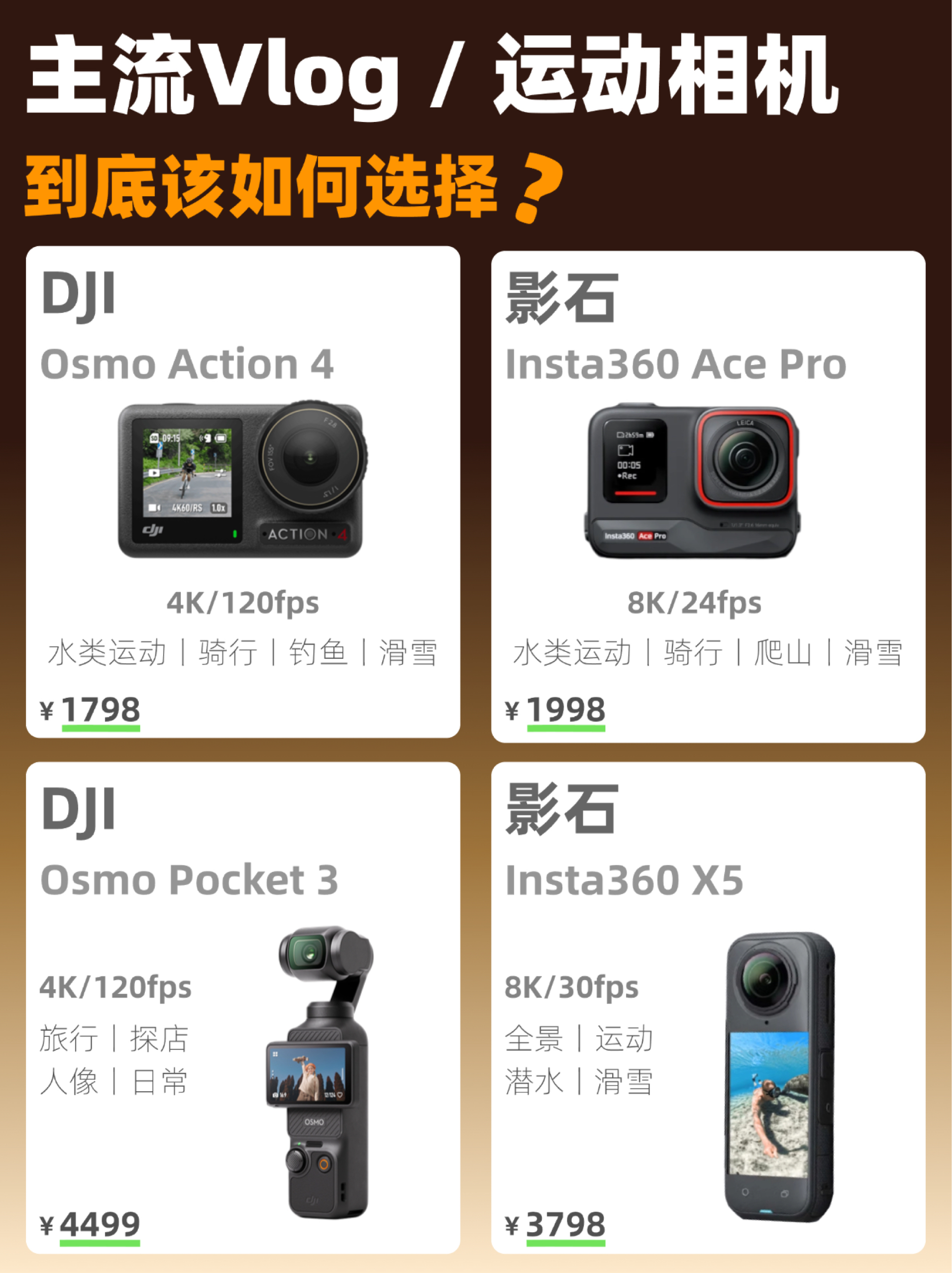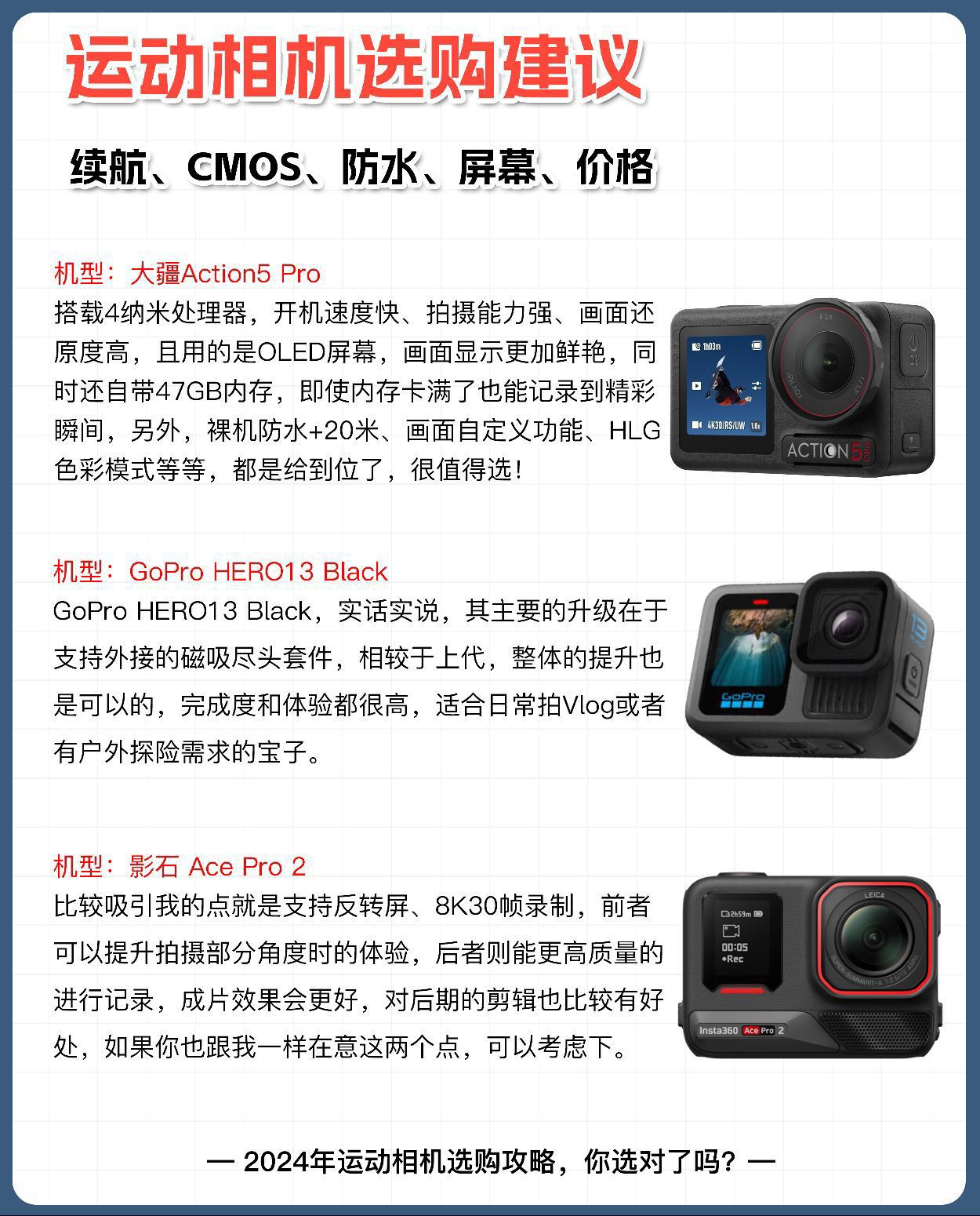 本篇笔记关联了DJI/大疆 Osmo Action 5 Pro 运动相机 户外摩托骑行潜水徒步 vlog相机 便携式 超旗舰画质 电子防抖 旅拍 标准套装、GoPro Hero 13 Black 防水防抖运动相机 户外摩托骑行 慢动作连拍 标配版、insta360/影石 Ace Pro2 运动相机 街拍 智能防抖 岩墨灰 标准套装等商品,为用户提供真实的使用体验和购买参考。