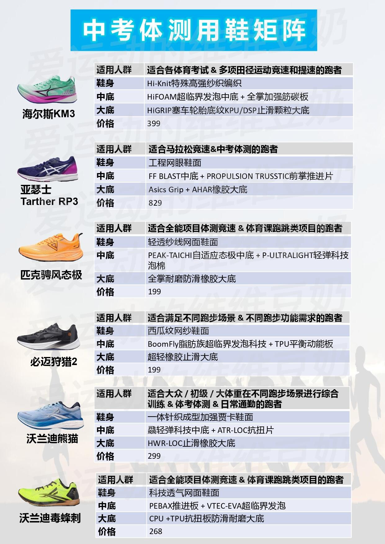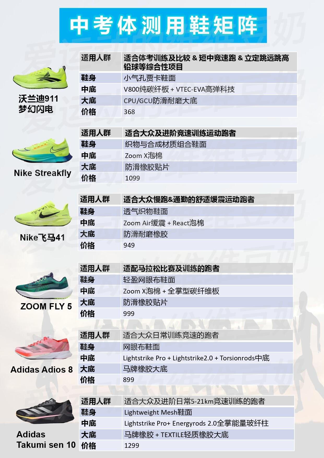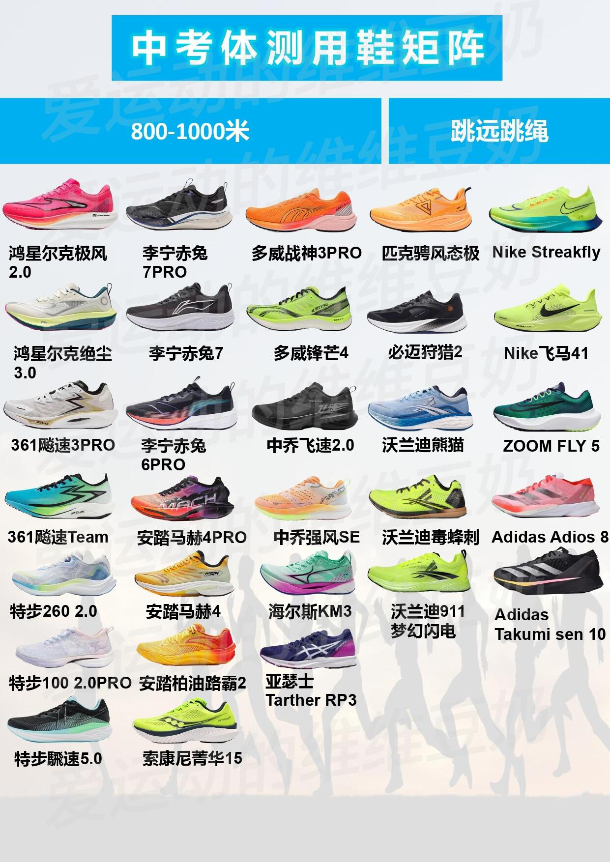 一张图搞懂中考体考体测用鞋|||一张图搞懂中考体考体测用鞋 学生应付日常的体考(不仅限于800-1000米的跑步考试,还有田径场地内的跳远、跳绳、跳高、铅球等中考项目),或者进行日常的体测,选择一双适合自己驾驭能力的鞋子能够起到如虎添翼的效果。用于场地竞训、体测、日常短距离跑,所以应该选择薄底、硬弹、轻量、耐久、抓地性能好的跑鞋。今天这边从各大品牌中给大家进行类别,这样归类可以方便跑者们简单而又清...