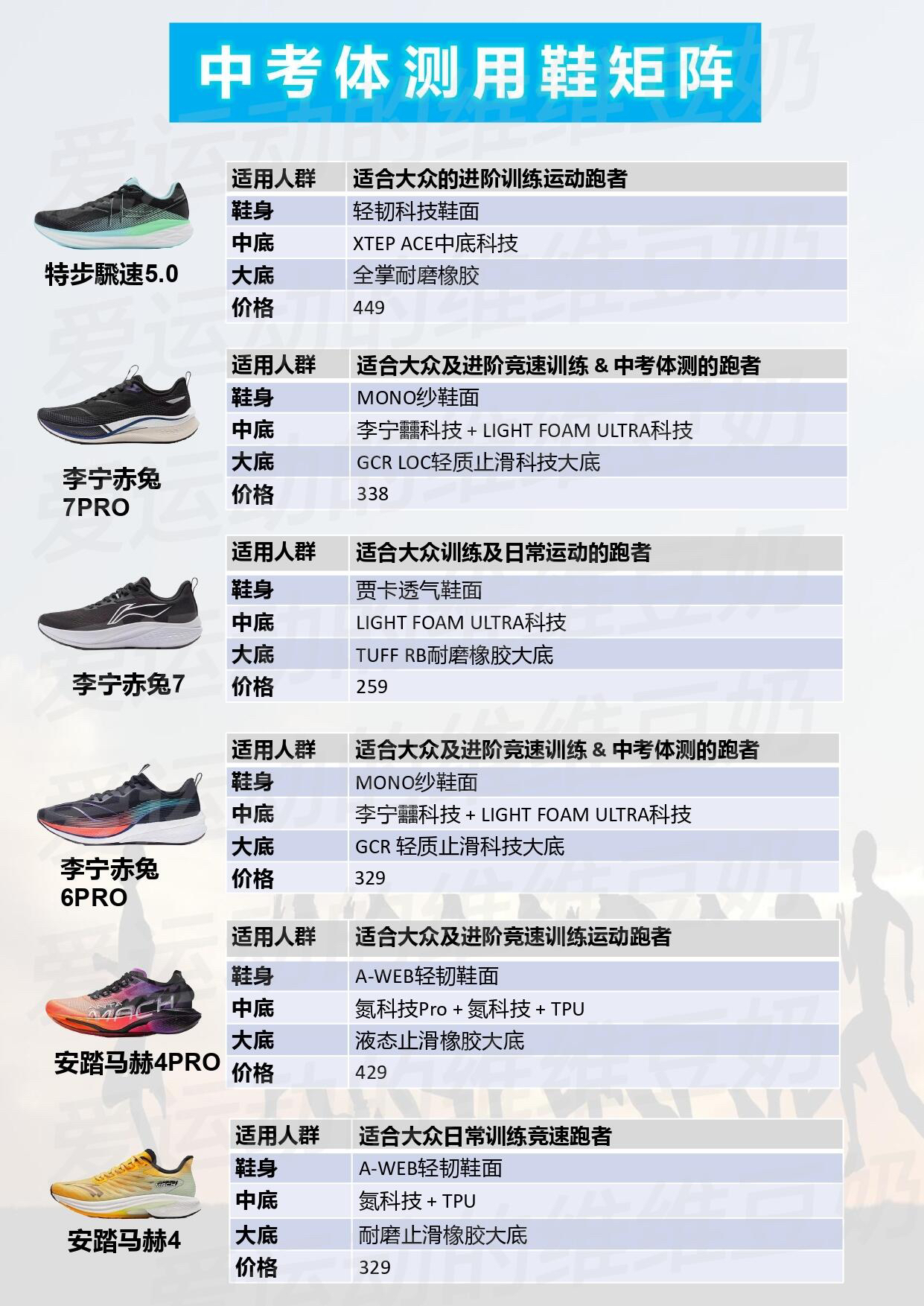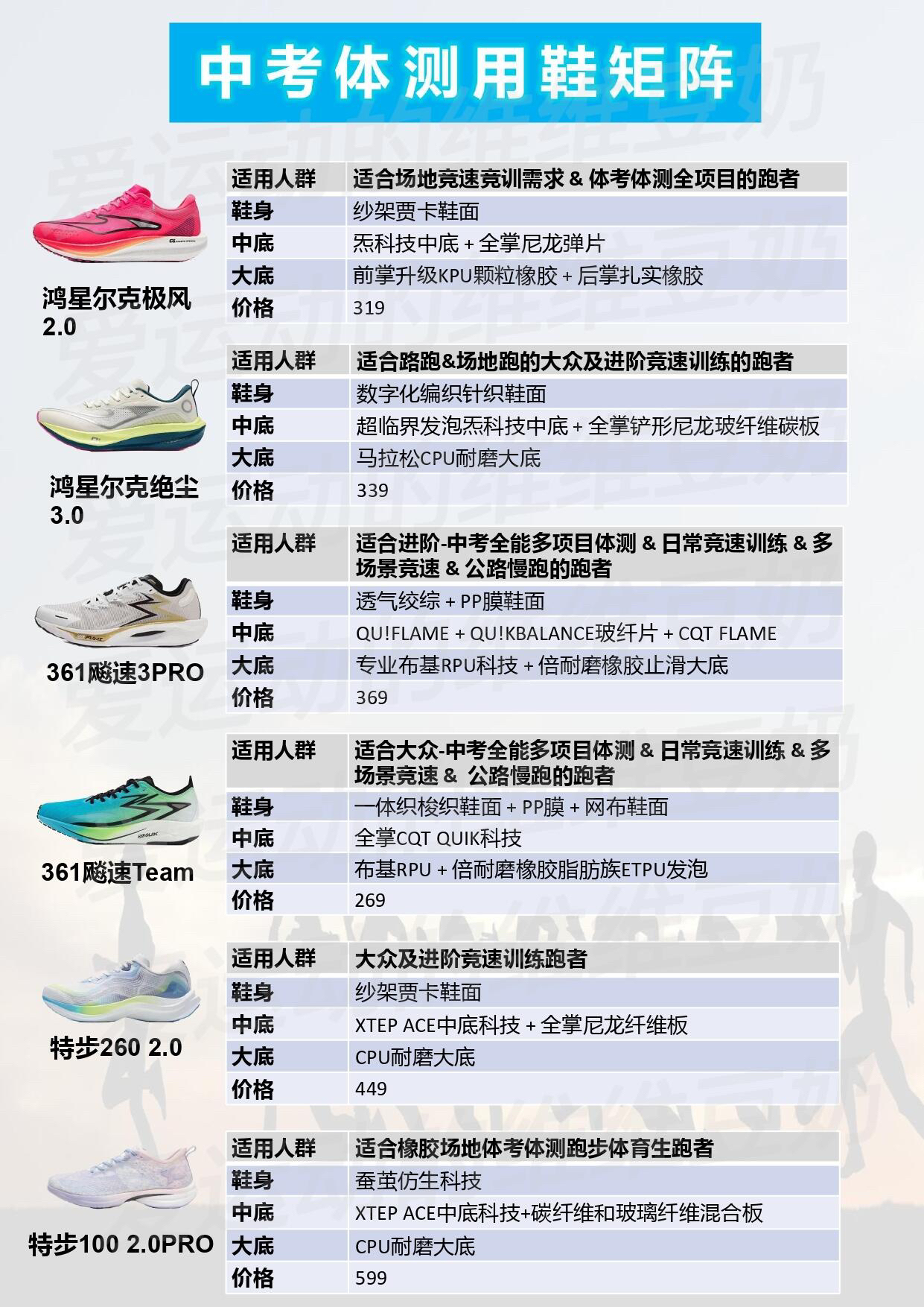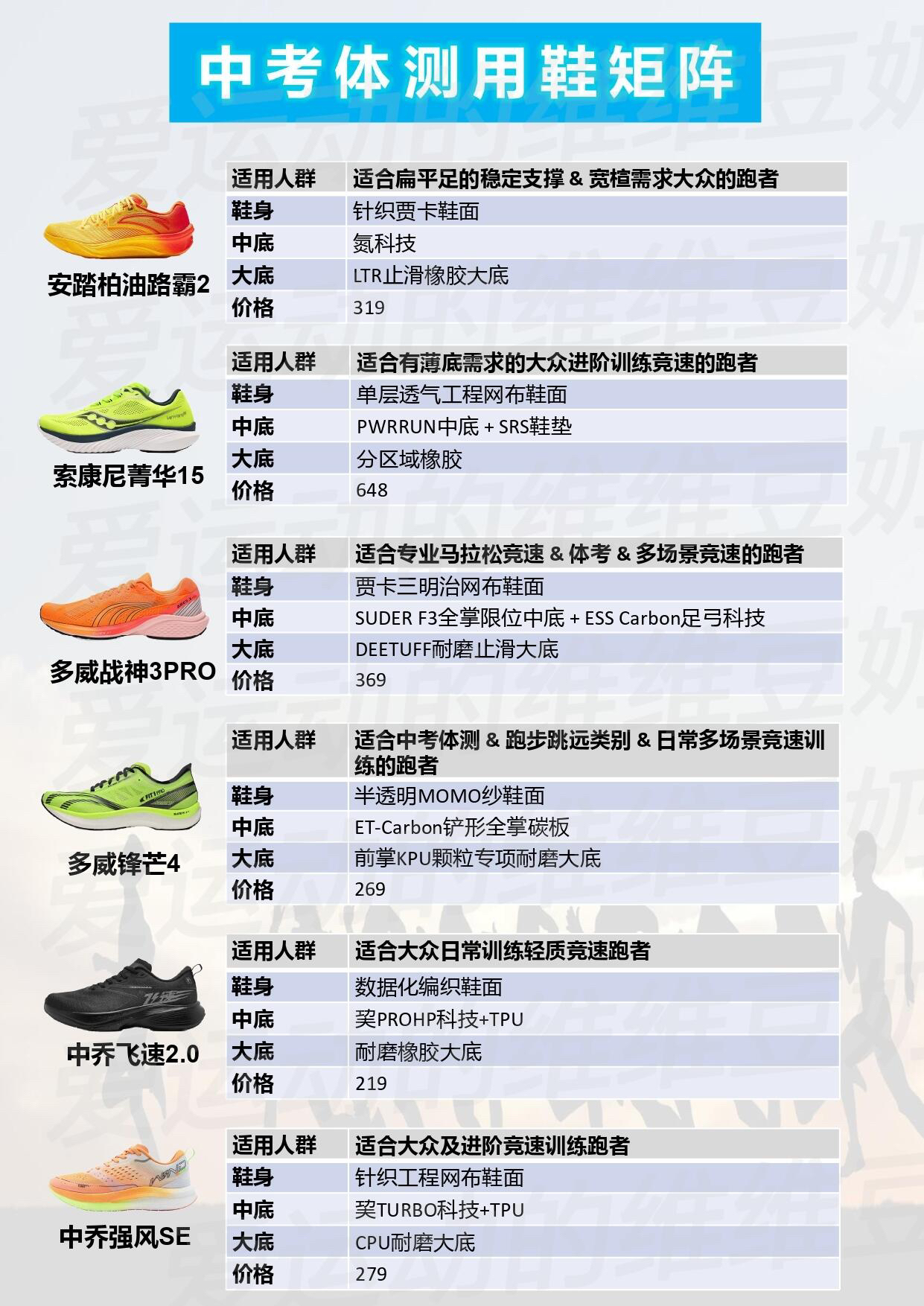 一张图搞懂中考体考体测用鞋|||一张图搞懂中考体考体测用鞋 学生应付日常的体考(不仅限于800-1000米的跑步考试,还有田径场地内的跳远、跳绳、跳高、铅球等中考项目),或者进行日常的体测,选择一双适合自己驾驭能力的鞋子能够起到如虎添翼的效果。用于场地竞训、体测、日常短距离跑,所以应该选择薄底、硬弹、轻量、耐久、抓地性能好的跑鞋。今天这边从各大品牌中给大家进行类别,这样归类可以方便跑者们简单而又清...