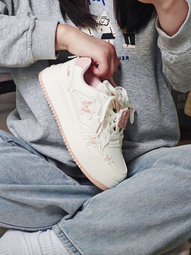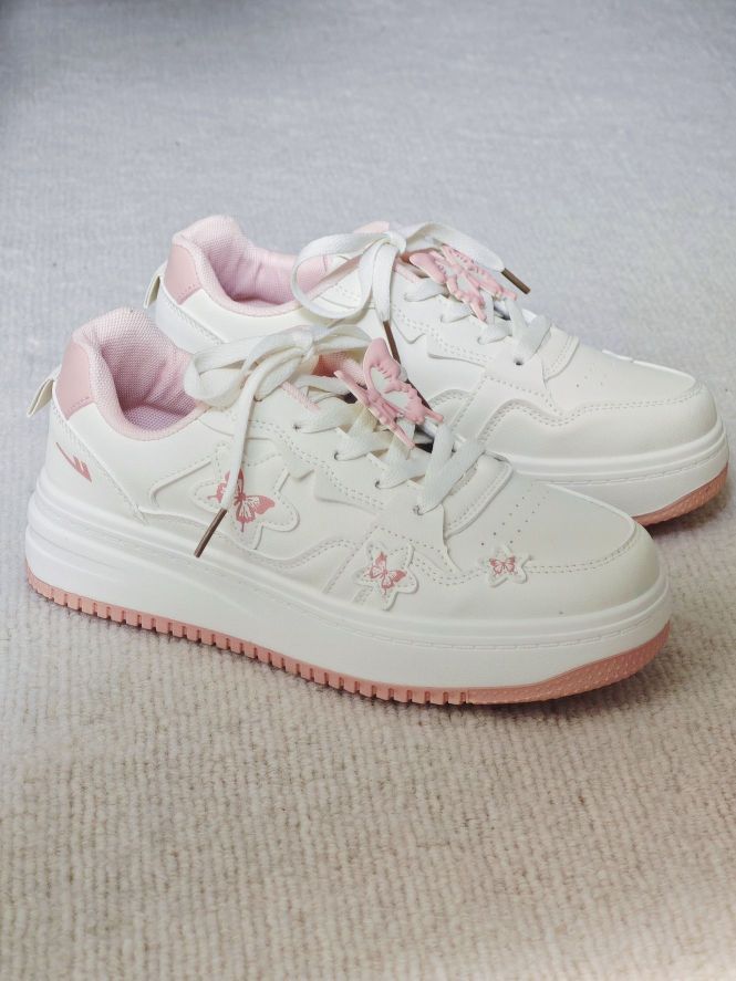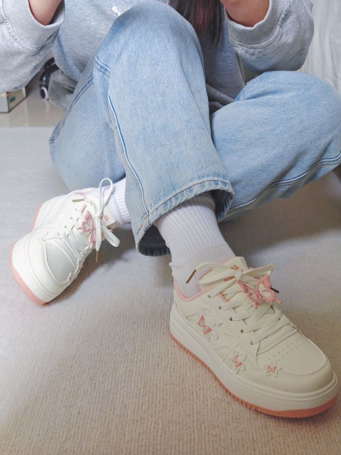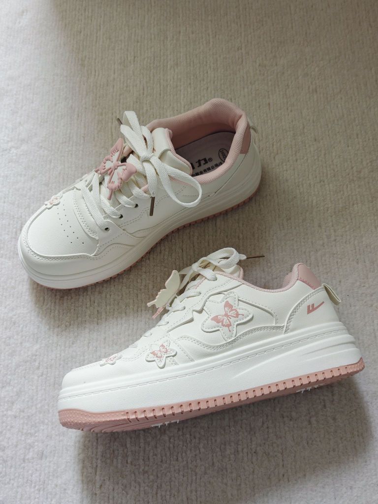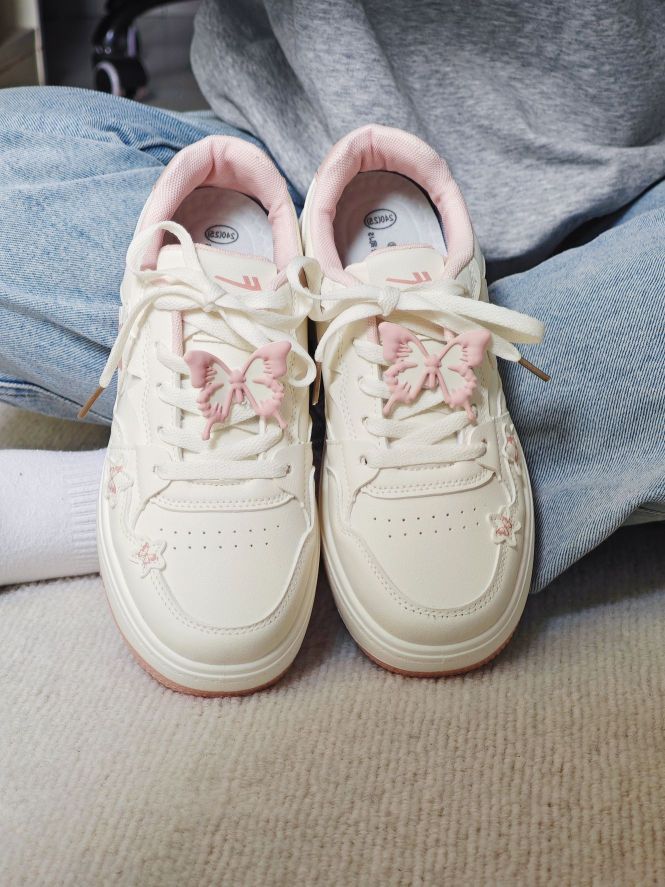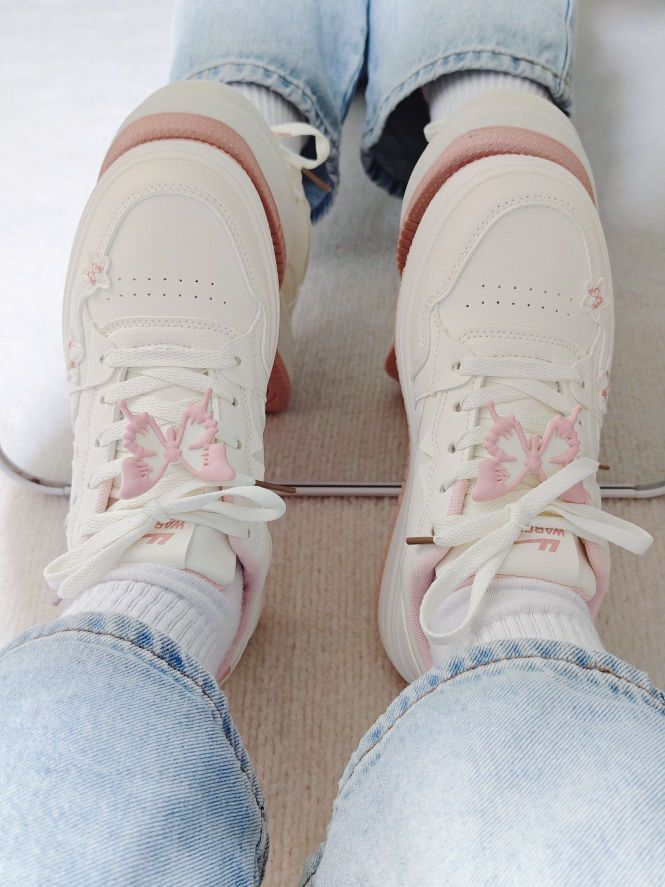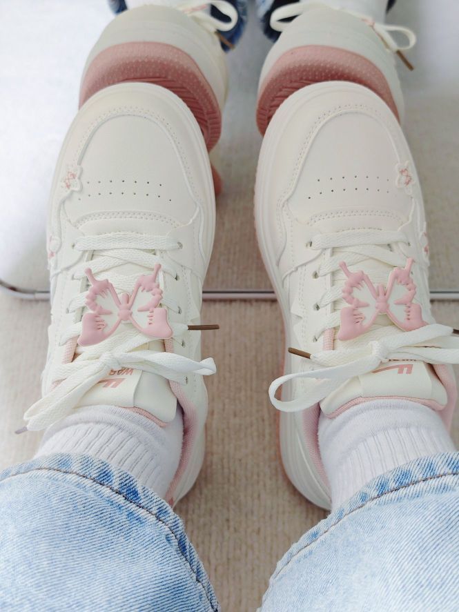 春天又到了买买买的季节了 正好需要户外赏花的穿搭 粉色的蝴蝶🦋板鞋和这个季节也太配了吧 鞋带搭配蝴蝶挂饰真的很有少女感 整体材质易于打理 鞋子轻便,户外走路一条也不累 随便搭配一条裤子或者白裙都很好看 百搭好穿,值得入手哦 而且80r的价格对于学生党来说比较友好
