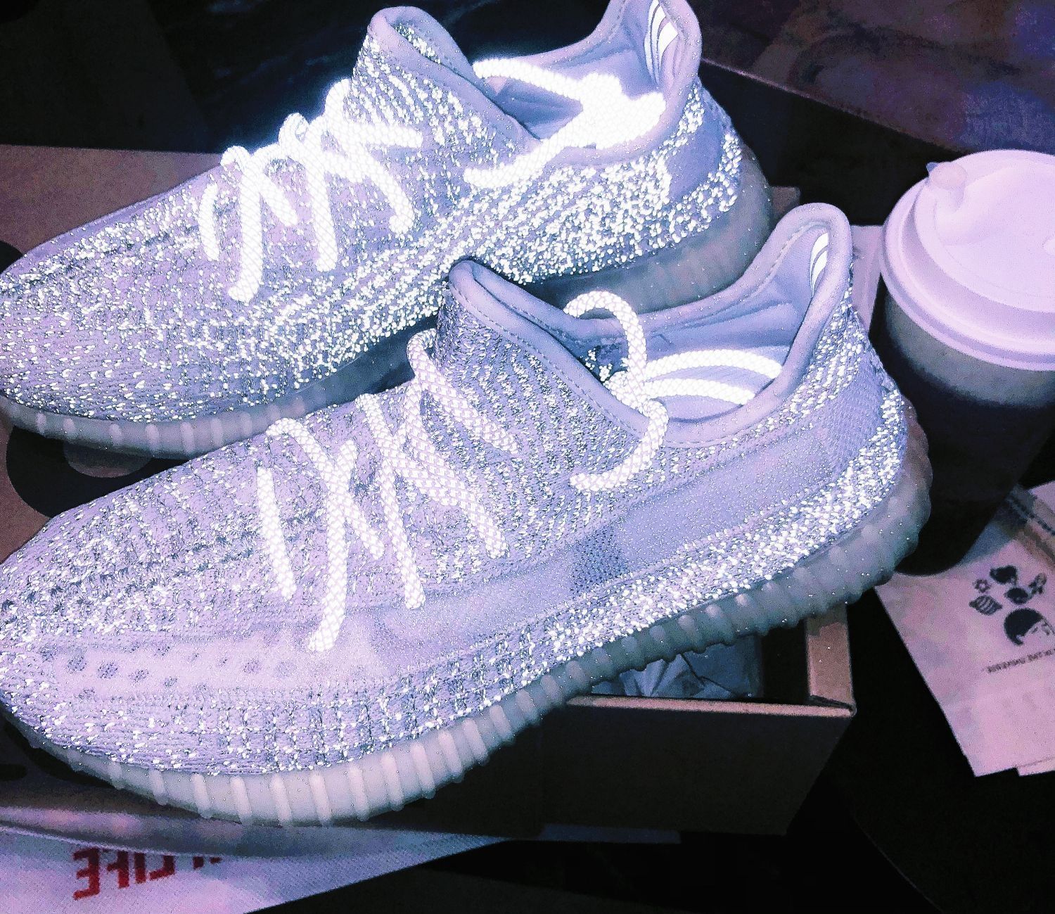 ✨ 整体外观|白天低调,夜晚开挂 ▪ 90% 反光覆盖:鞋面 3M 银丝编织,暗光下秒变 “移动星轨”(实测:路灯下反光距离超 10 米,夜跑被追着问链接) ▪ 水晶底彩蛋:半透明外底嵌灰调反光颗粒,抬脚瞬间 “踩碎银河”(对比普通 350,夜光面积提升 2 倍) ▪ 立体修脚:Primeknit 编织 + 微翘鞋头,视觉瘦脚 1 码(肉脚实测:比 AJ1 显脚窄 20%) 🔍 外观细节|心机到鞋...