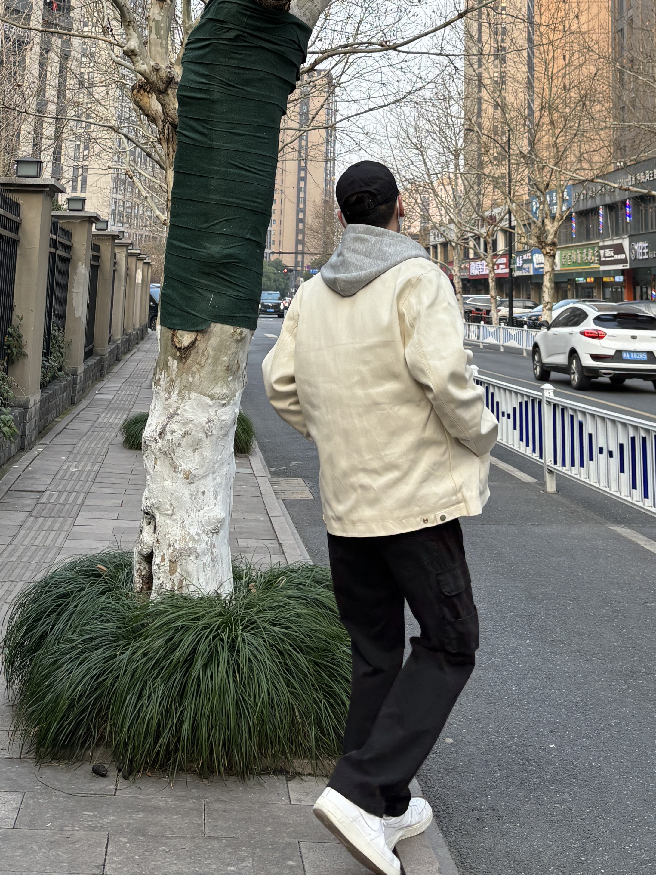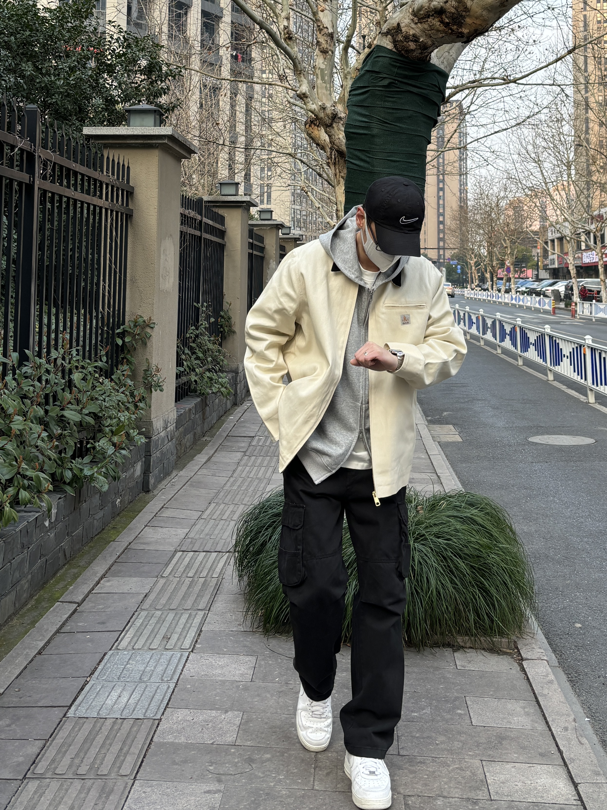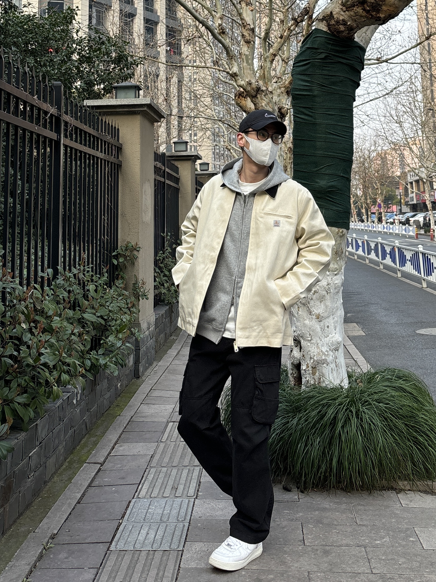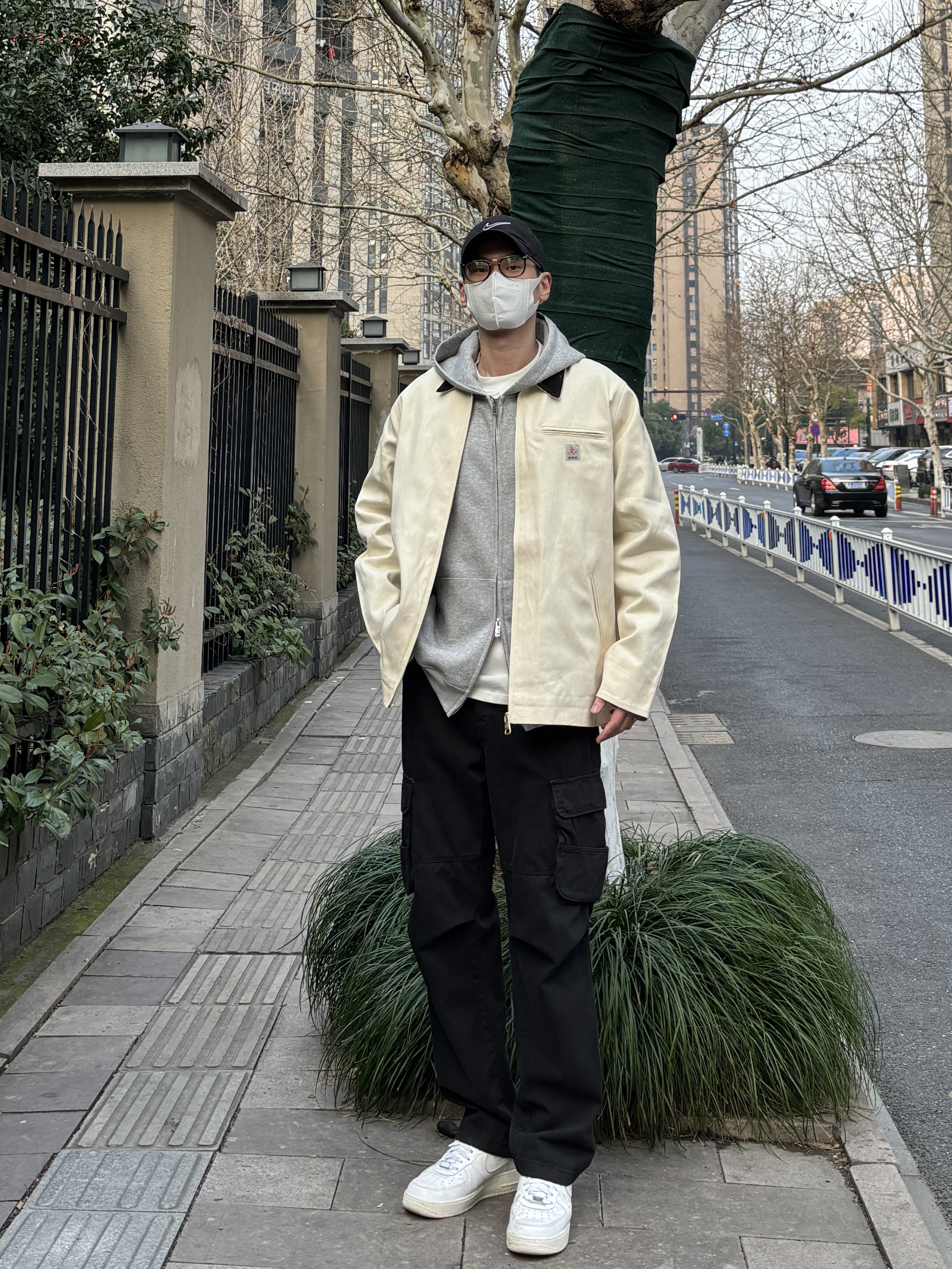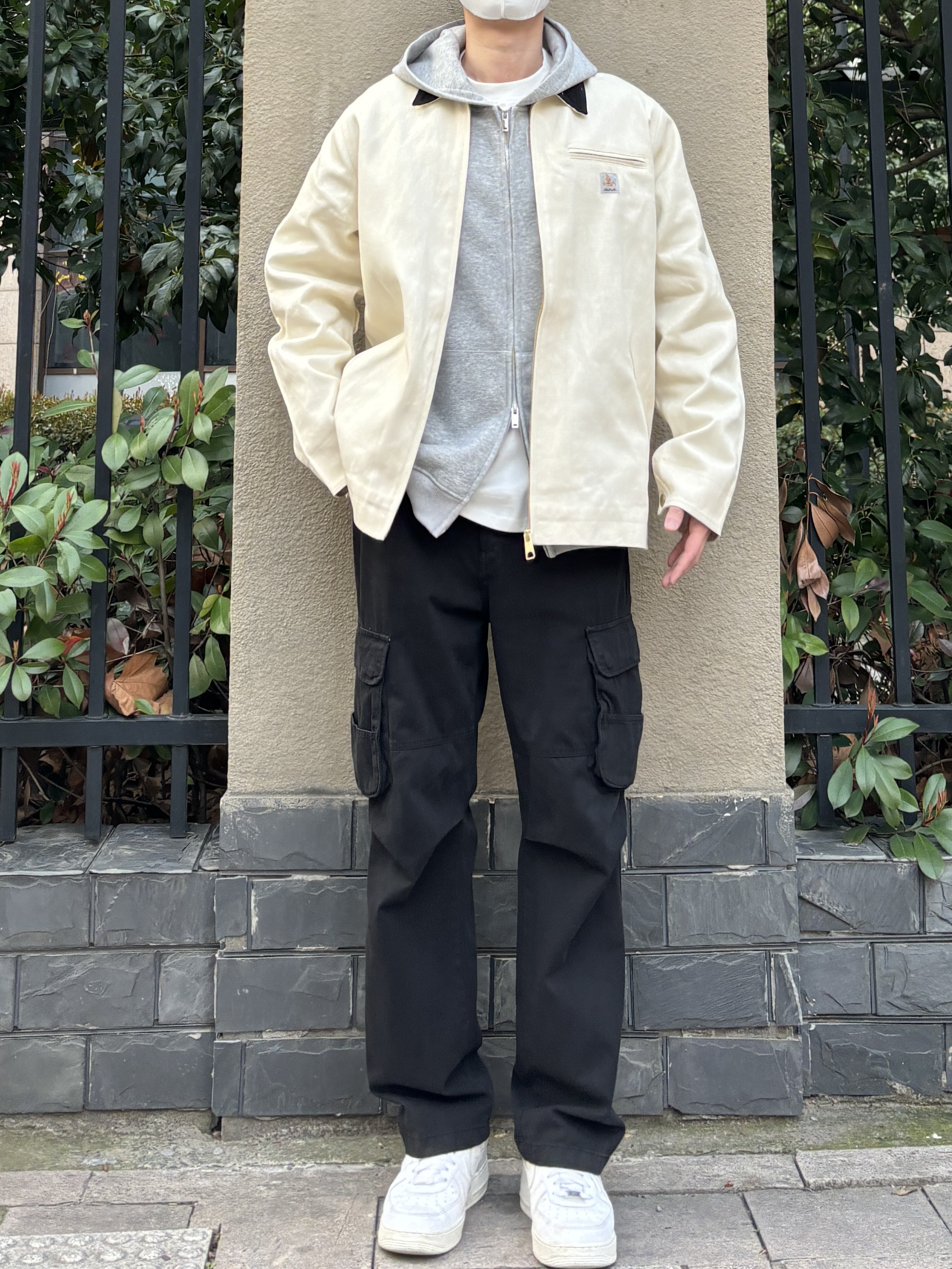 今天这套先用浅灰色双拉链开衫连帽卫衣做内搭 ⬇️ 裤子选择不挑腿型的黑色直筒水洗做旧工装裤 ⬇️ 鞋子上脚清爽干净的纯白色af1 ⬇️ 接着套上米白色宽松阔版翻领拼接底特律工装夹克 ⬇️ 最后戴一顶棒球帽呼应下裤子的颜色 - 今日搭配 衣服裤子:NICE LILI 鞋子:AF1纯白