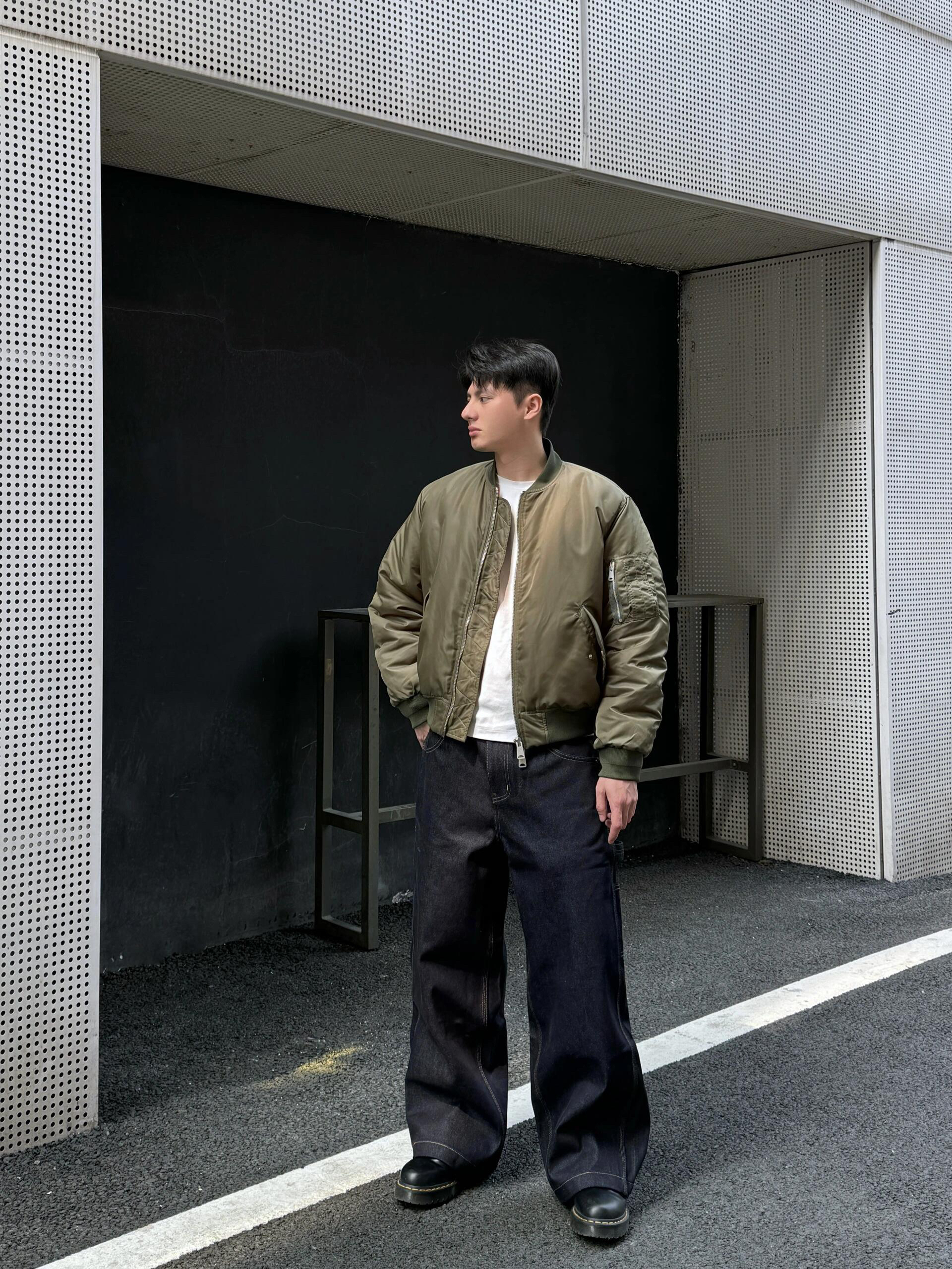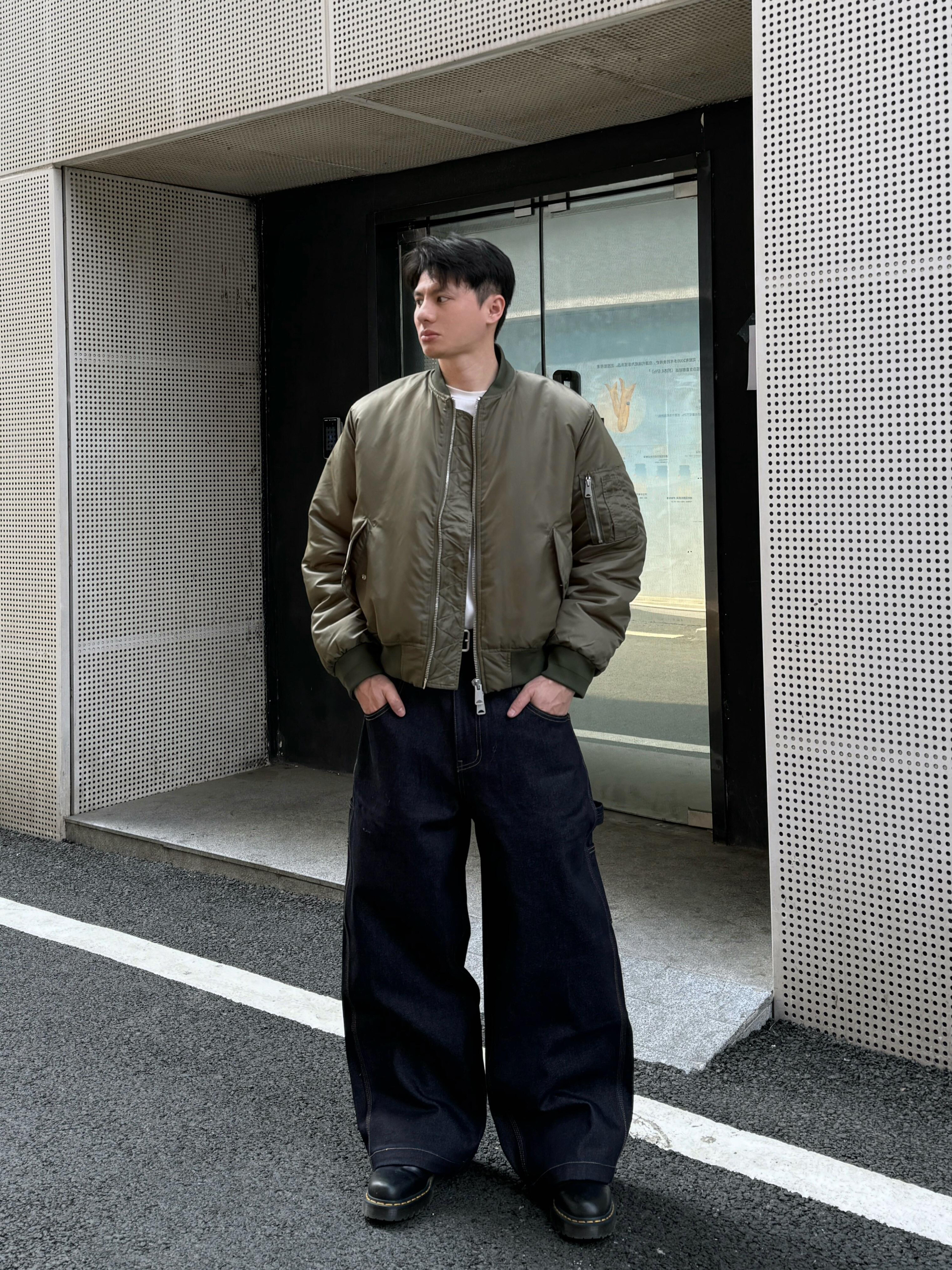春季实在是适合穿军绿色的飞行夹克 元年og的配色很复古 vintage质感很足 短宽boxy版型很经典好穿又很好搭配 适合春季穿搭或者秋冬叠穿都很稳 cleanfit风满满 搭配一条工装原牛 阔腿裤宽松版型就适合很大部分人穿着 后口袋细节很独特很帅 视觉效果直接拉满 开春照着抄作业 谁穿都硬帅的