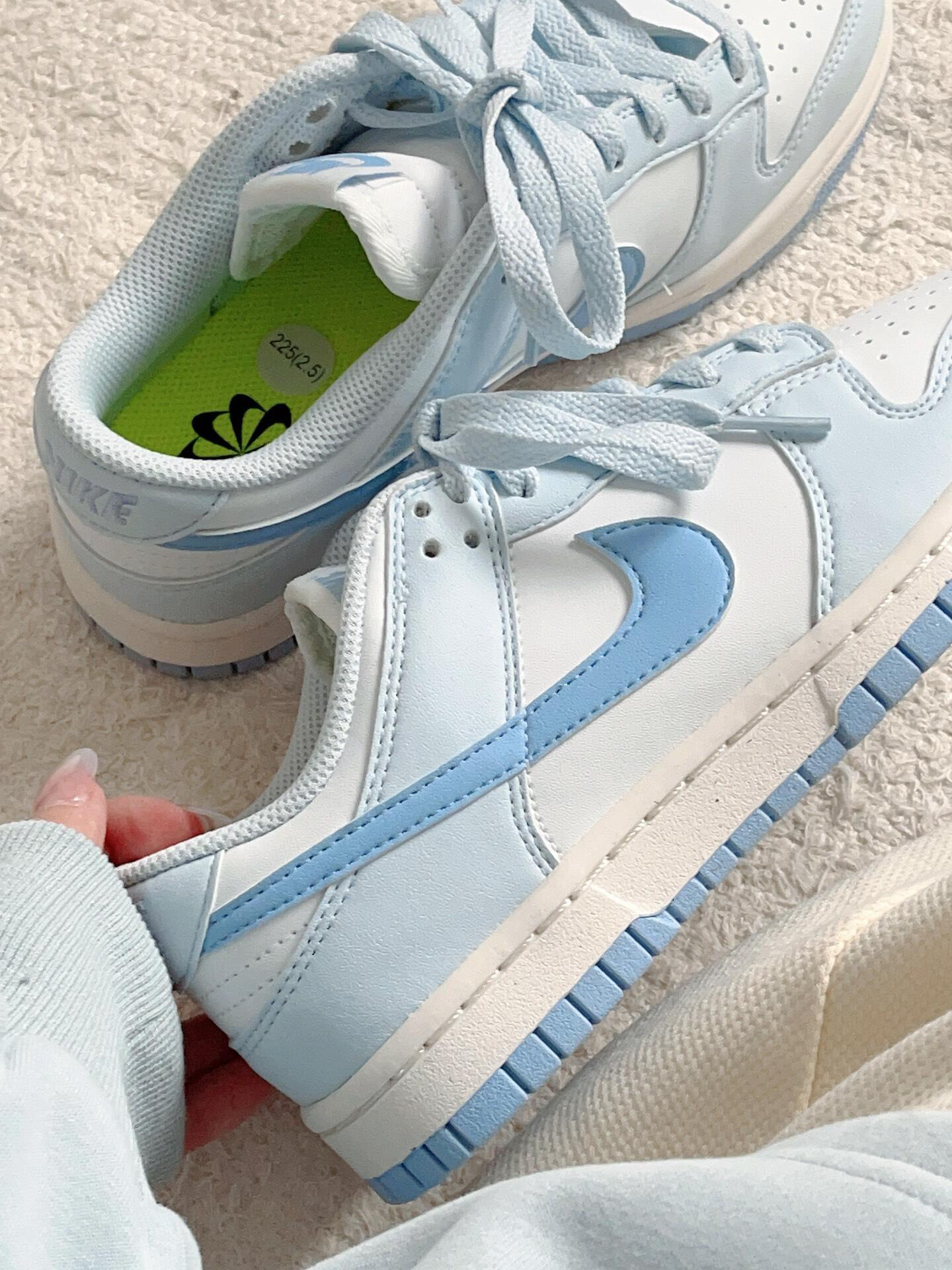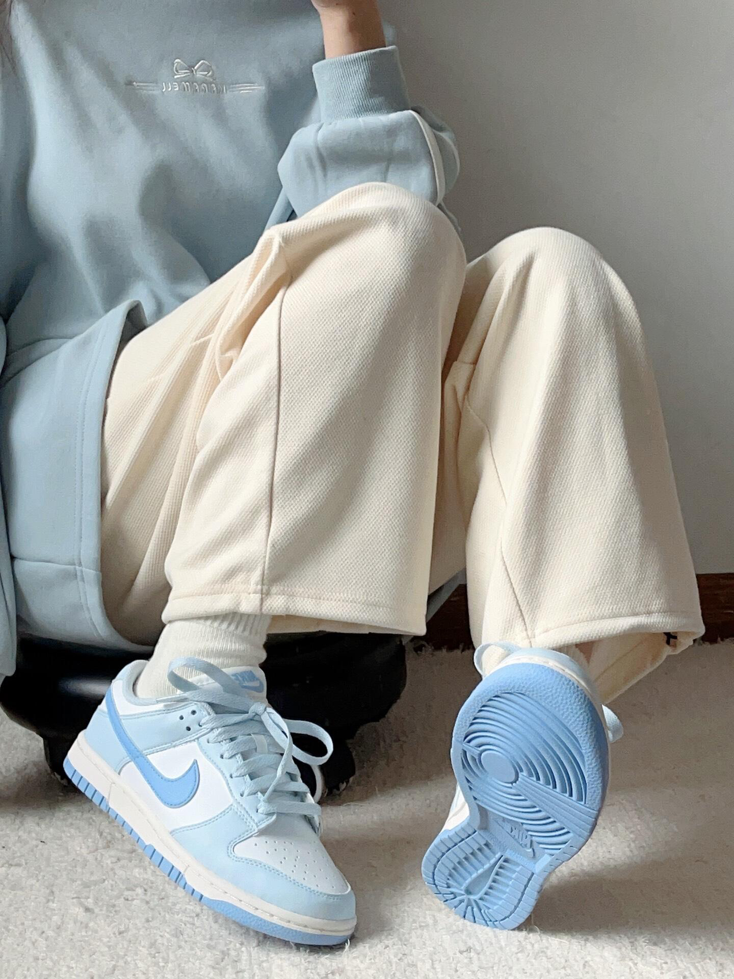 耐克这款蓝白配色板鞋,浅蓝与纯白交织,如春日晴空般清爽。简约设计搭配舒适脚感,无论是搭配休闲裤还是运动装,都能让你轻松成为街头焦点,为日常穿搭增添灵动气息 。