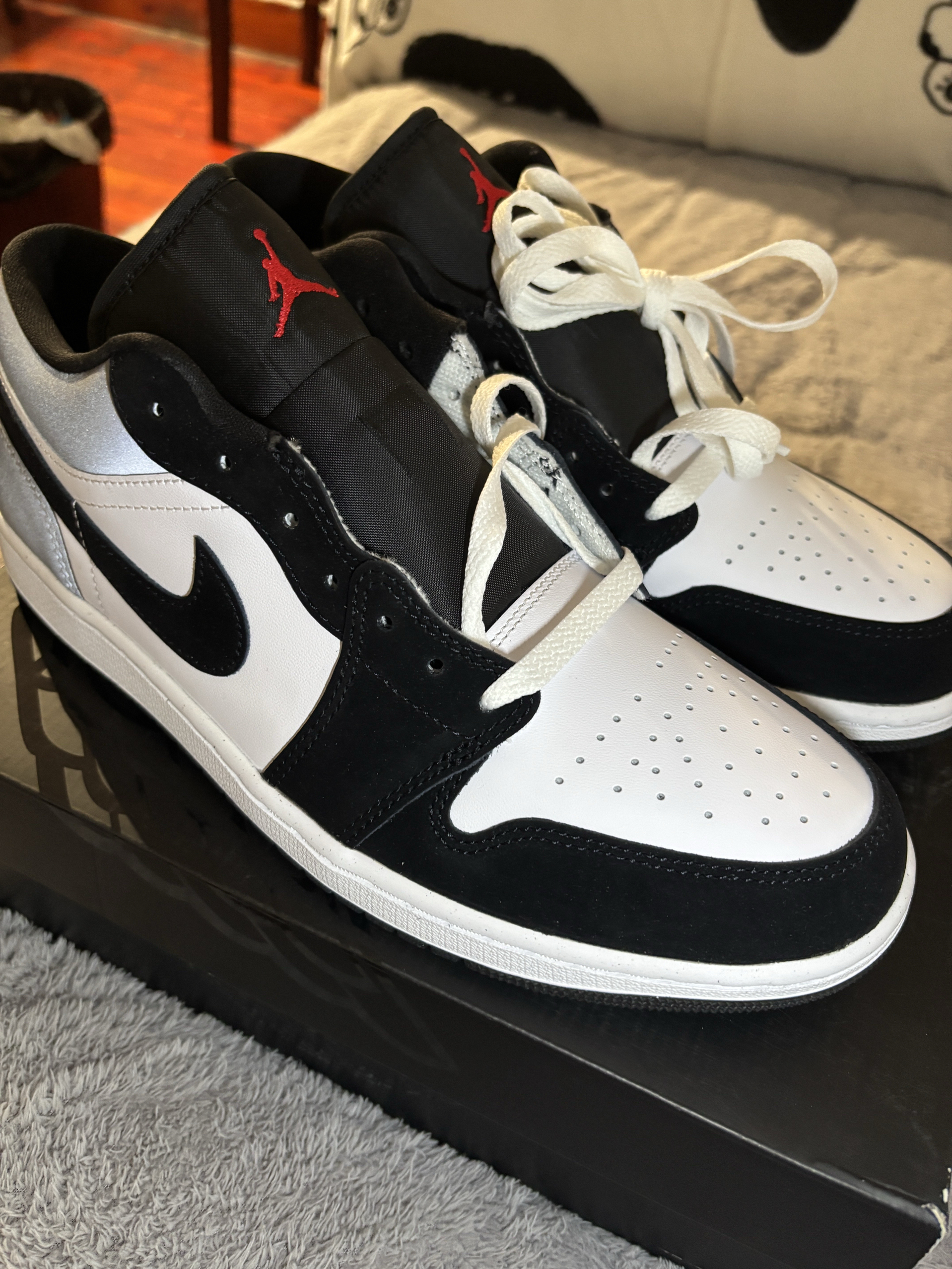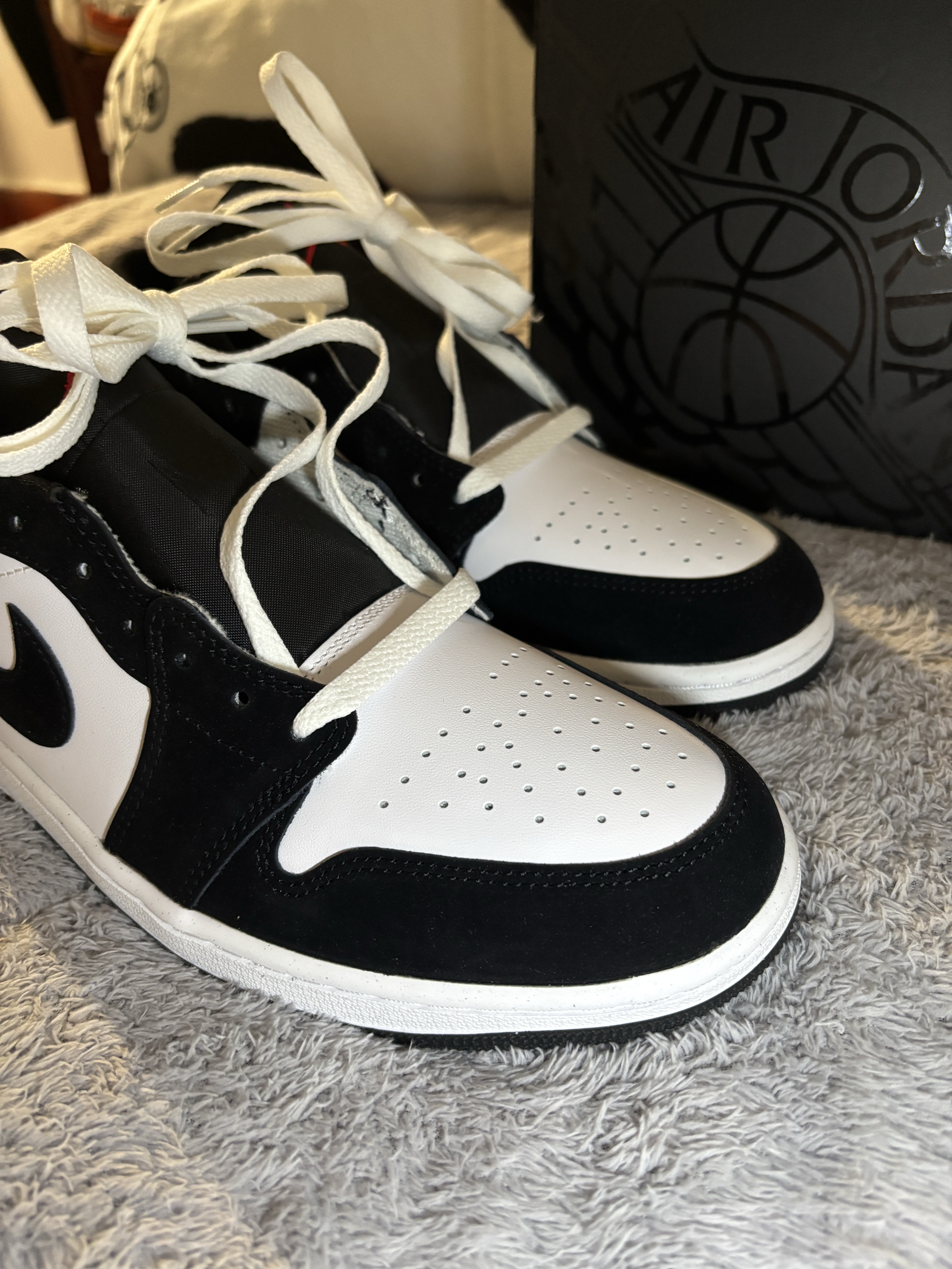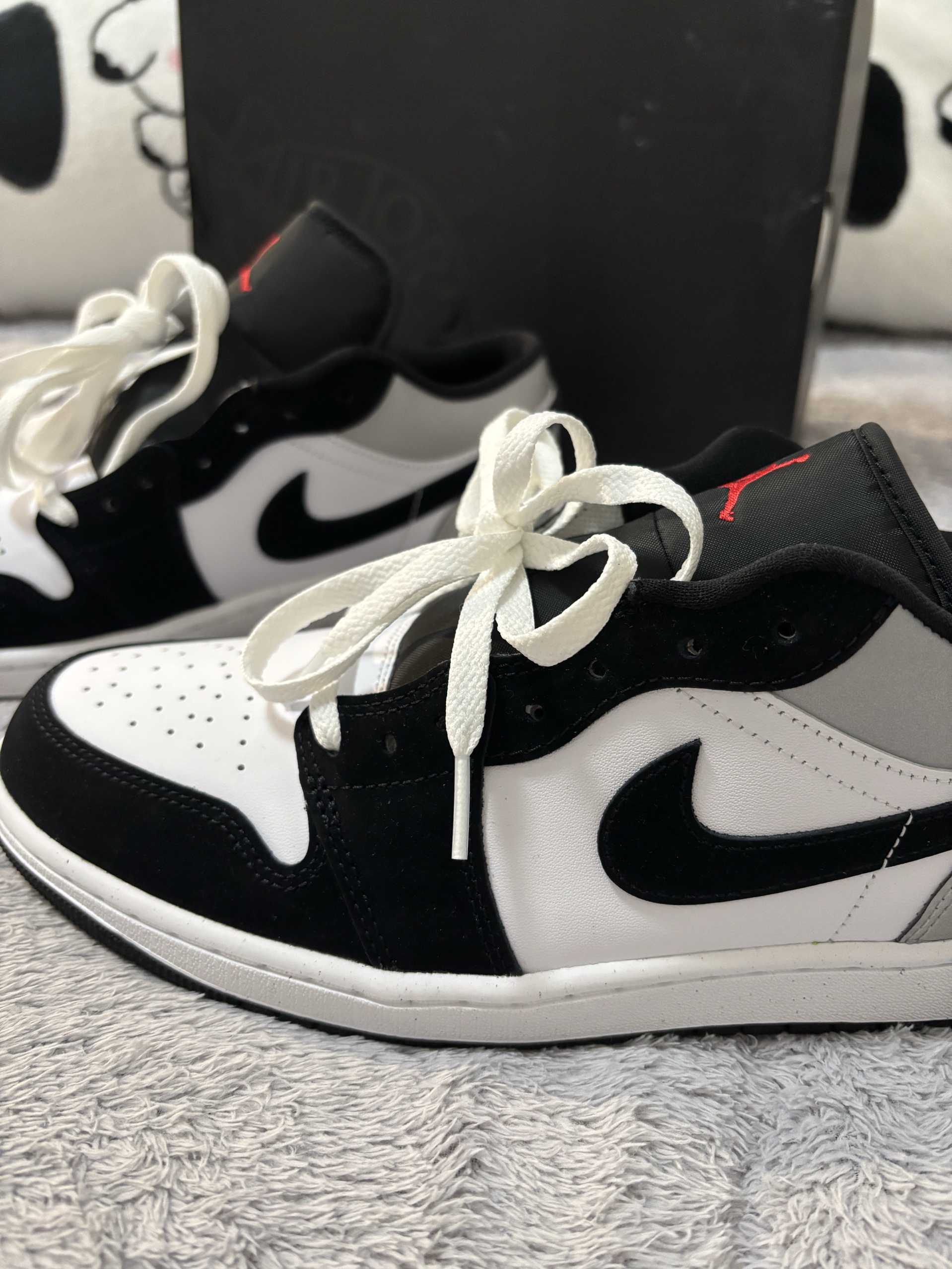 宝子们听我说!这双Air Jordan 1低帮黑白配色真的绝了刚拆箱就被这经典熊猫配色暴击——黑色荔枝纹皮革+纯白鞋身,随便搭条阔腿裤都像行走的潮玩手办[哇] [爆炸]三大闭眼入理由: 1️⃣ 脚感像踩云朵!偷偷说比普通AJ1软[嘘](后跟气垫升级过,暴走一整天都不累脚) 2️⃣ 鞋底纹路超能打!上周下雨天穿它去东单野球场,急停变向完全不打滑...