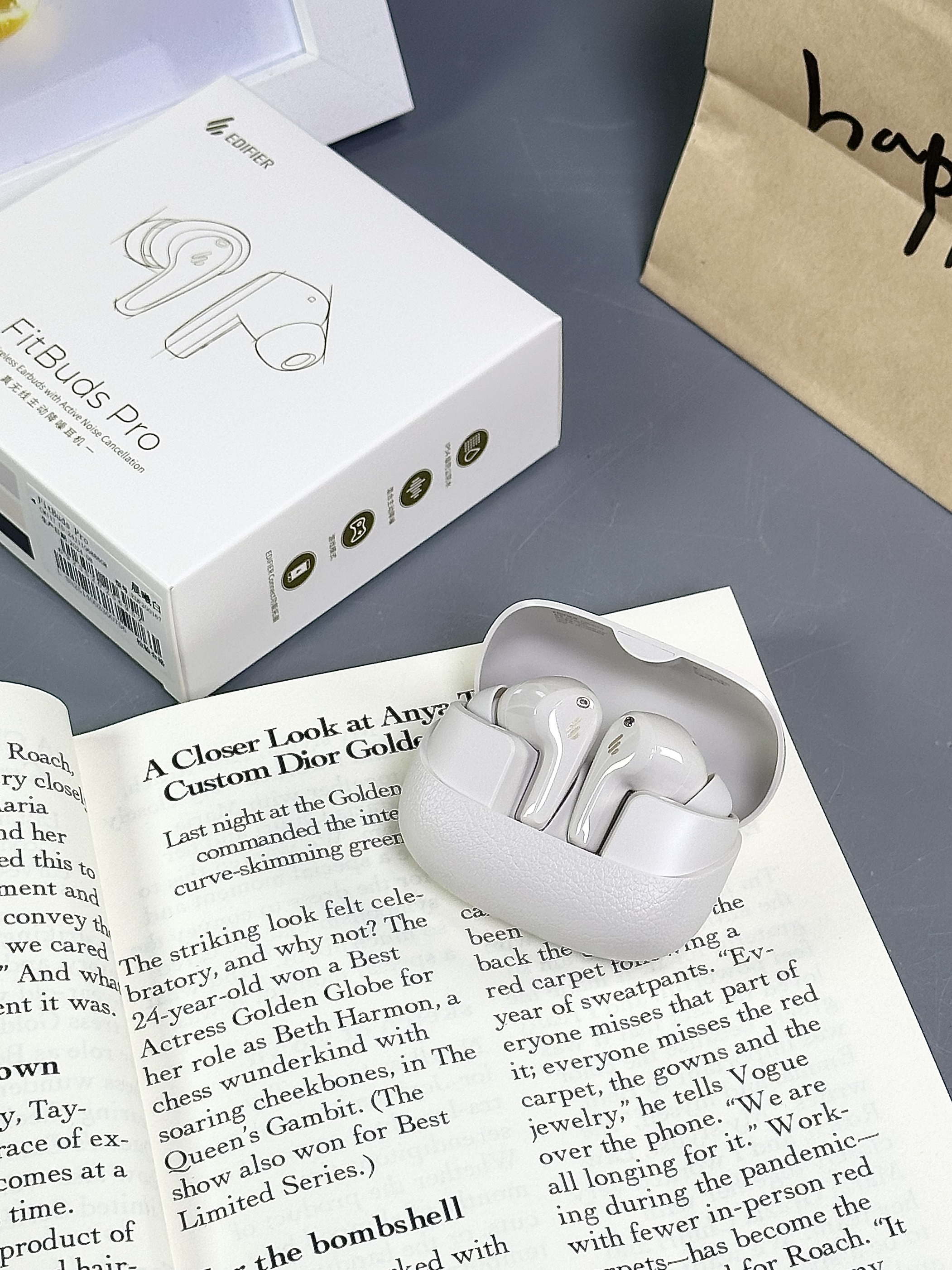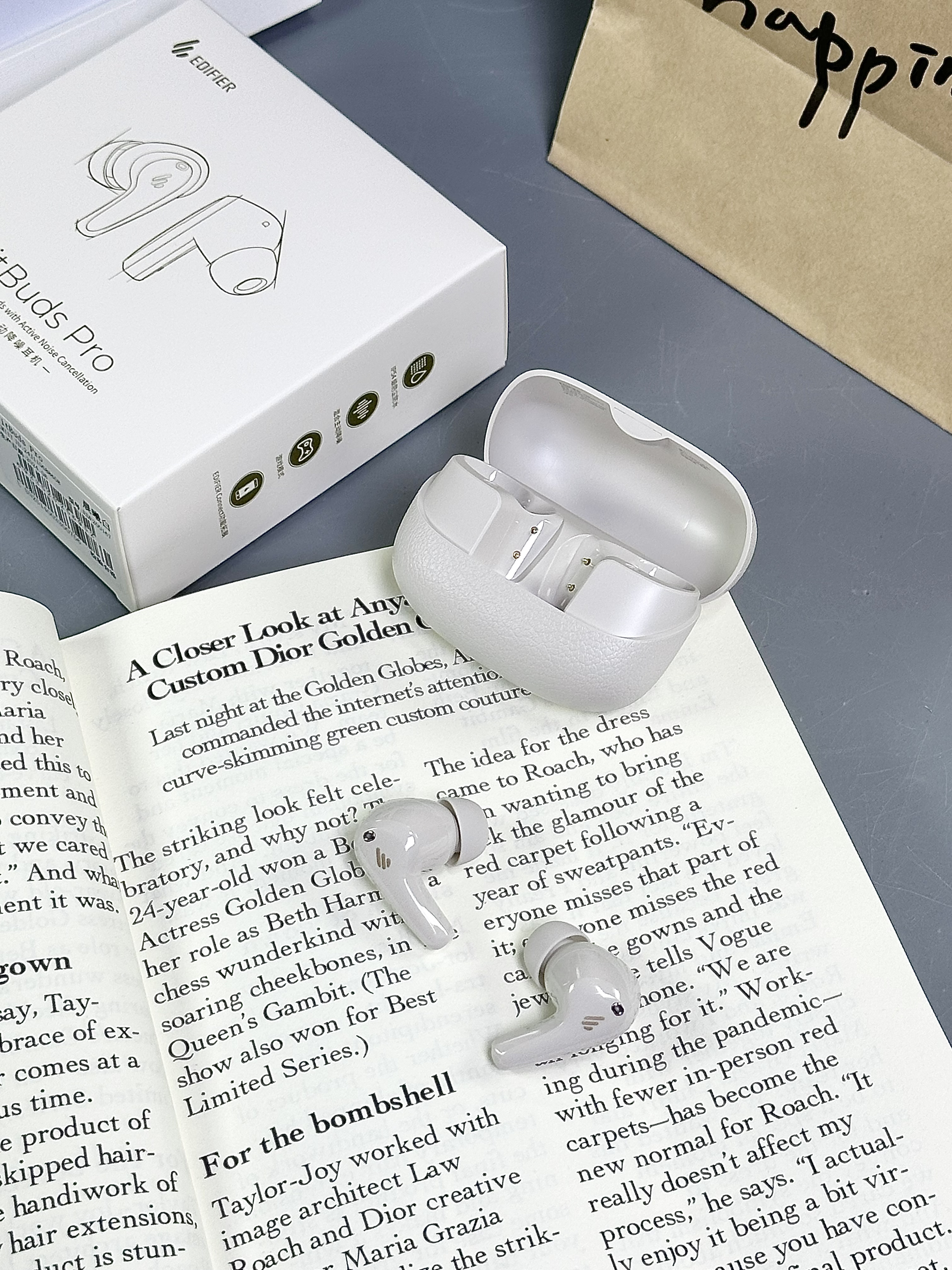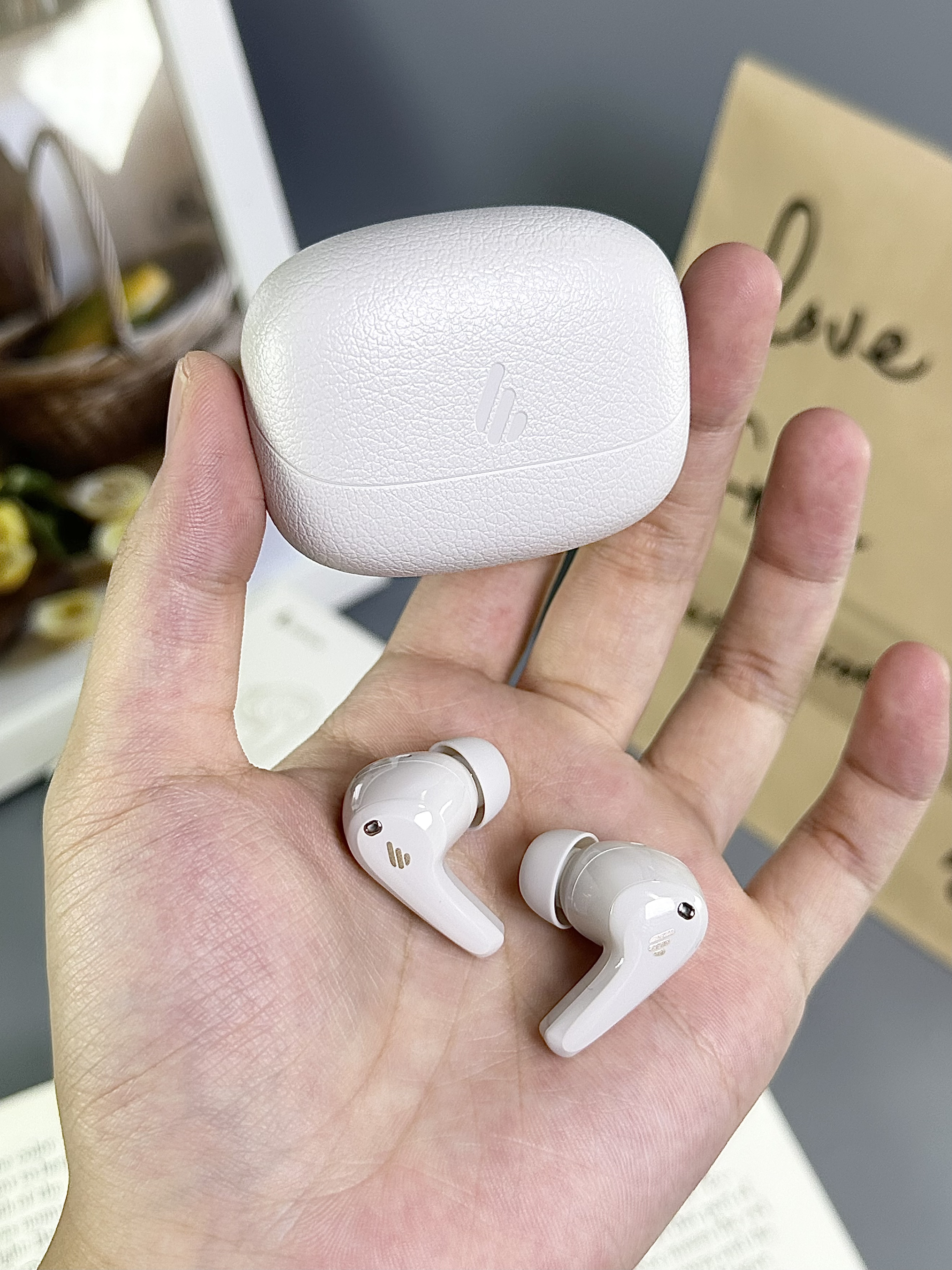 就是漫步者家滴这款耳机啦 白色看起来很经典 上面的纹路清晰可见 小巧的一个 出门携带蛮方便的 半入耳式的设计戴在耳朵上蛮舒服 音质也hin棒 有种身临其境的感觉~ 降噪好到戴上它整个世界都安静了 谁懂!