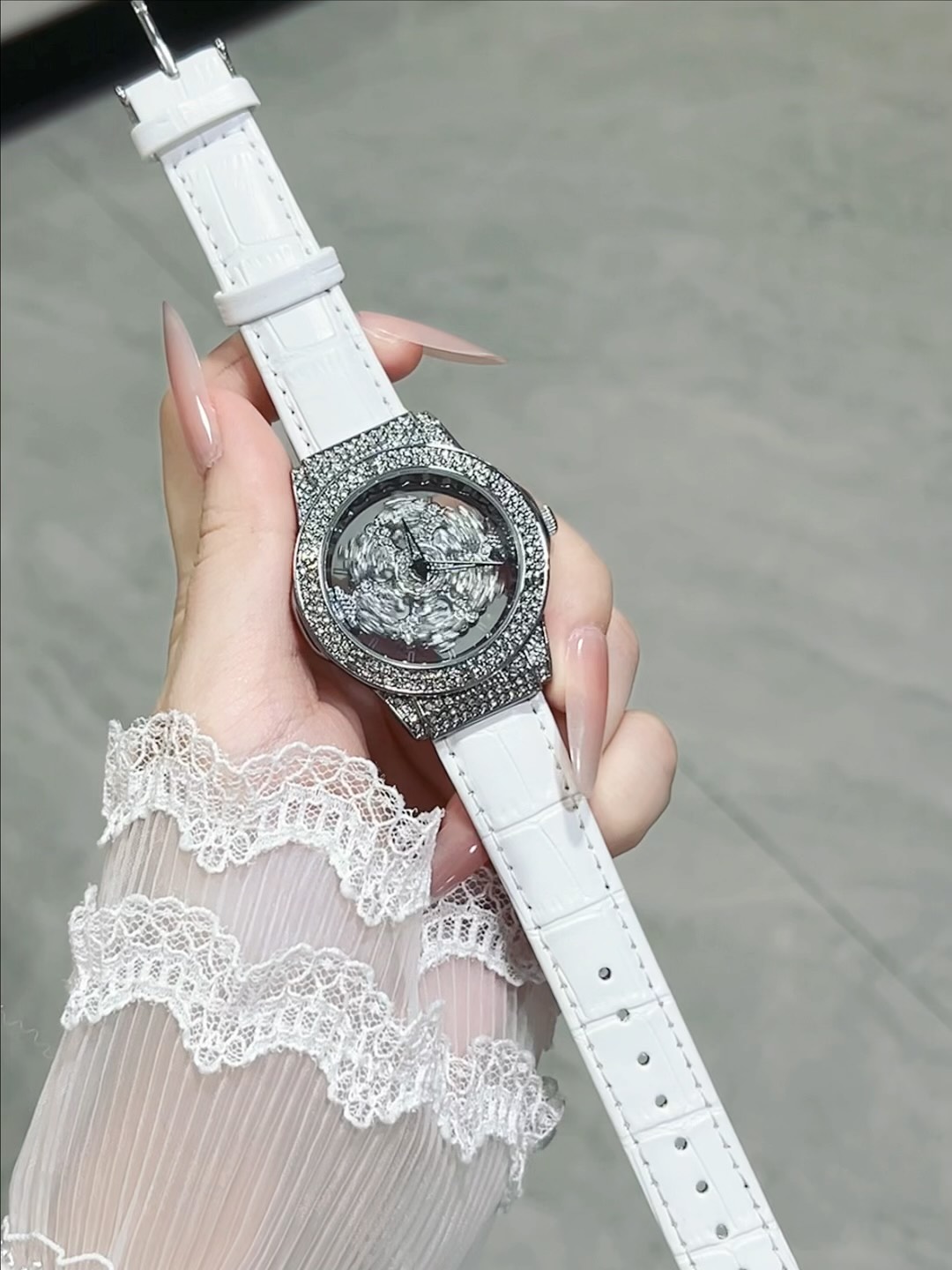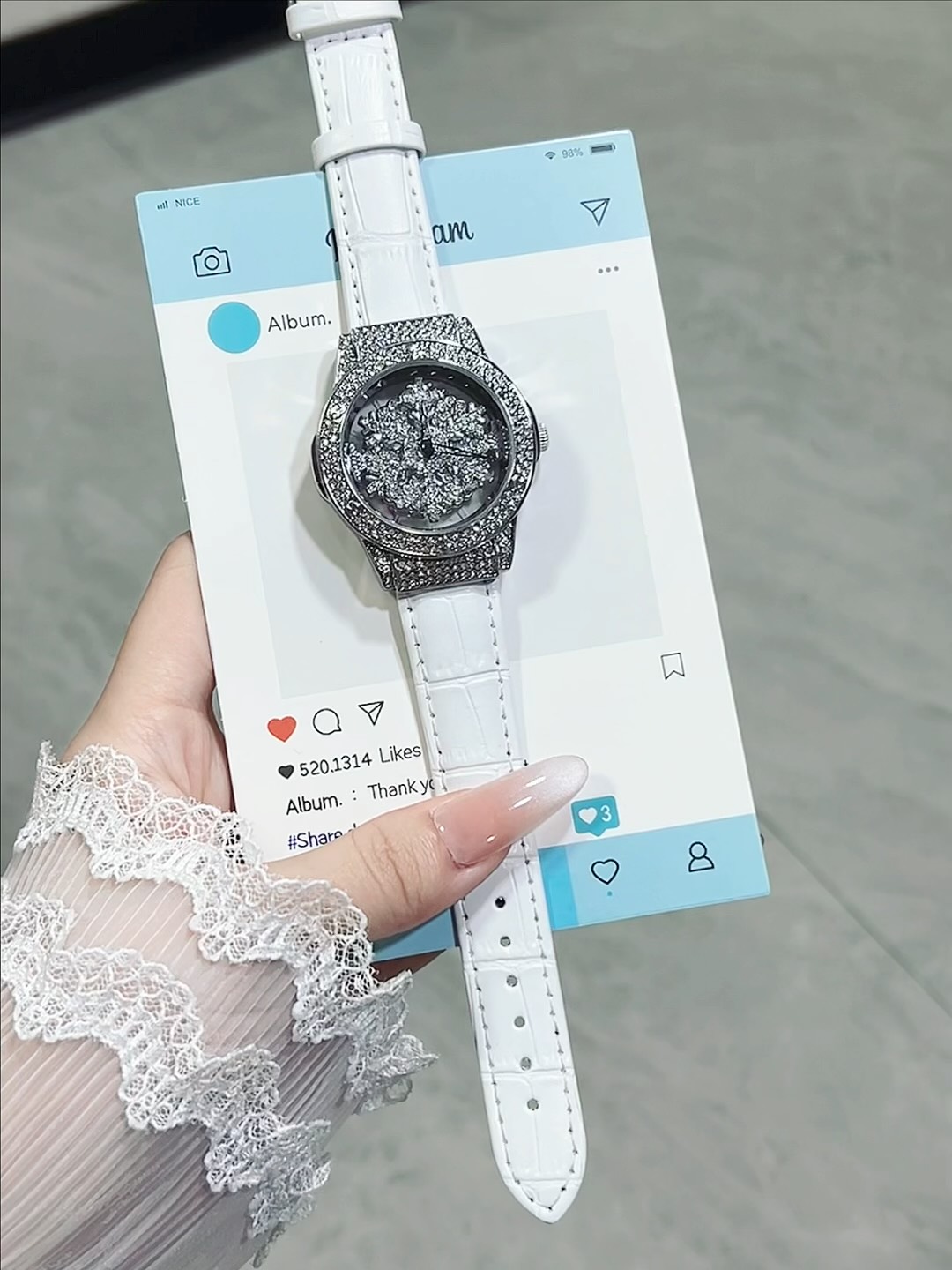 💛挖到一款满钻雪花手表 有点特别耶 镶满钻的表盘bulingbuling的✨ 里面的五星芒还会转耶好灵动 白色白带软软的 戴着蛮舒服滴 🧡自戴或送礼都是不错滴选择哦~ (图源网络侵删)