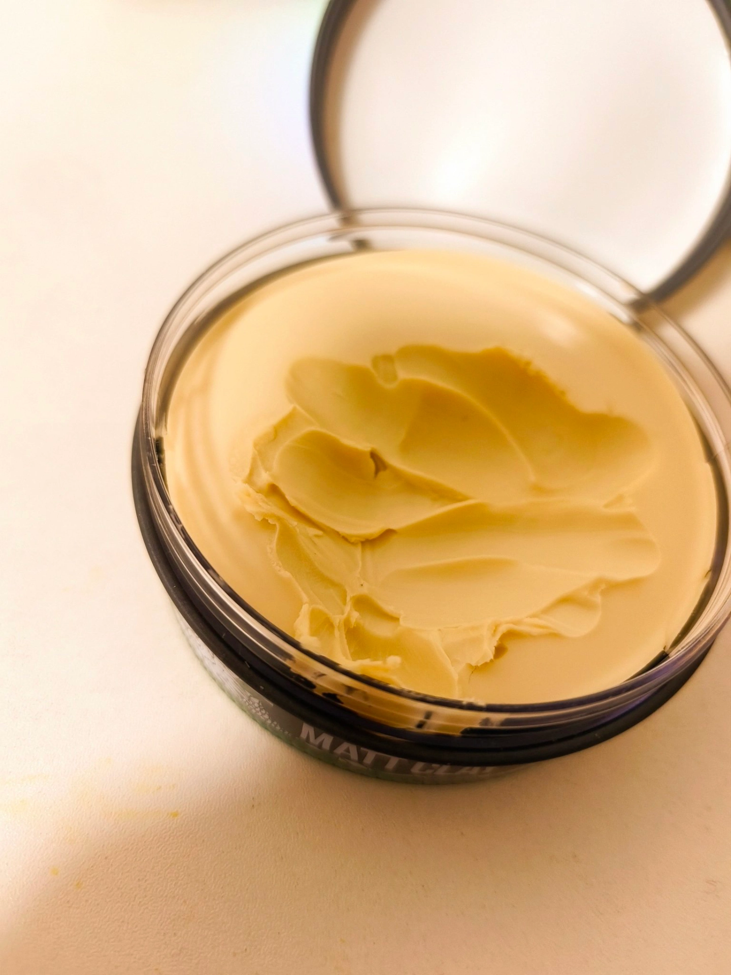 慢干型发泥,质地中等,味道有股檀木香不刺鼻,支撑力也在中等水平,这种干度和支撑力就比较适合手笨的新手朋友们,易于调整细节,基础款发型没问题,日常出门花半分钟时间调整下头发,整个人气场都是不一样的。