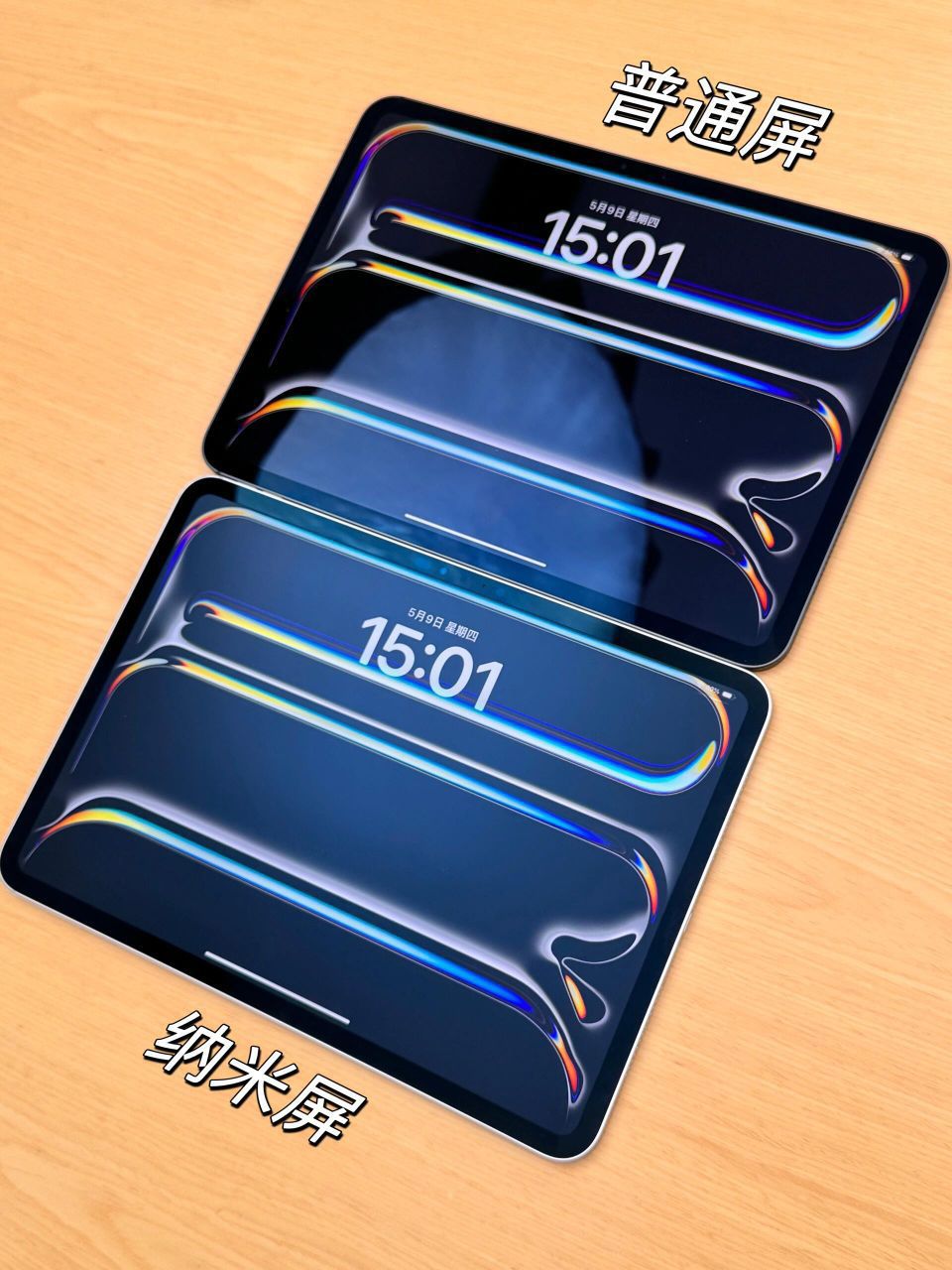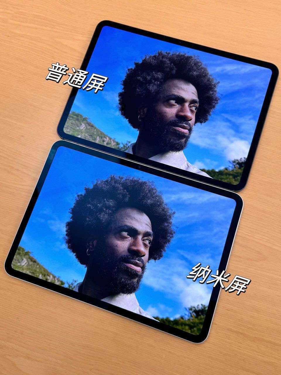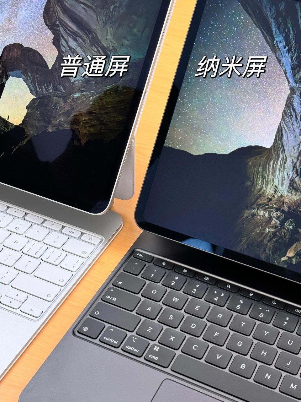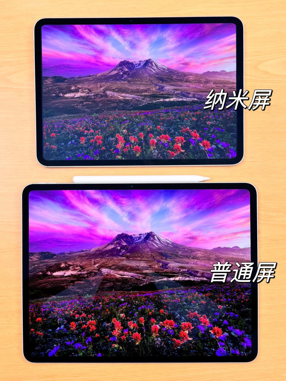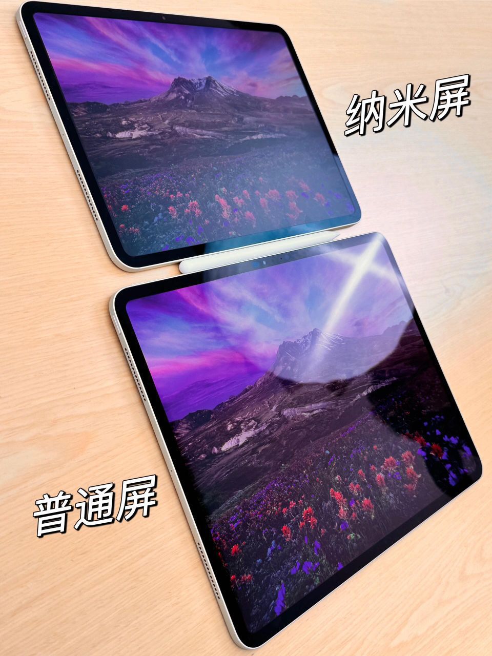 iPad Pro这次超有看点的就是它推出了两个屏幕: 1⃣双层串联OLED玻璃,就是普通屏💁🏻♀对比度很大,颜色艳丽,黑色真的很黑😅但是由于太光滑会反光💡 ✅适合平时喜欢看剧/看电影/打游戏的家人们! 2⃣双层纳米纹理玻璃,就是纳米屏💁🏻♀有点像画壁电视或者类纸膜的显示效果❗因为是漫反射,所以屏幕不会反射灯光💡但对比度比OLED屏低不少,黑色看起来灰灰的! ✅适合有画画/写字/剪辑/修图/设计...