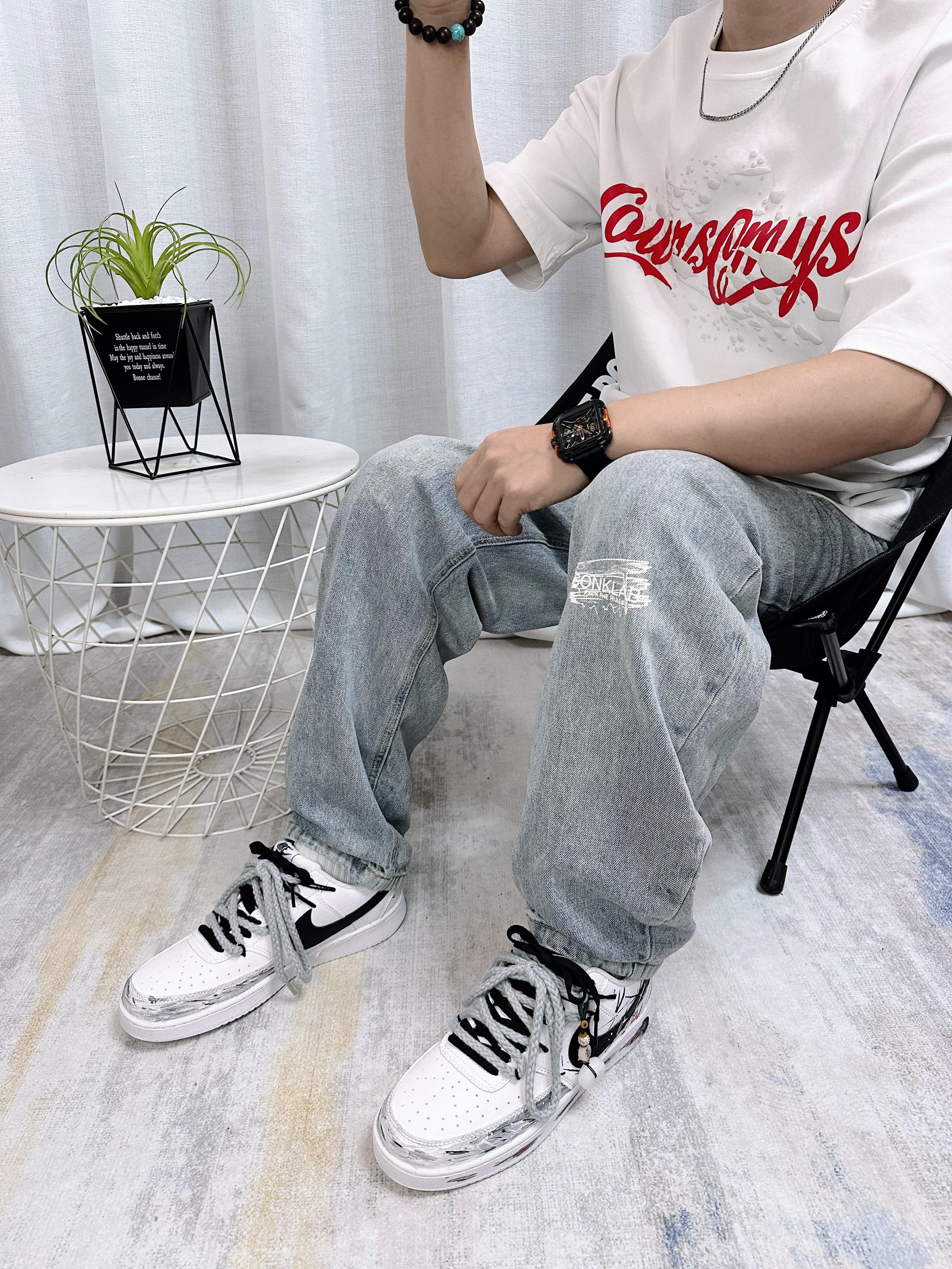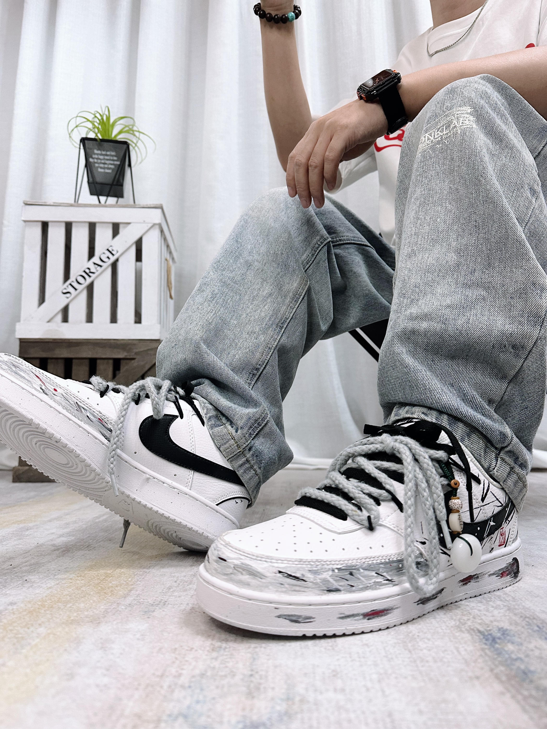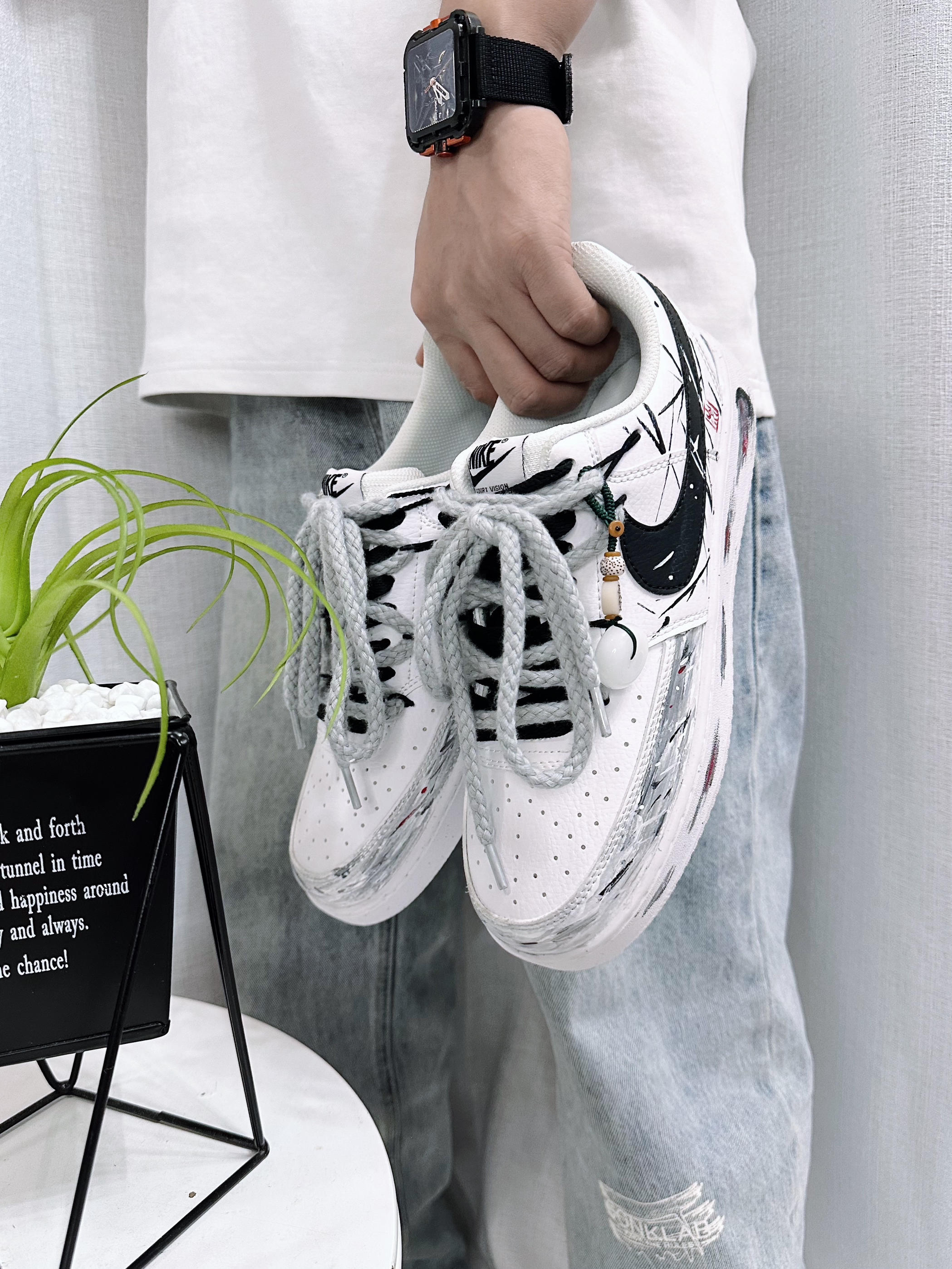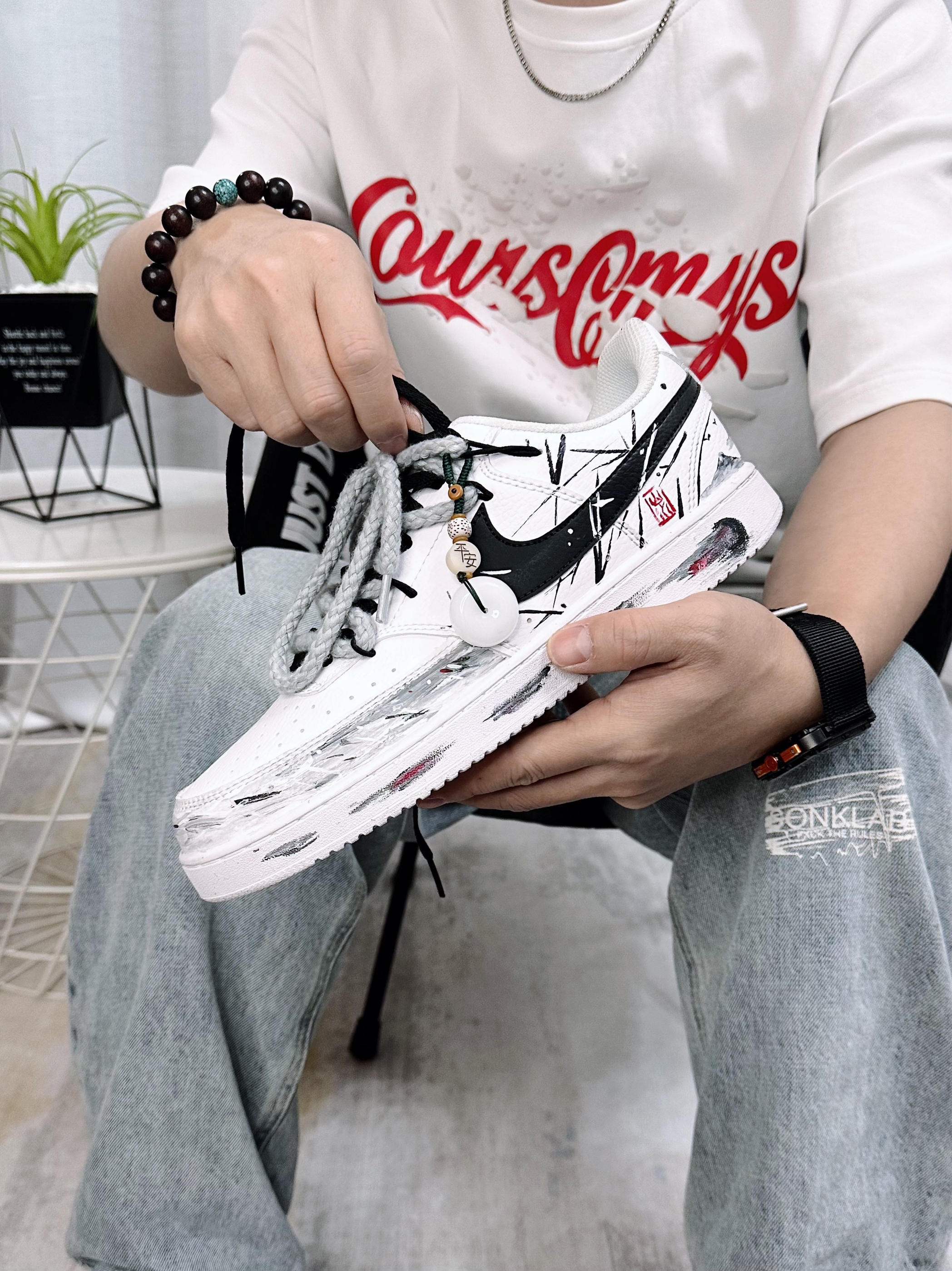 NIKE COURT VISION - 今天上脚的是这双定制款的NIKE板鞋,属于比较经典的板鞋鞋型,我感觉还是蛮好穿的,不太挑脚型;整体是白黑色调,加上少量红色点缀,比较简约,很好搭配; - 我觉得整体细节还是蛮不错的,侧边是我比较喜欢的竹叶元素,后跟则是水墨山水,也有增加红色印章细节,加上平安扣的装饰挂件,真的蛮像把国风画卷穿在脚上,氛围感拉满,上脚有种国风少年的即视感,真的包帅的!