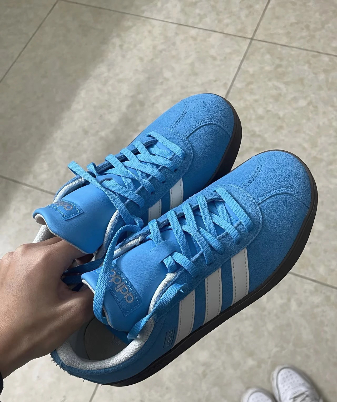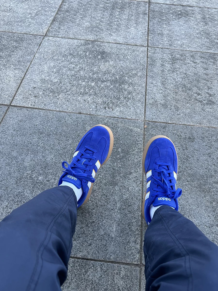 这双阿迪达斯运动鞋真的太赞了!蓝色鞋面超吸睛,经典三条纹设计时尚又百搭。麂皮材质质感满满,脚感舒适,走路轻便不磨脚。鞋底抓地力强,日常出行或运动都很合适。入手不亏,强烈推荐!