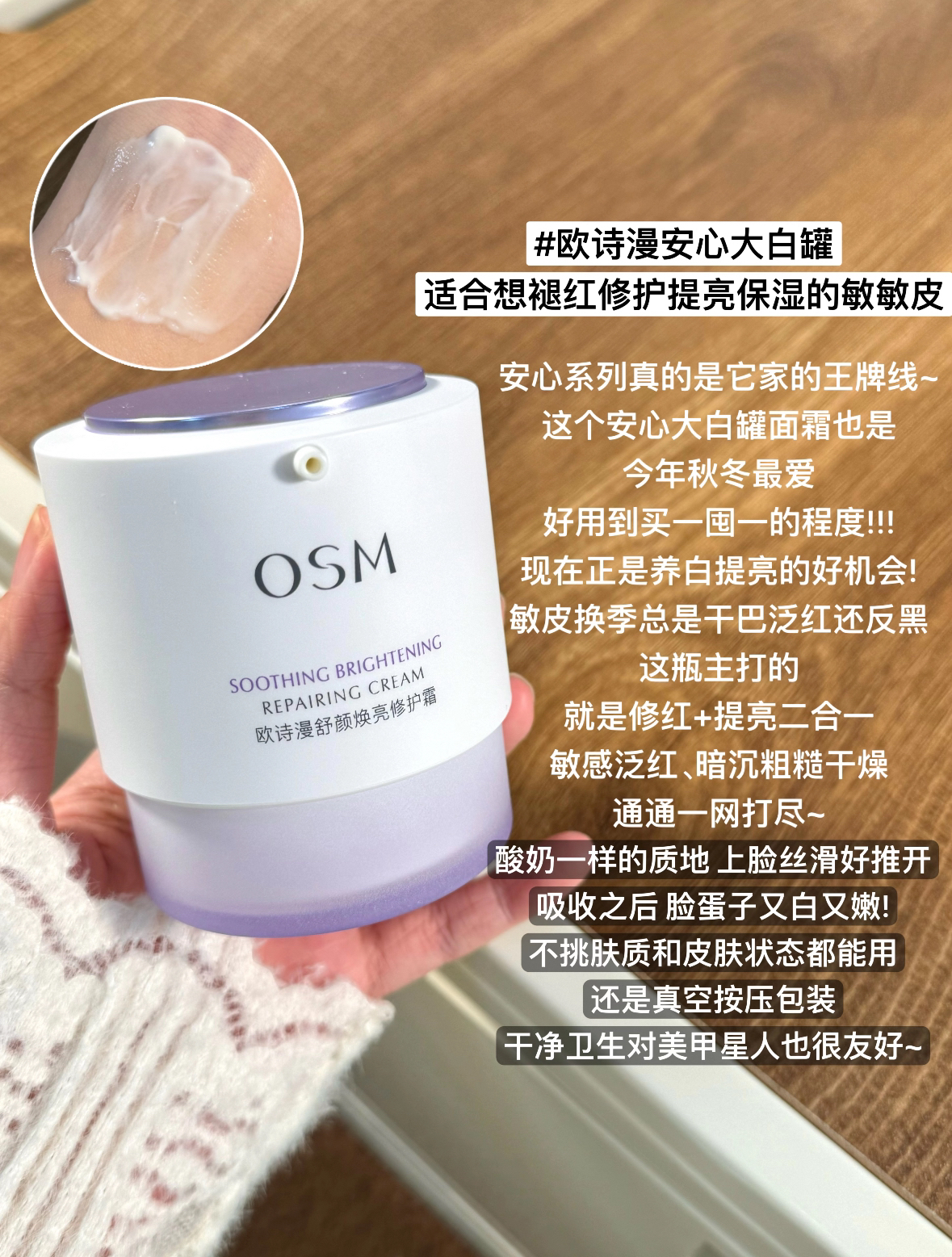 整理一期我的换季爱用面霜~真诚分享 理性种草!!! • 欧诗漫安心大白罐 适合想要褪红修护、提亮保湿的敏敏皮全质都适用 珀莱雅源力面霜 适合25+有抗时光需求的干敏皮、干皮泊本高保湿面霜 适合只要基础保湿效果的学生党 • 优色林舒安霜 适合痘敏皮、全肤质可选 •丝塔芙思维面霜 适合干敏皮、干皮、油痘皮远离神秘博士美白面霜 适合想改善粗糙暗黄的健康肤质