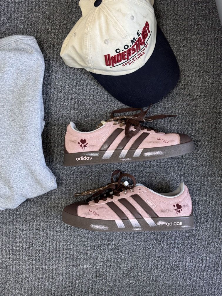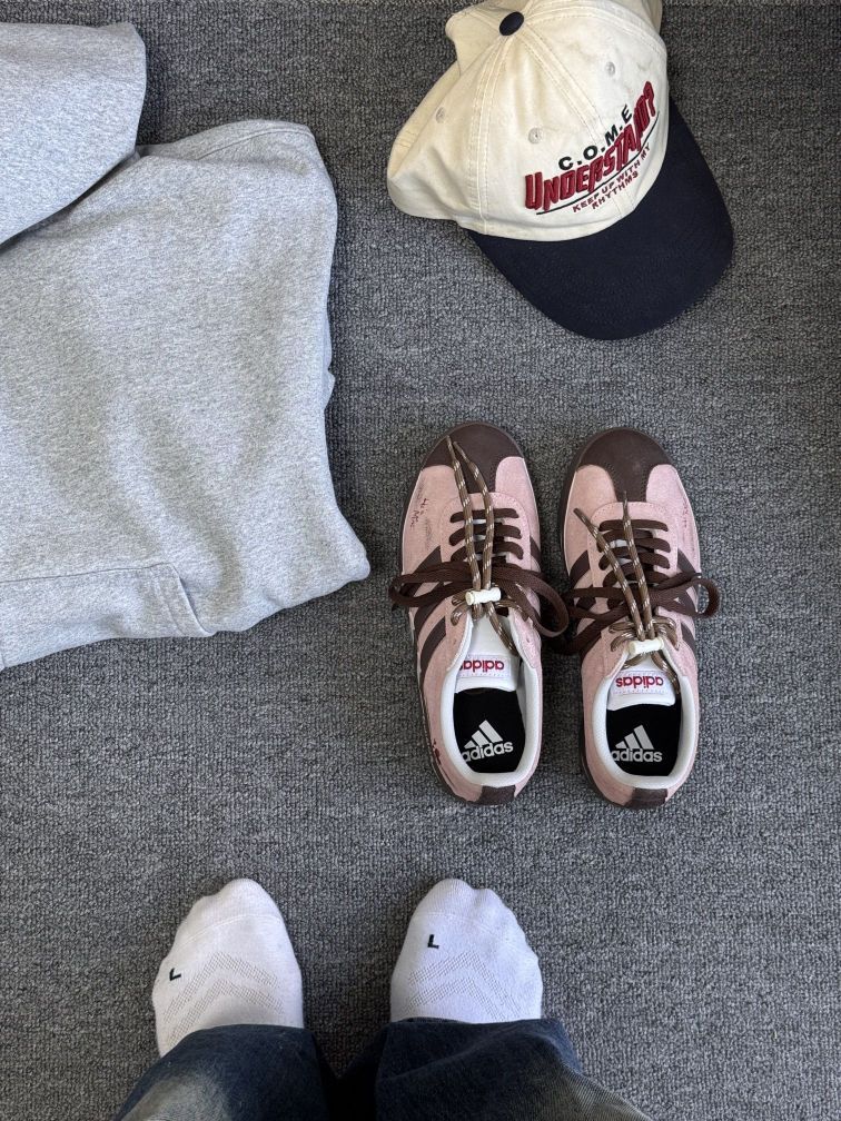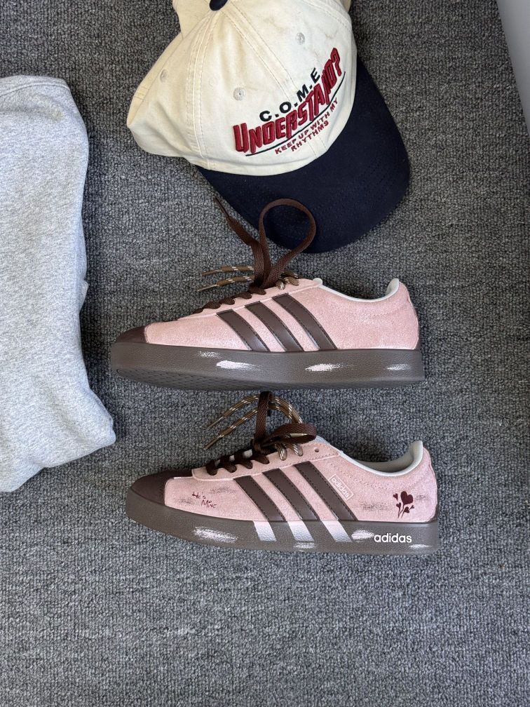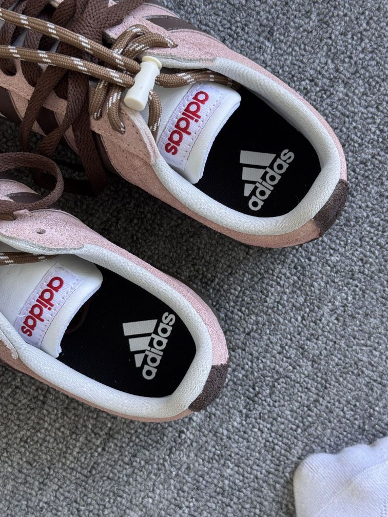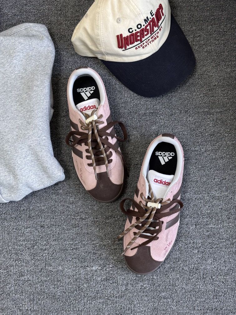 我太爱穿这双阿迪德训鞋了 当属鞋柜里好看好穿又好搭的No.1!绒面做旧的浅粉鞋面加上棕色厚底让圆圆的德训看起来沉稳些许