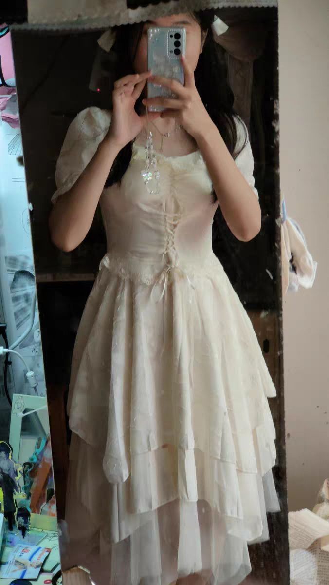 宝贝们,还在寻觅能让你美成童话主角的仙裙吗?这条洛丽塔裙必须拥有姓名! 👗它以温柔米白为底色,恰似被月光亲吻过的云朵,轻柔又浪漫。方领巧妙勾勒出精致颈线,搭配甜美泡泡袖,复古韵味与少女俏皮完美融合,好像一转身就能穿越进中世纪的浪漫舞会。