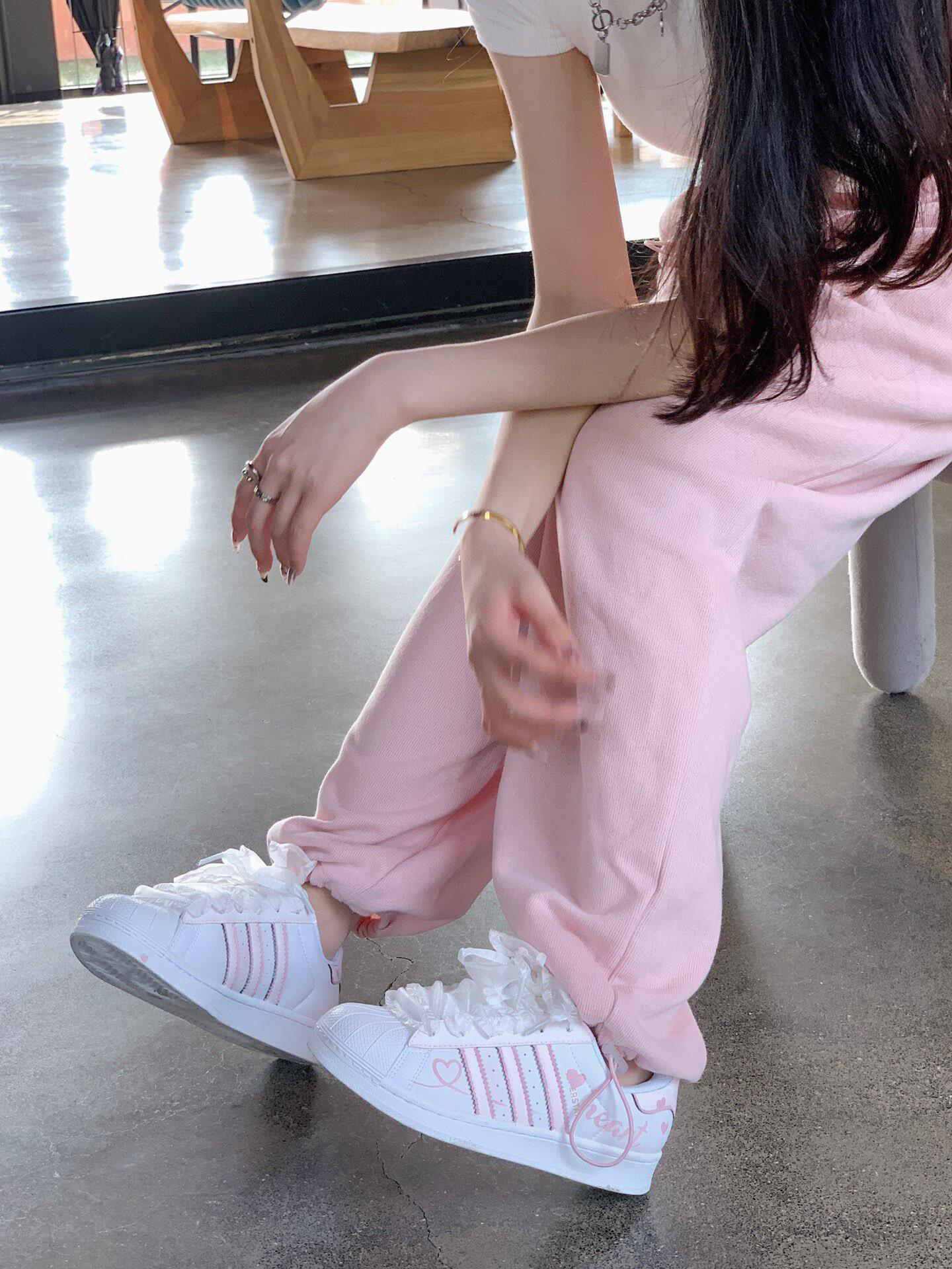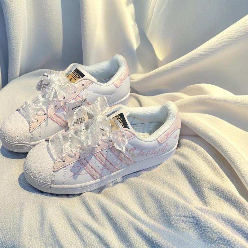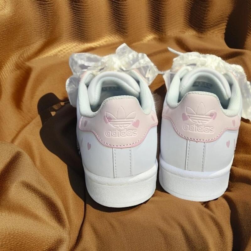 谁能拒绝这双粉色爱心元素点缀的阿迪达斯贝壳头?梦幻的粉白配色,搭配浪漫的蕾丝鞋带,甜美又不失个性。上脚瞬间,元气感爆棚,无论是休闲出街还是运动打卡,都能让你轻松成为街头焦点,释放独特少女魅力 。