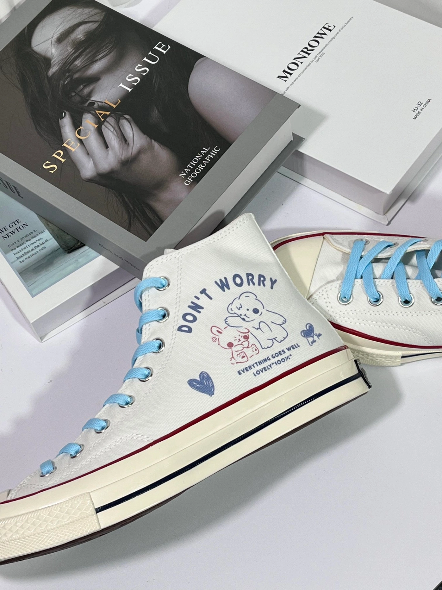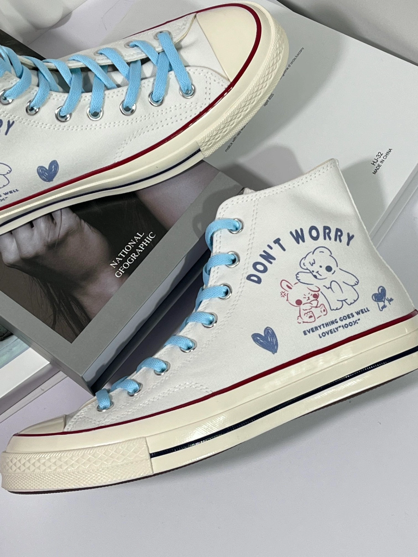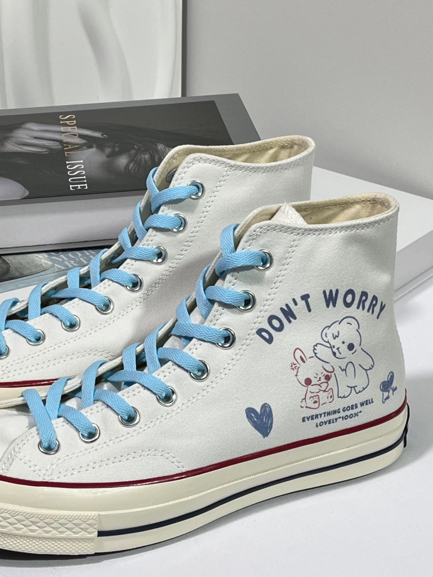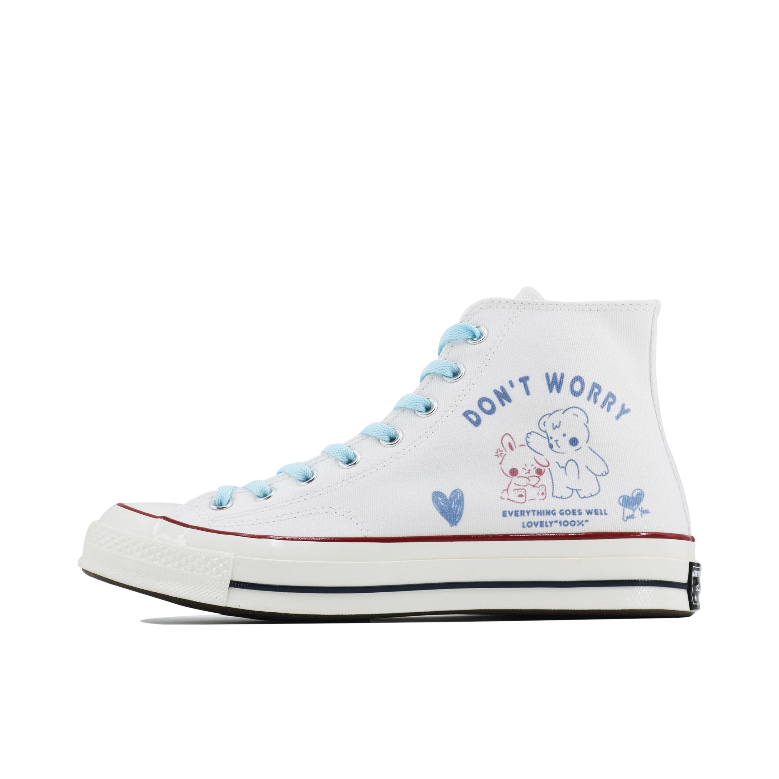 🌸白色鞋面搭配蓝色鞋带,简约时尚又百搭! 🐻鞋面小熊&兔子图案,增添几分可爱温馨~ 💖“DON'T WORRY EVERYTHING GOES WELL LOVELY 100%” 乐观态度,一切美好如初! 👣日常穿搭轻松驾驭,展现独特品味! 💖快来入手这双超治愈Converse高帮鞋, 陪你度过每一个美好瞬间!💖 #这双匡威很难不爱 #SDS定制球鞋 #高邦帆布鞋