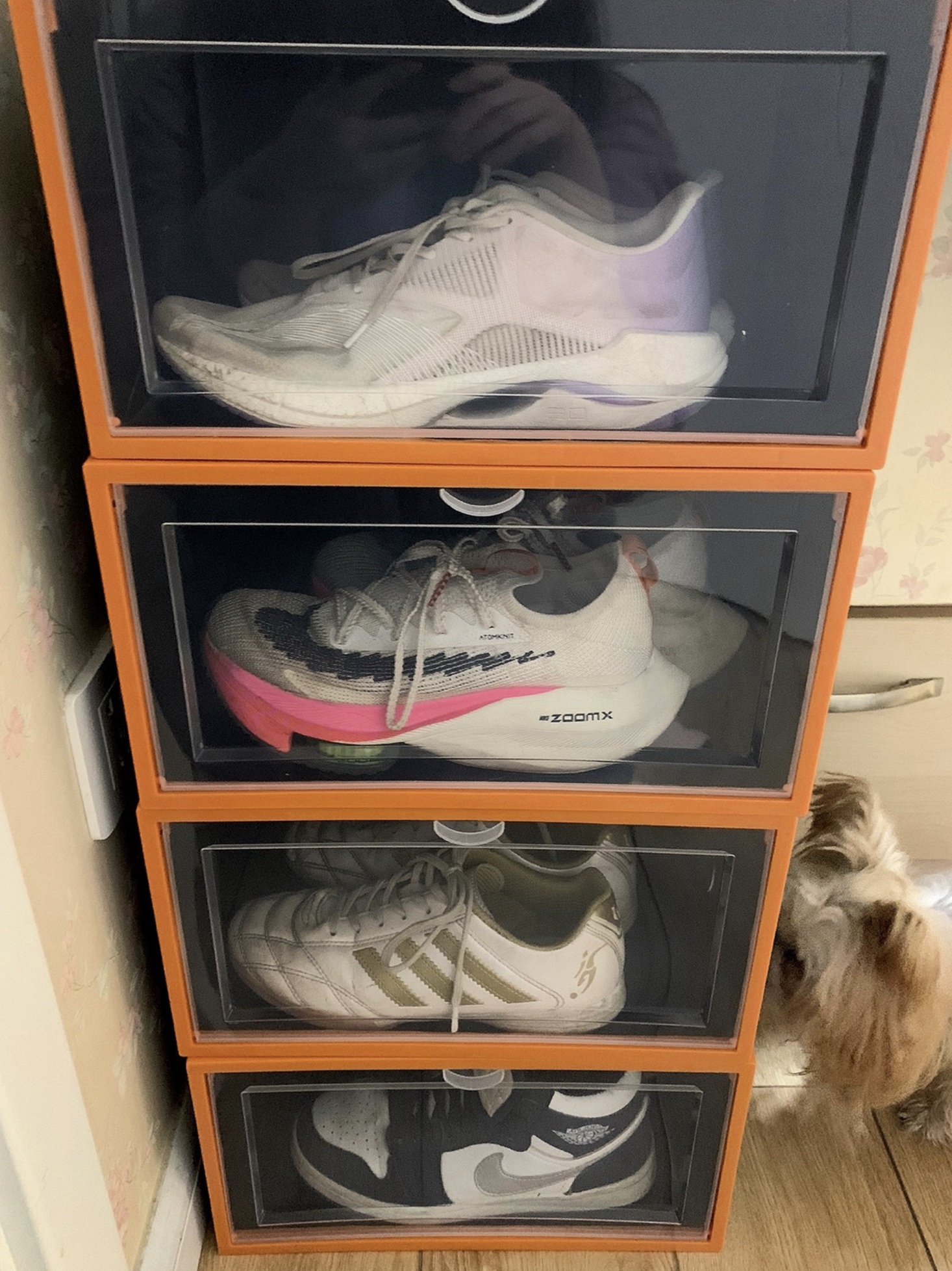 收到快递的时候是扁平的 需要自己折叠 挺简单的 找到技巧很快就装好了 鞋盒的上下左右的边边上是有凸出和凹进的 也就是可以把鞋盒卡在一起摞整齐 但我懒得调整了 堆的马马虎虎 鞋盒很大 小号就可以放进去npy45码的大鞋 刷干净放进去就不会落灰了 不用担心会捂发霉啊什么的 鞋盒的一头是带孔的很透气 另一头是盖子 可以抠那个圆圈打开 要拿鞋的时候不用动盒子 直接抠开盖子拿就行了 目前使用来看我觉得蛮好的...