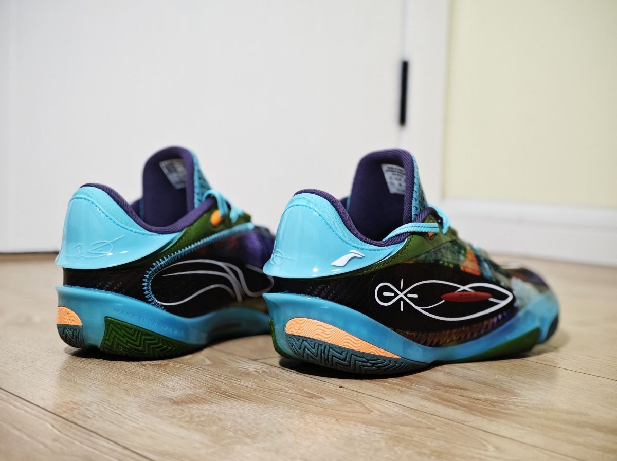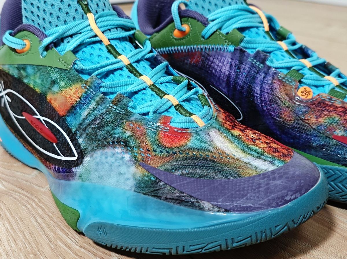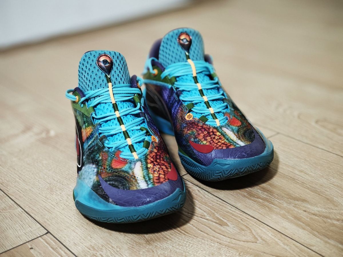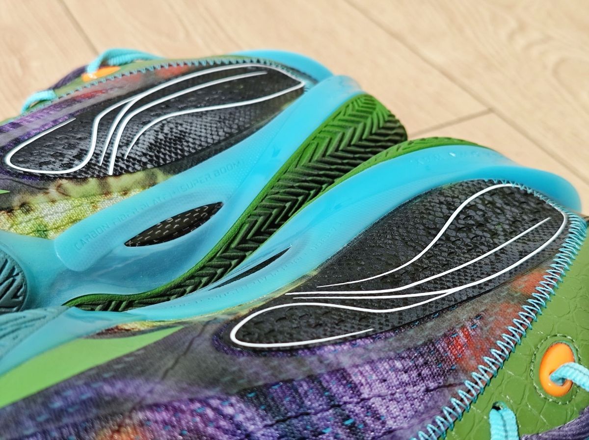 韦德之道808 5ULTRA变色龙配色,质感超级棒,鞋面是变色龙的纹理,内外侧LOGO的地方还有鳞片一般的质感,后跟部分碳纤维质感也很赞。 脚感也是前所未有的弹,实战了一个多小时,简单说一下感受:包裹感、鞋脚一体性、灵活性都很不错,中底前掌超级软弹,后掌缓震也很不错。 这代真的很不错!