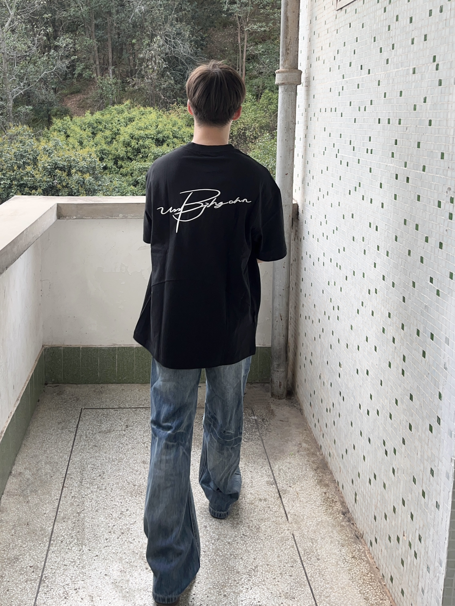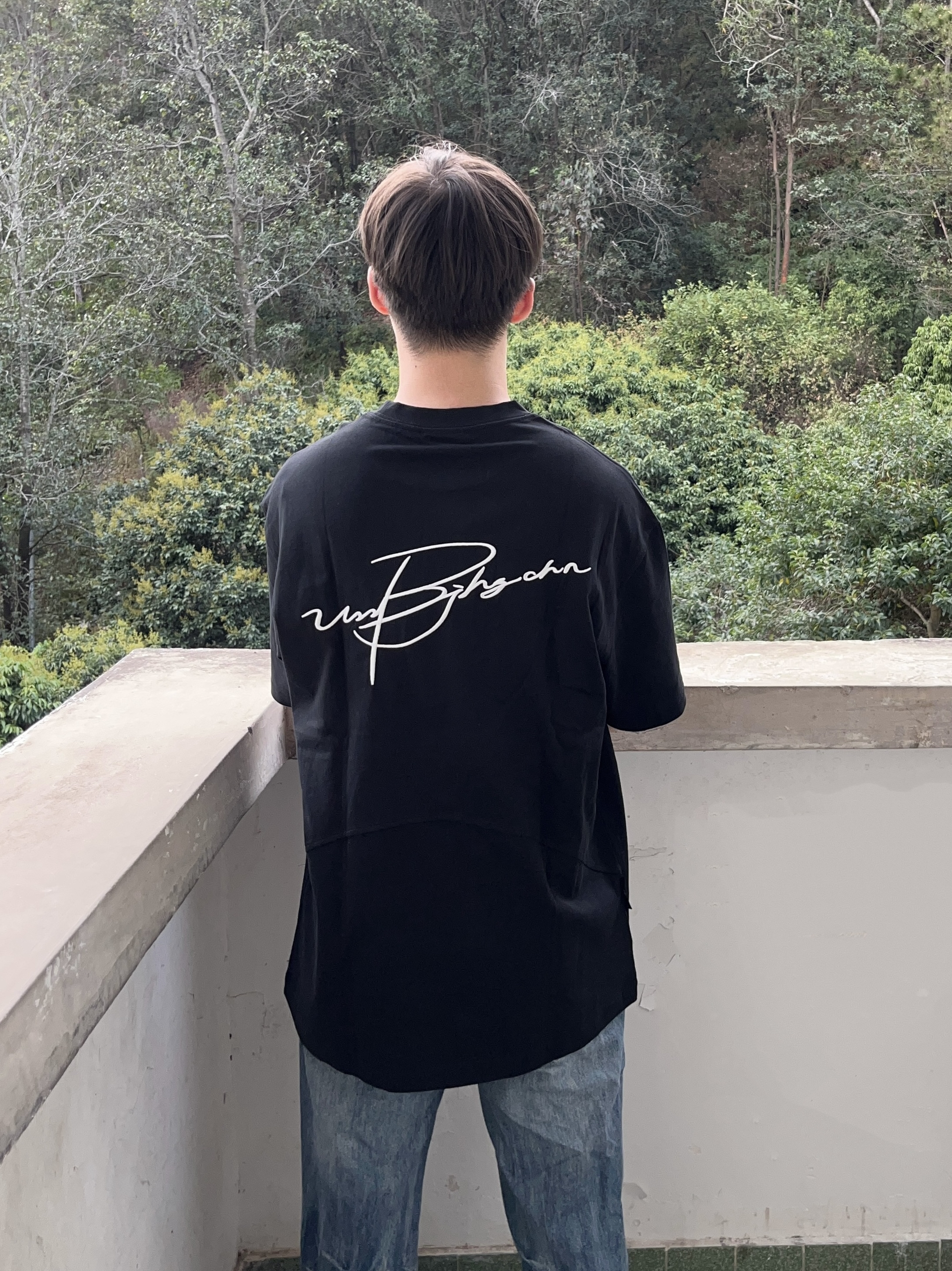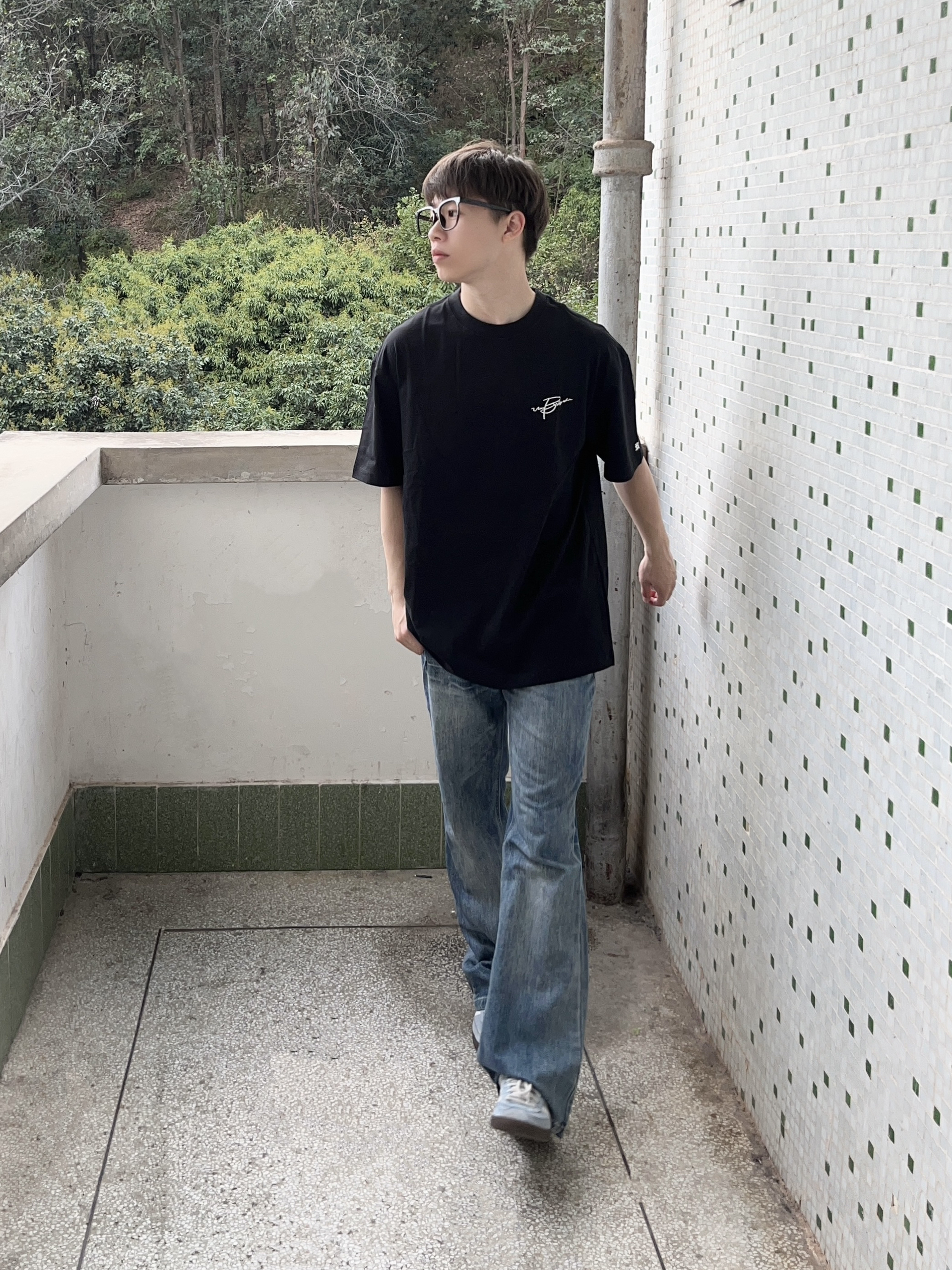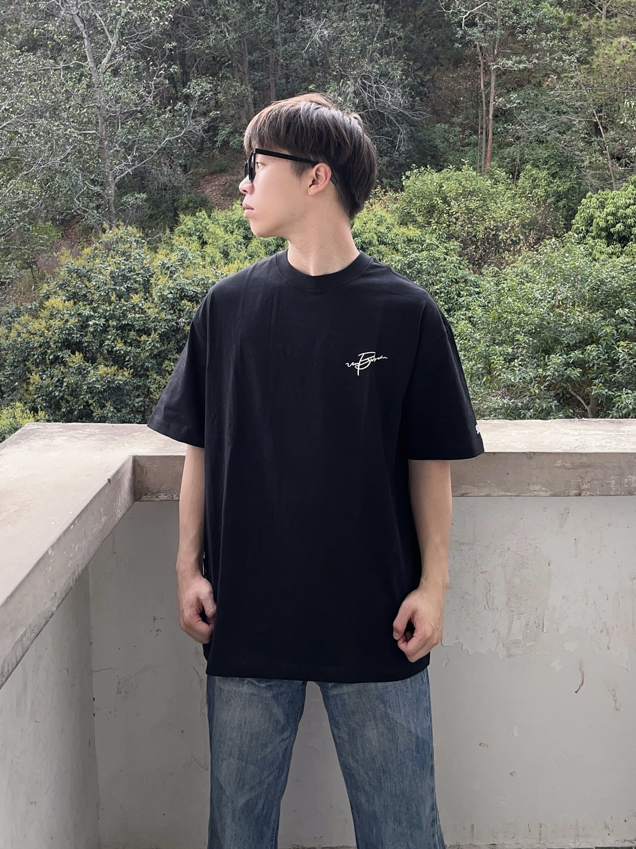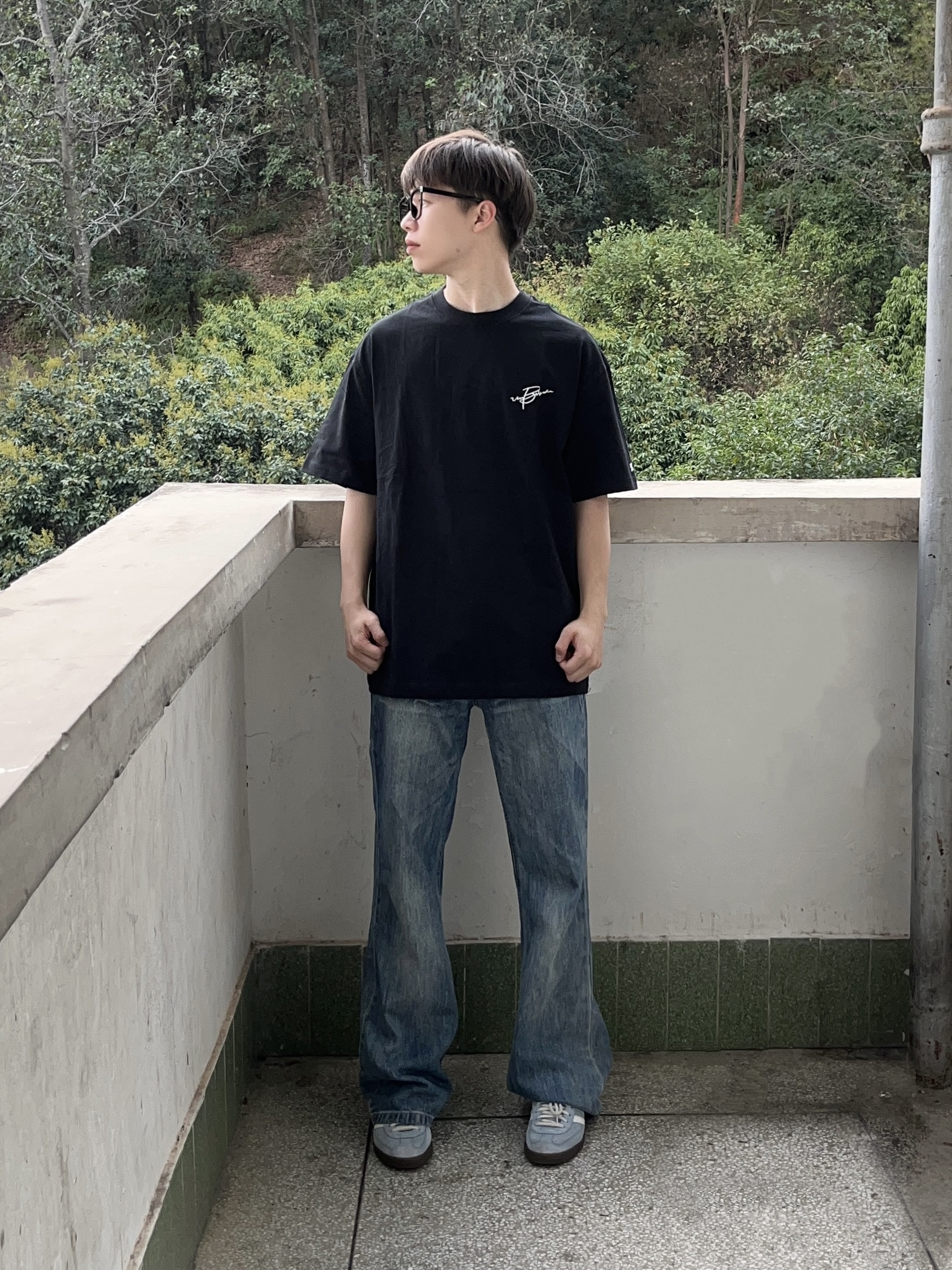 今日份穿搭分享look👀 衣服是 BJHG 的炭黑色美式短袖👔 花体刺绣logo印花潮酷时尚 版型宽松显瘦 面料也很适合春夏🍃 再搭配一条蓝色直筒牛仔裤👖 以及上脚一双经典阿迪德训鞋 一套搭配下来 户外出行🚶休闲又百搭