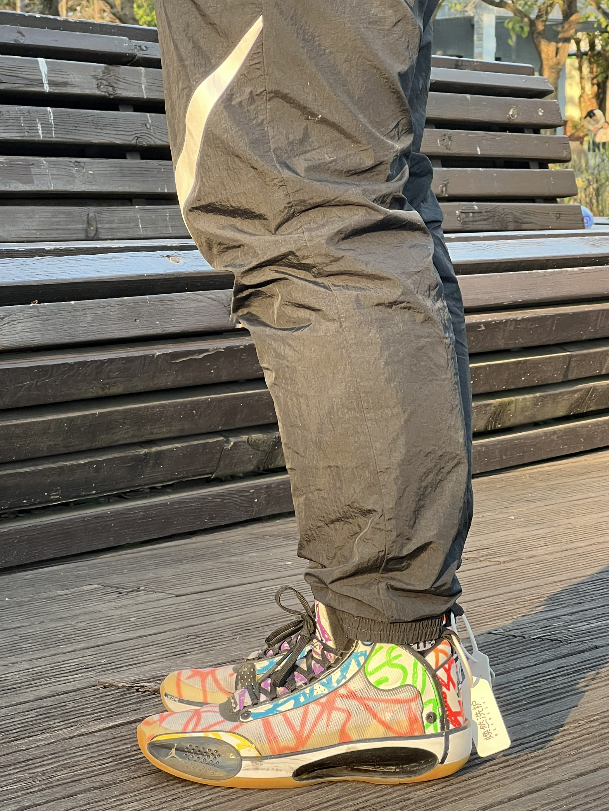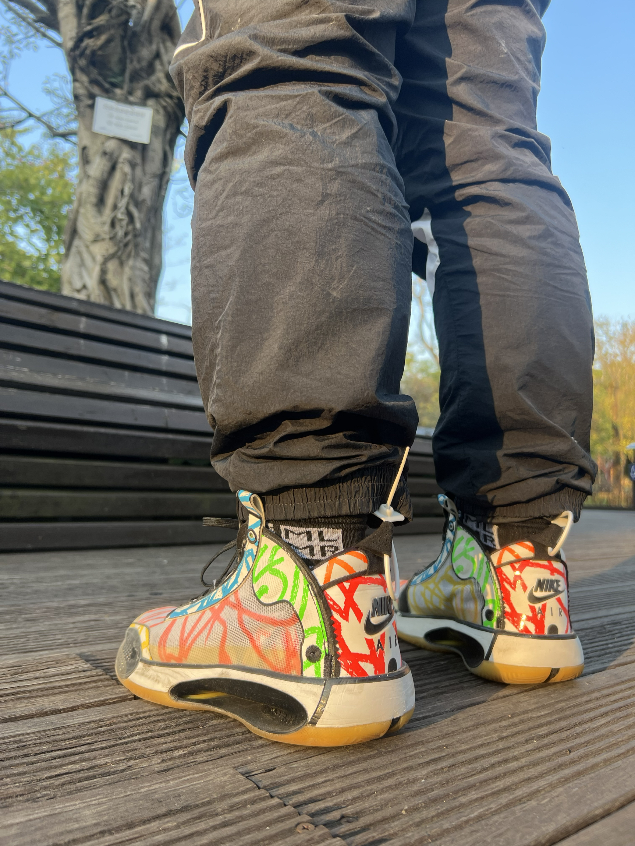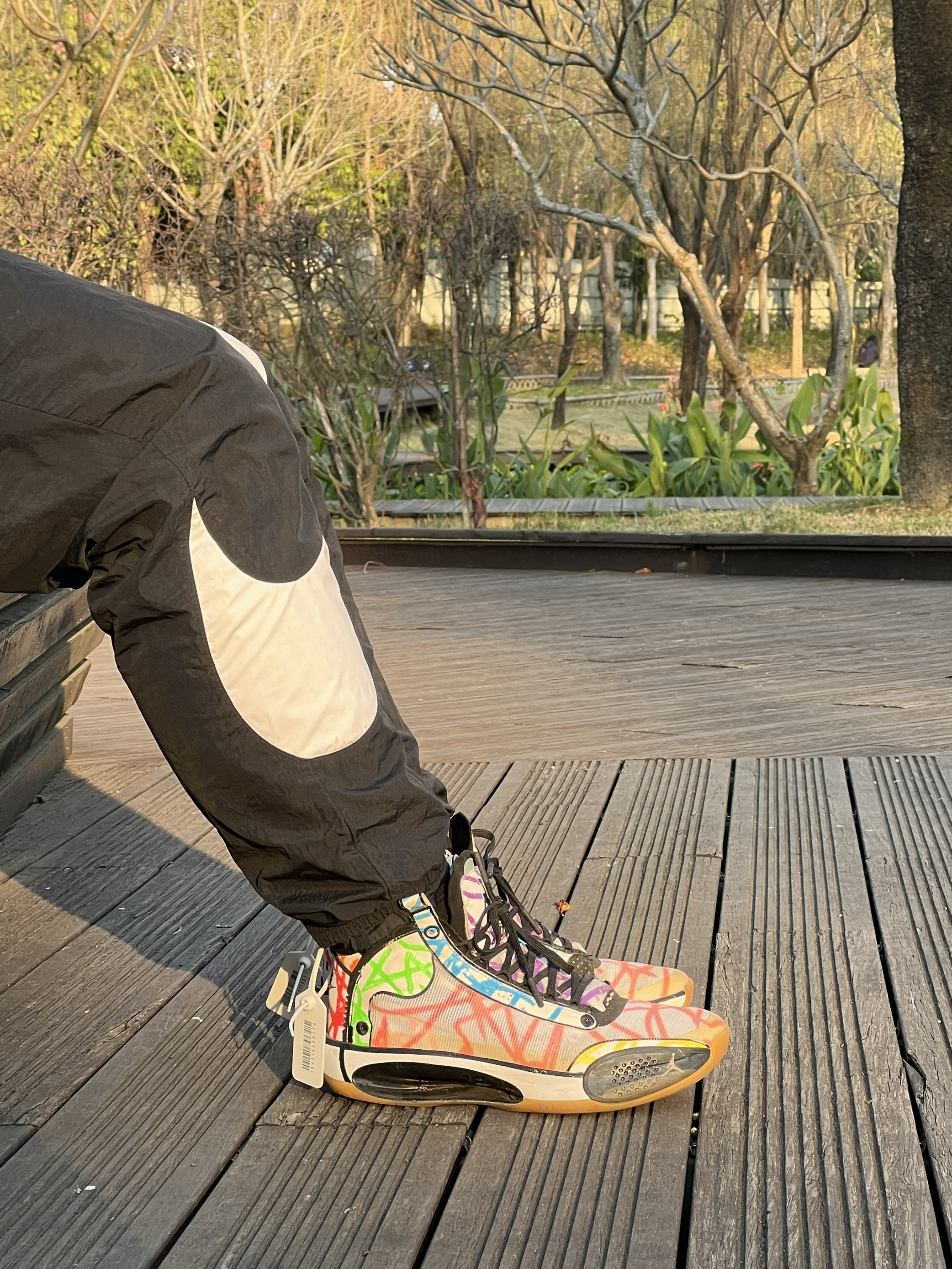 当时总喜欢一些花里胡哨的配色哈哈哈 这个是胖虎签名鞋还没来之前的个人pe配色涂鸦 Aj33的这个镂空中底的结构确实厉害 Aj34鞋在特定人群里算实战很强的鞋 但是一般人比如我配不上它 总而言之对我来说那是真难穿啊 最后只能沦为我夕阳下压马路逛公园的鞋喽~