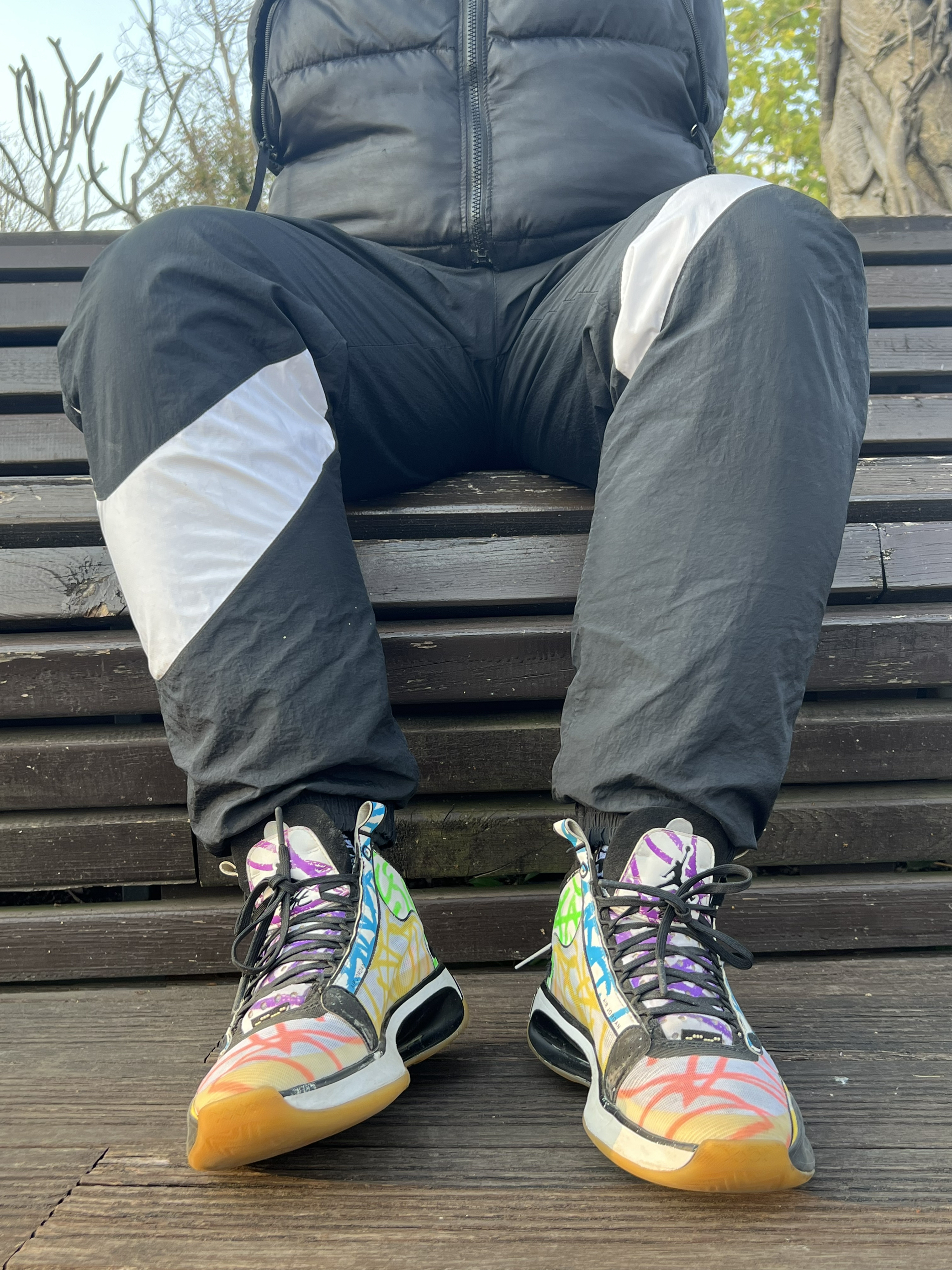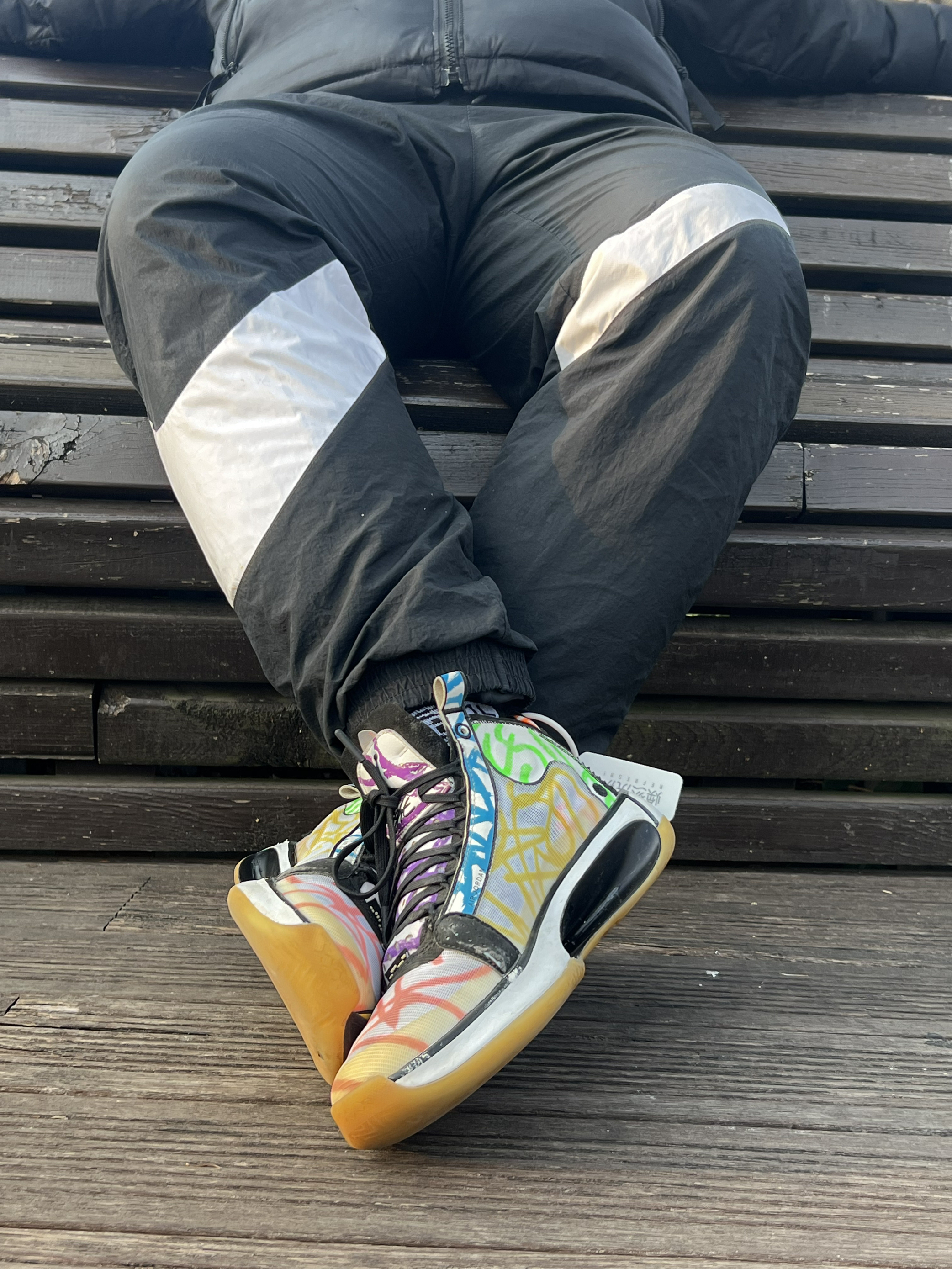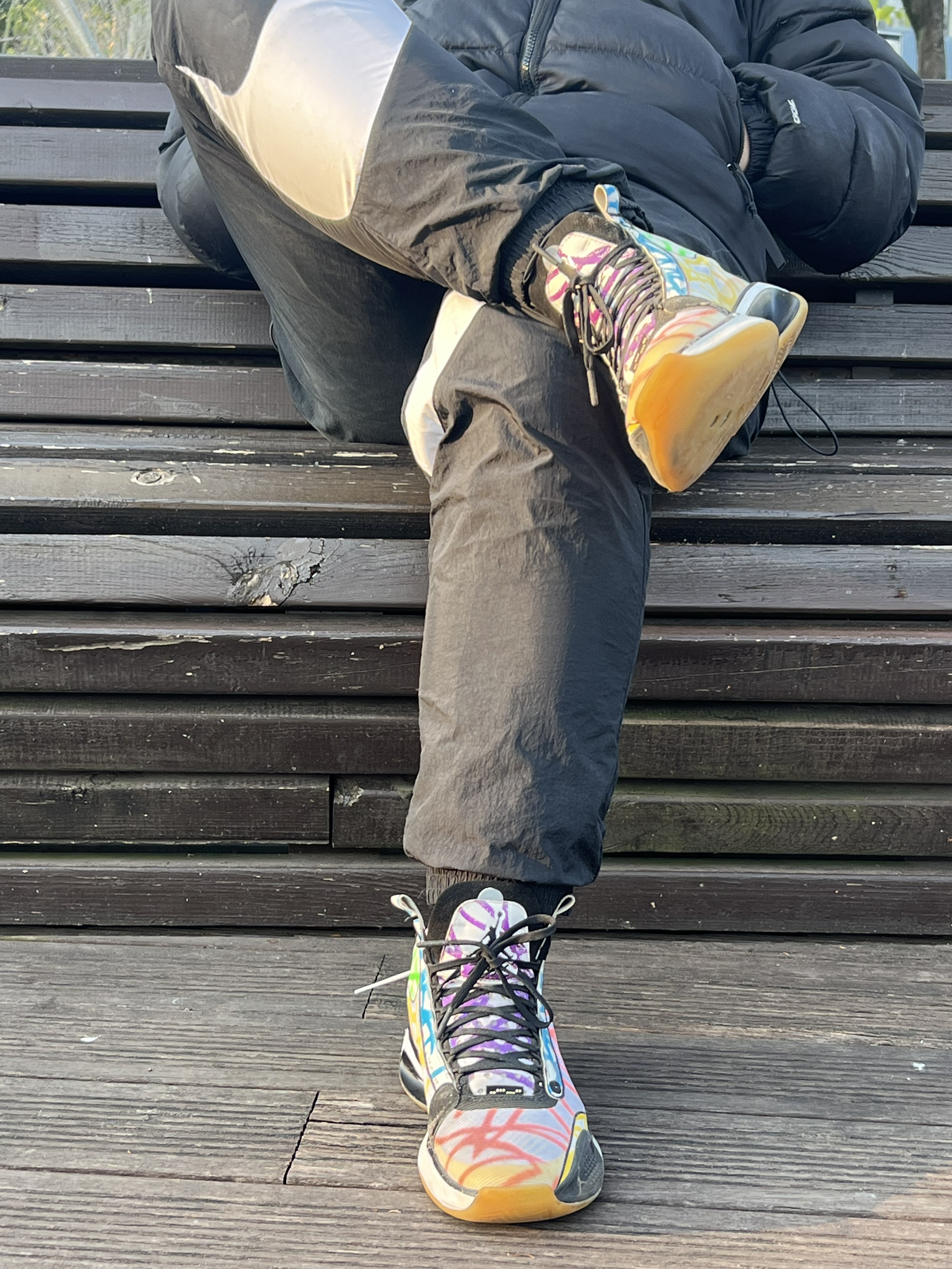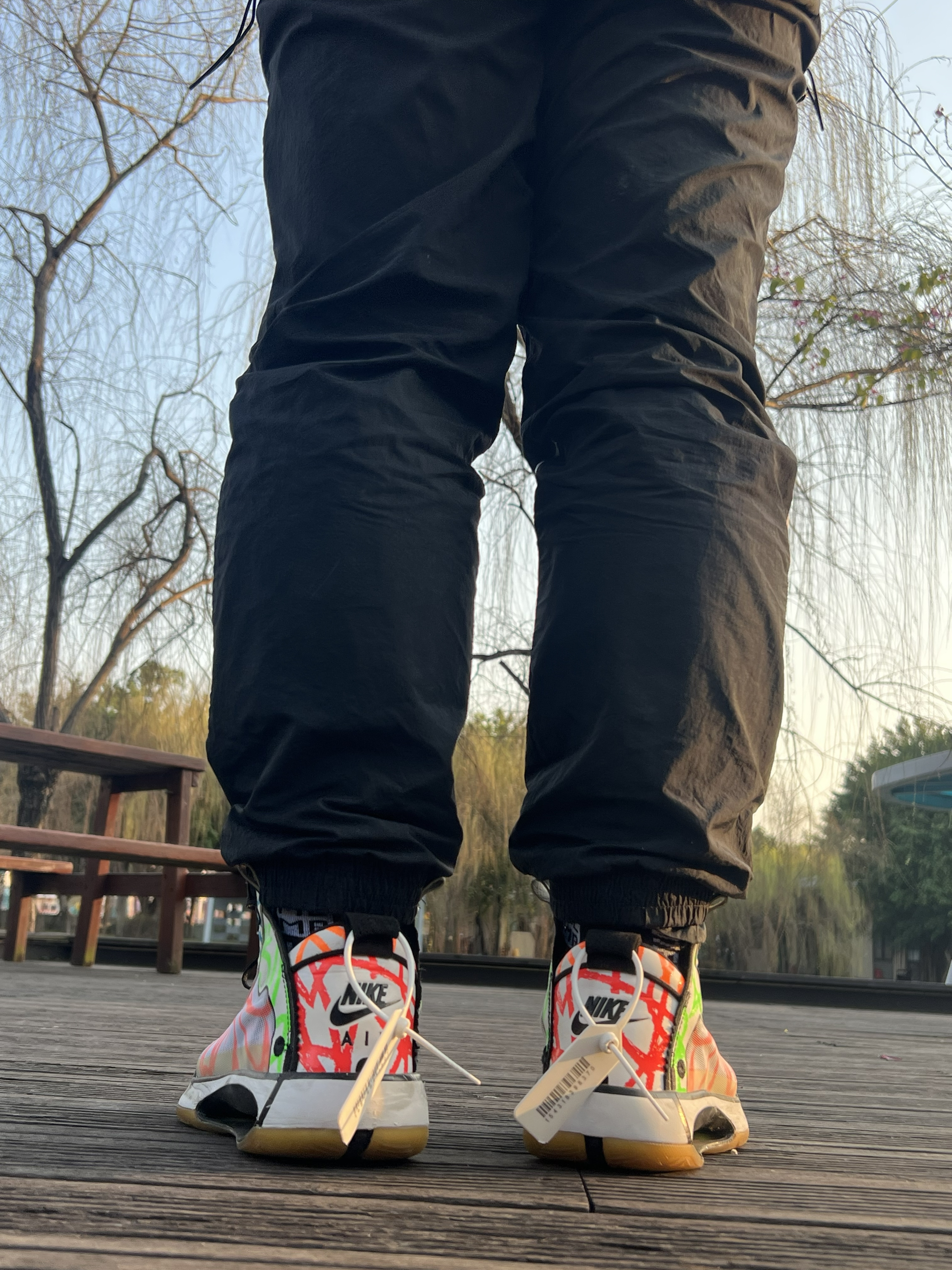 当时总喜欢一些花里胡哨的配色哈哈哈 这个是胖虎签名鞋还没来之前的个人pe配色涂鸦 Aj33的这个镂空中底的结构确实厉害 Aj34鞋在特定人群里算实战很强的鞋 但是一般人比如我配不上它 总而言之对我来说那是真难穿啊 最后只能沦为我夕阳下压马路逛公园的鞋喽~