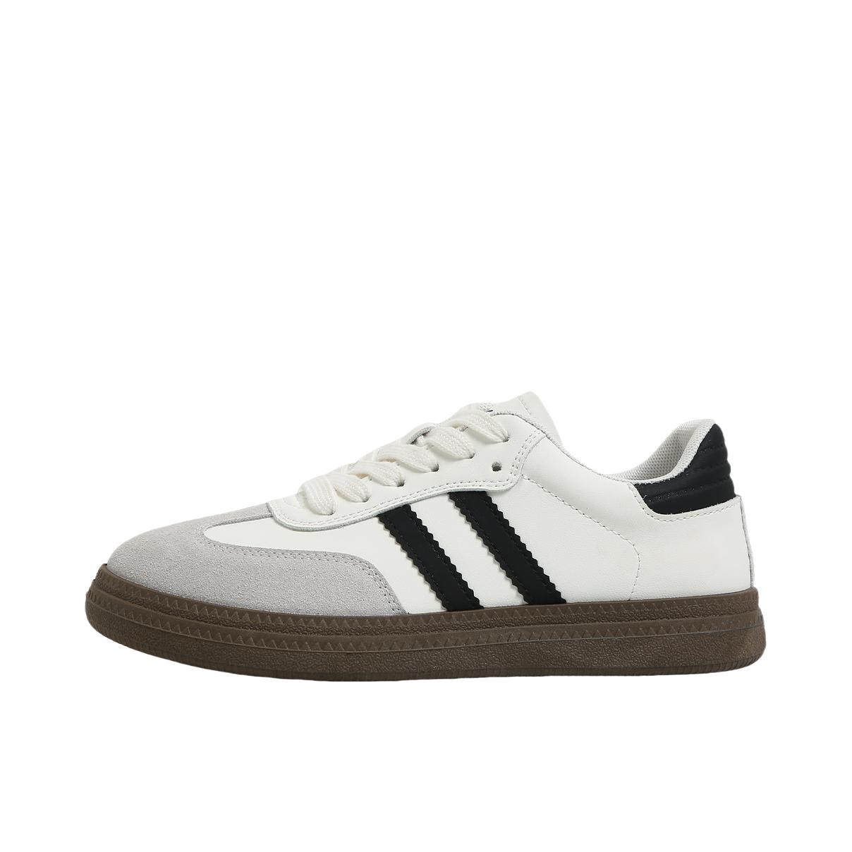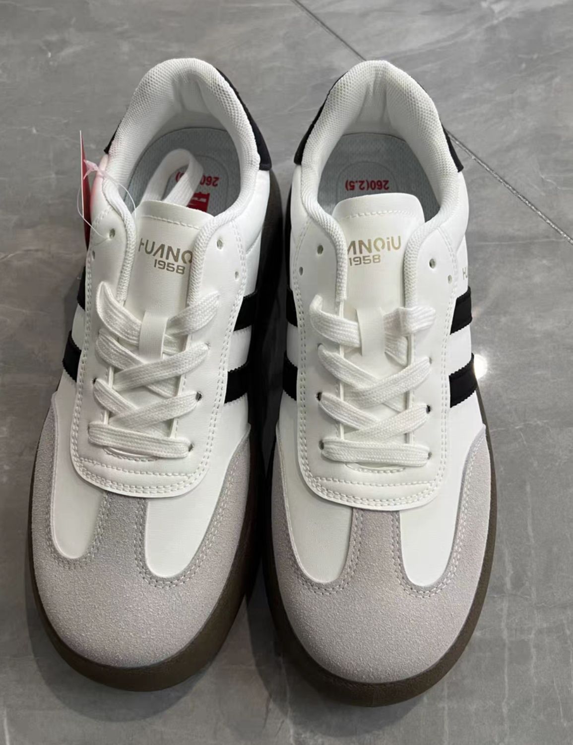 1. 外观与设计:经典复古,百搭属性拉满 这款鞋主打“美式复古风”,鞋型融合了阿甘鞋的流线感和德训鞋的粗犷元素。白黑配色简约耐看,鞋侧线条和做旧感橡胶底进一步强化复古氛围。实测搭配牛仔裤、阔腿裤或连衣裙均无违和感,日常通勤、休闲穿搭都能驾驭,名副其实的“百搭款”。 2. 材质与工艺:轻便透气,但细节有取舍 - 鞋面:采用网布+合成革拼接,透气性良好,春夏穿着不闷脚。但合成革部分稍硬,初上脚需...