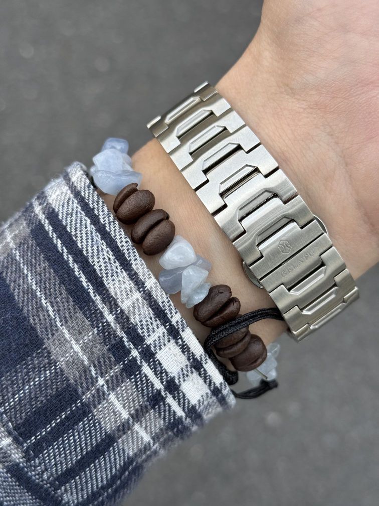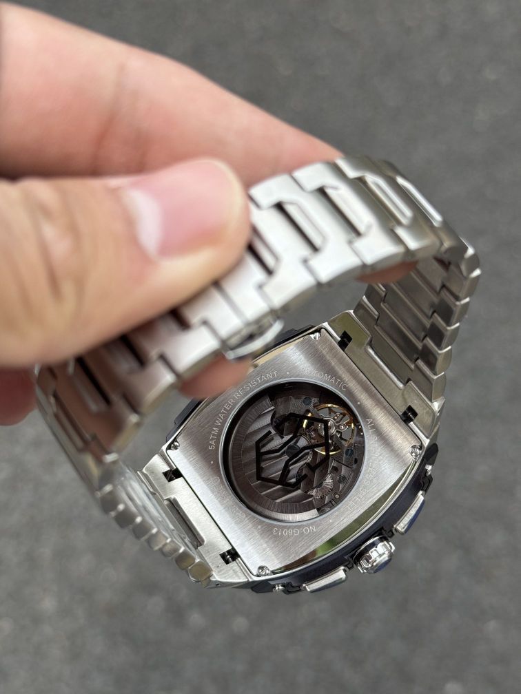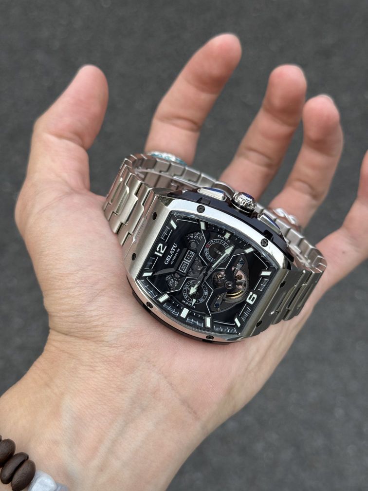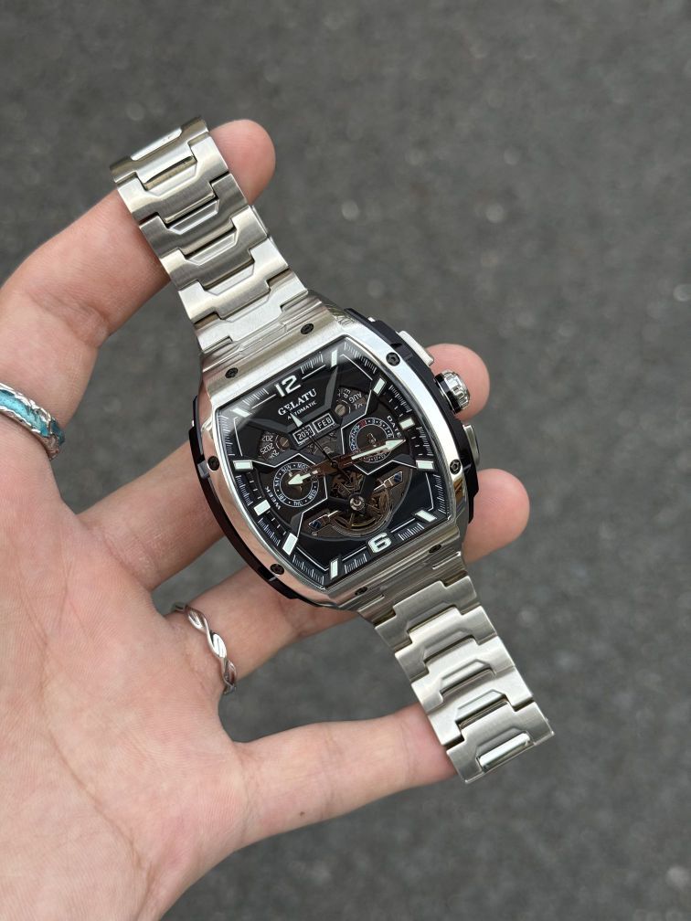 半个月工...可戴上太帅咯 全银背透手表可真帅啊 最近瞅见这格拉图手表,还挺有特色滴! 全银设计我挺钟意嘞 钢带上手挺有分量,沉甸甸滴 表盘棱角分明滴酒桶造型 日常通勤搭配个美式外套搭配就蛮得劲儿 的