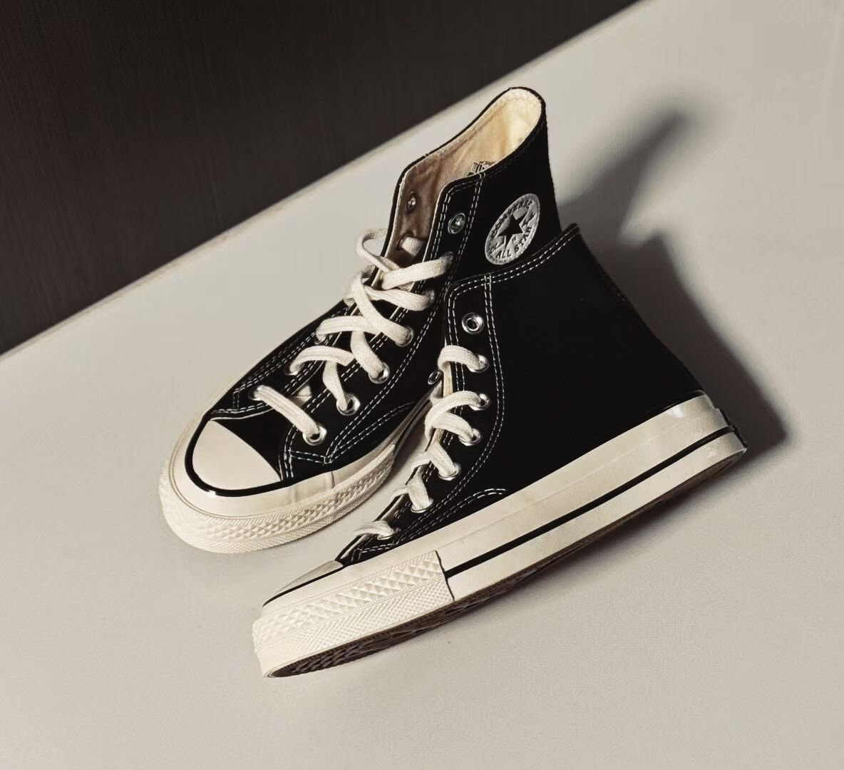 最近挖到一双让我爱不释手的宝藏鞋——匡威1970s高帮帆布鞋!第一眼就被它黑白的极致反差击中,深黑色帆布像刚拆封的黑胶唱片封面,配上雪白的厚胶底和鞋带,连鞋侧的圆形Logo都像特意做旧的唱片标签。拿在手里能摸到扎实的纹理感,帆布不是软塌塌的,而是带着筋骨般的立体廓形,穿起来却轻得像踩着云朵。 最戳我的是那些藏在细节里的复古小心机:微微发黄的鞋底包边,后跟弧度比普通款更挺括,走起路来鞋头会自然弯...