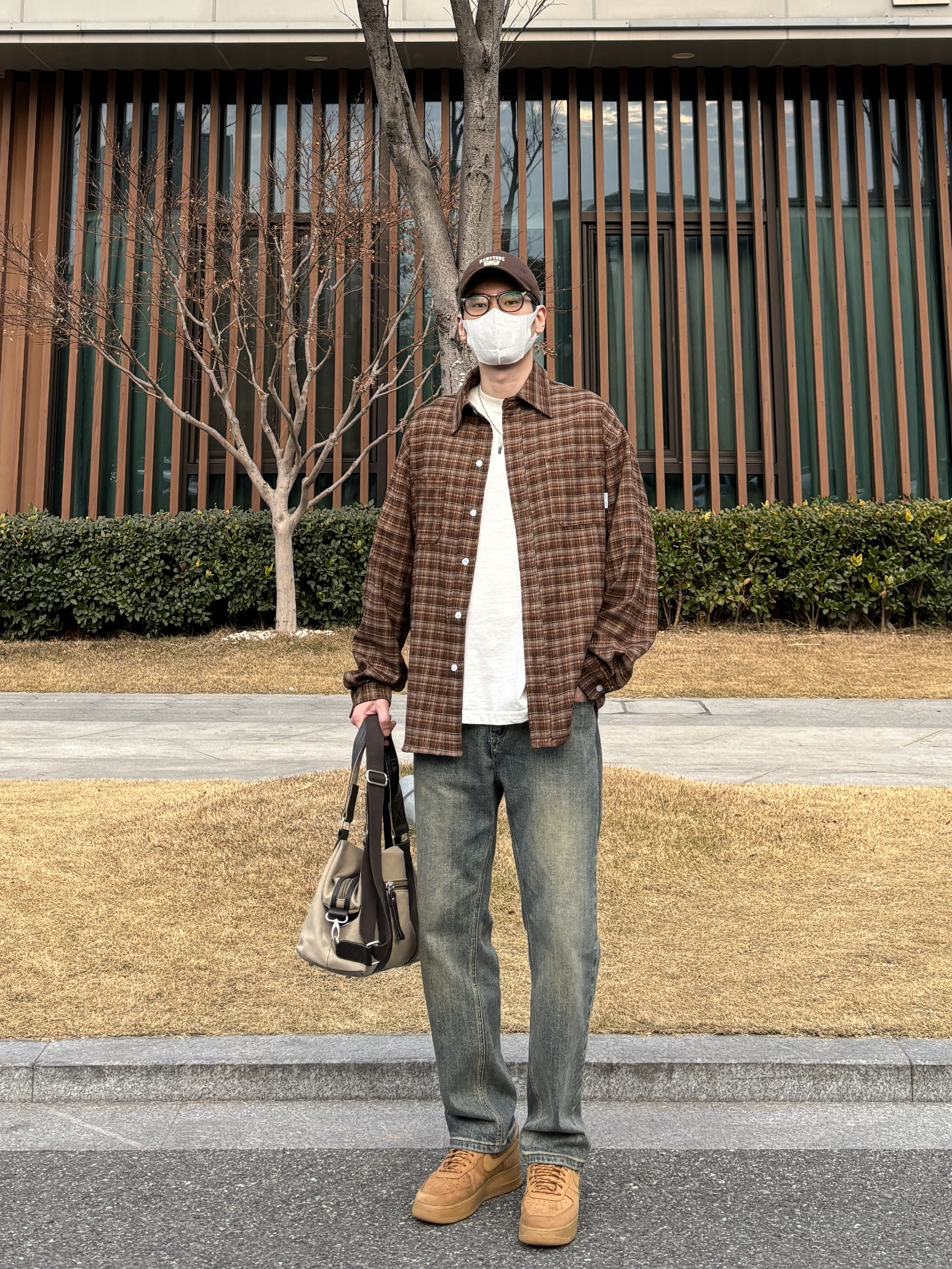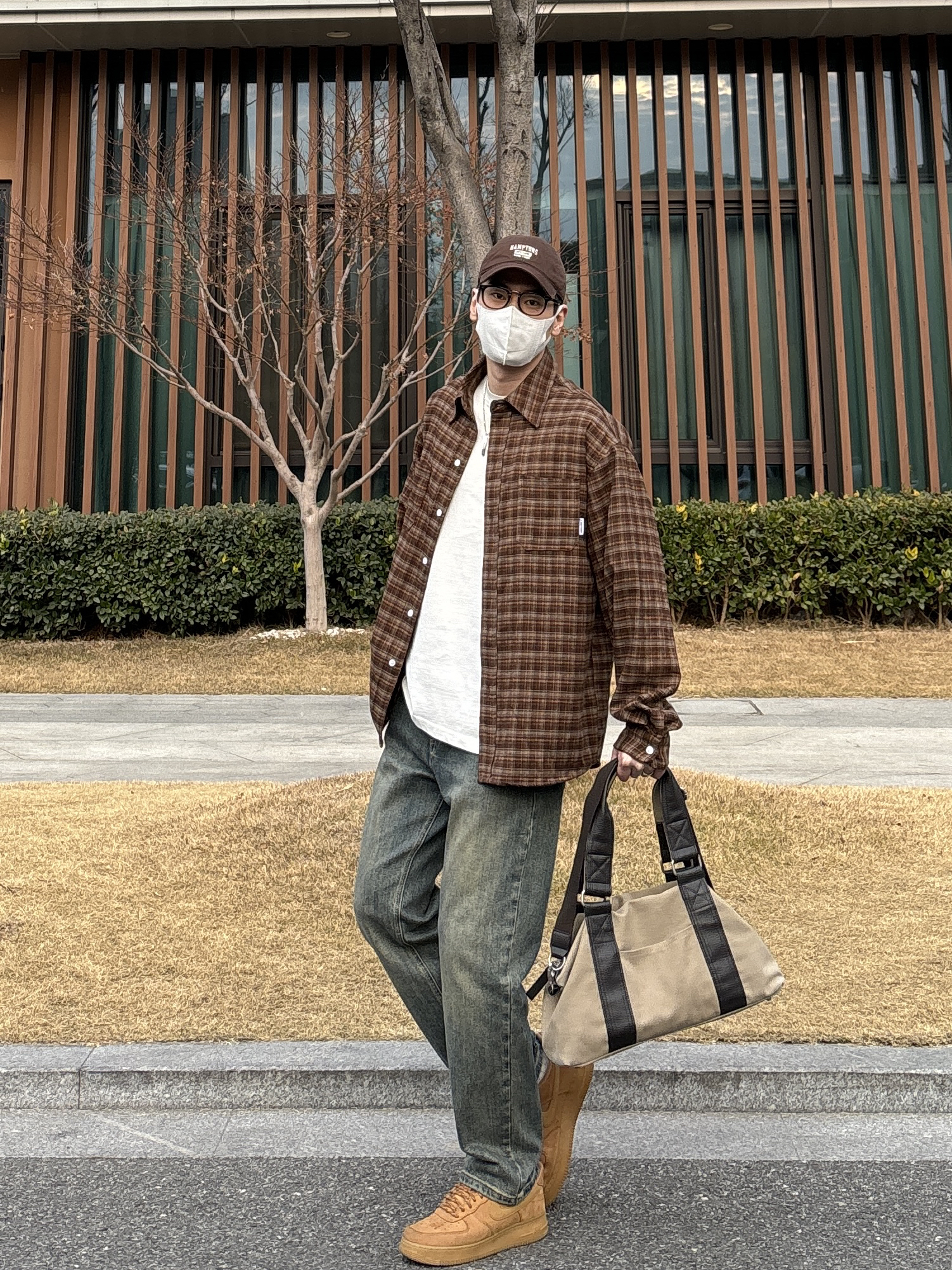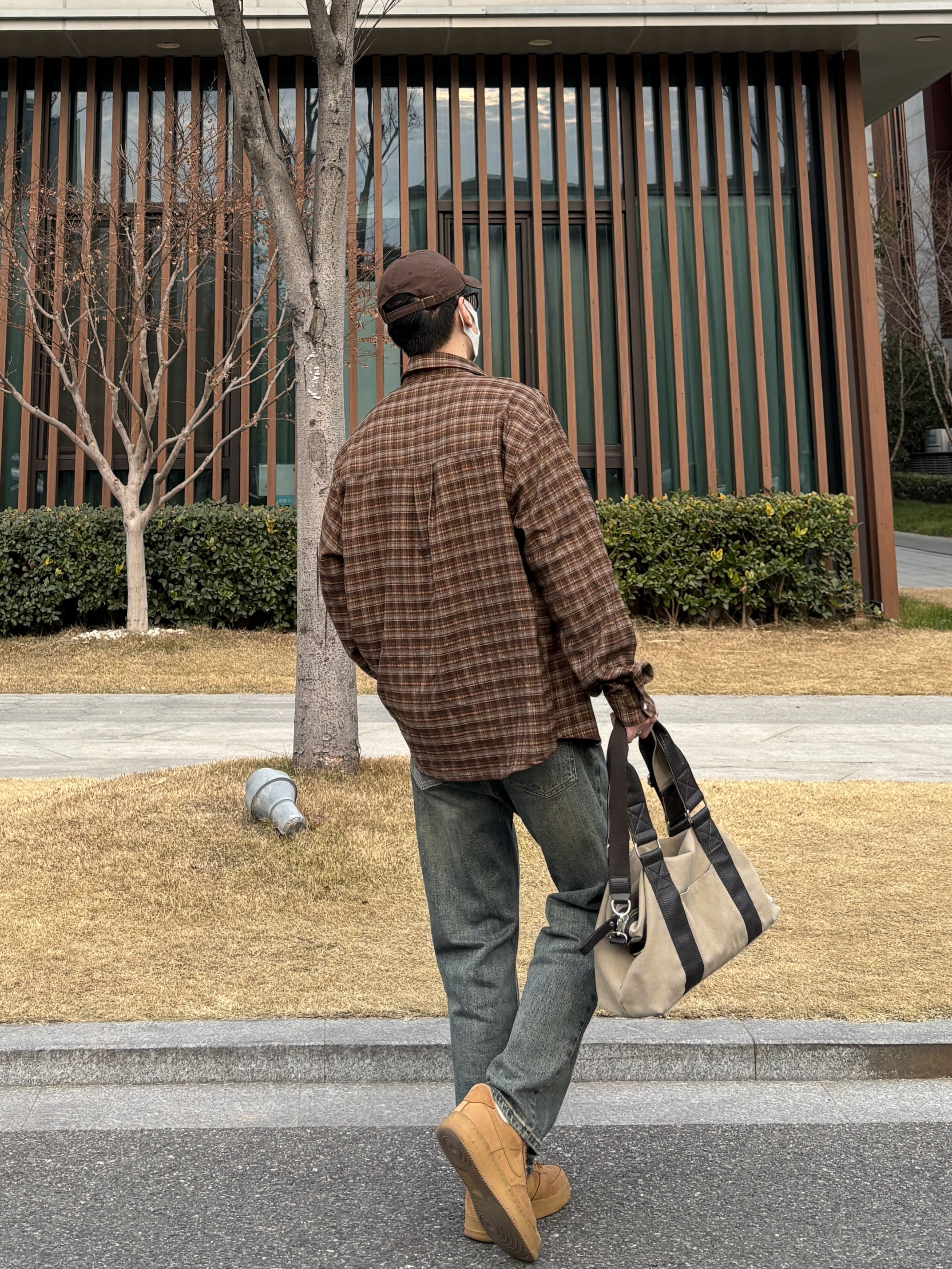 今天这套上衣穿了一件咖啡色宽松阔版磨毛格子衬衫 ⬇️ 裤子选择简约大方的蓝色水洗直筒牛仔裤 ⬇️ 鞋子上脚经典百搭的小麦色af1 ⬇️ 接着拿一个大容量卡其色帆布拼接手提包 ⬇️ 最后代一顶棒球帽呼应下衣服鞋子的颜色 - 今日搭配 衣服裤子:NICE LILI 鞋子:AF1小麦