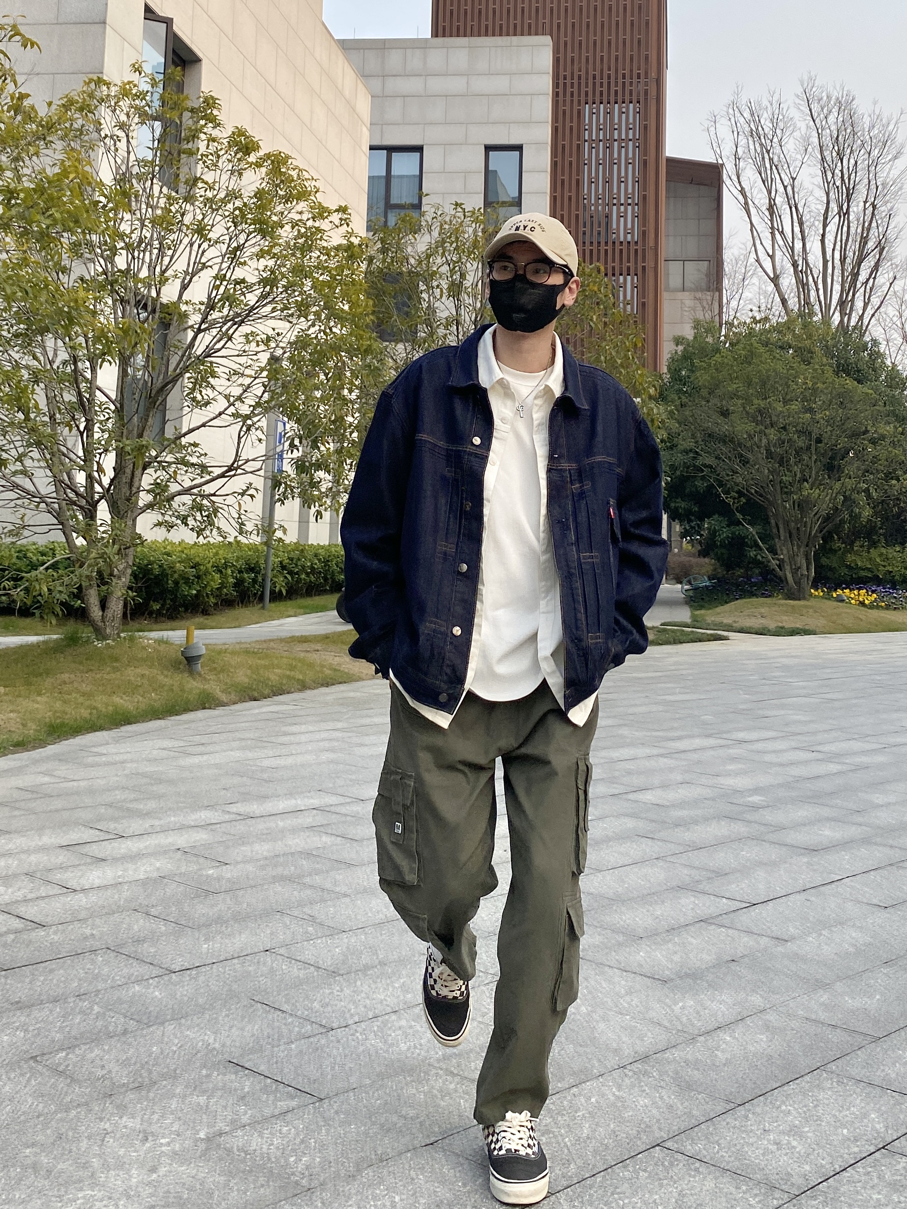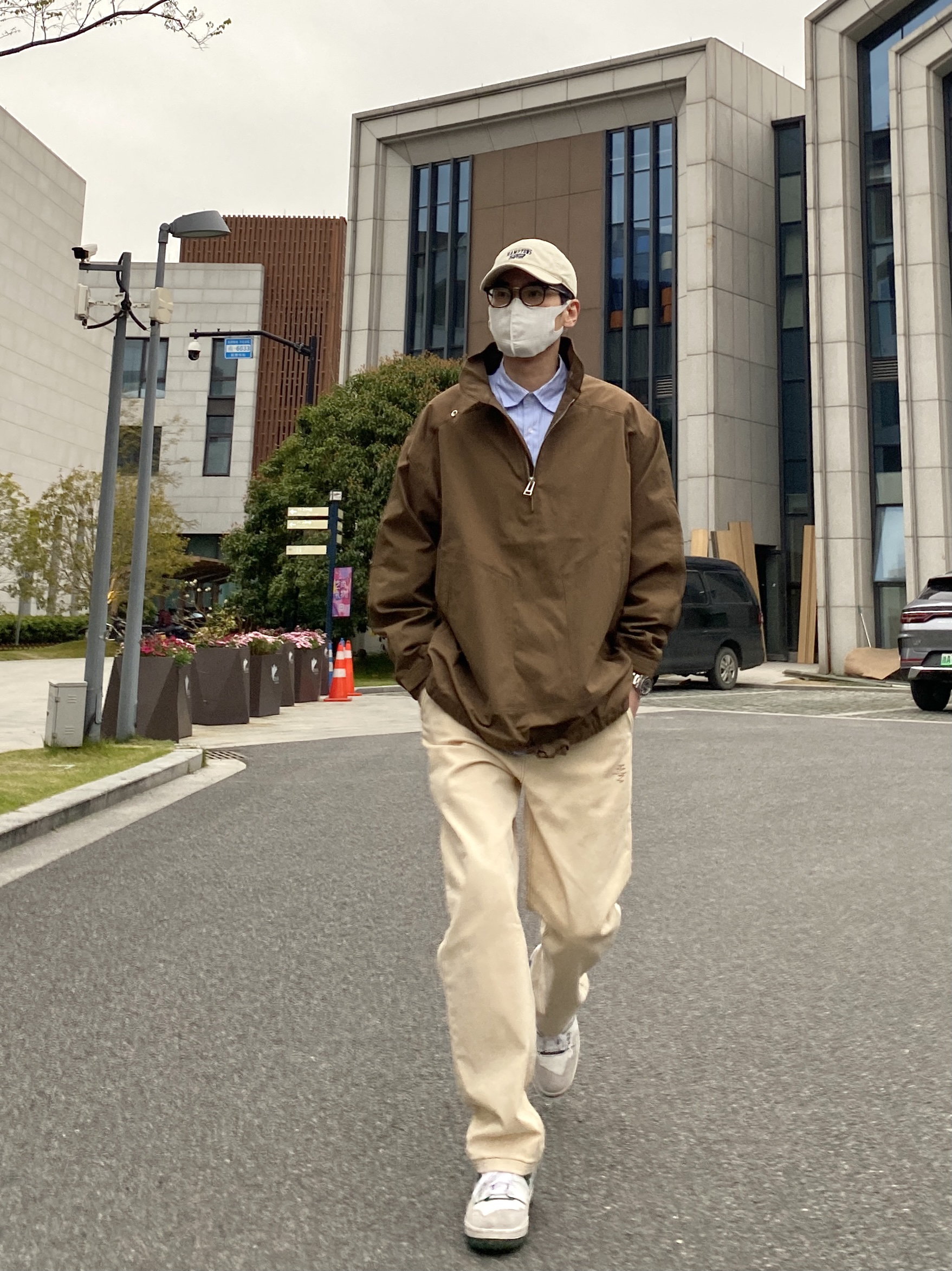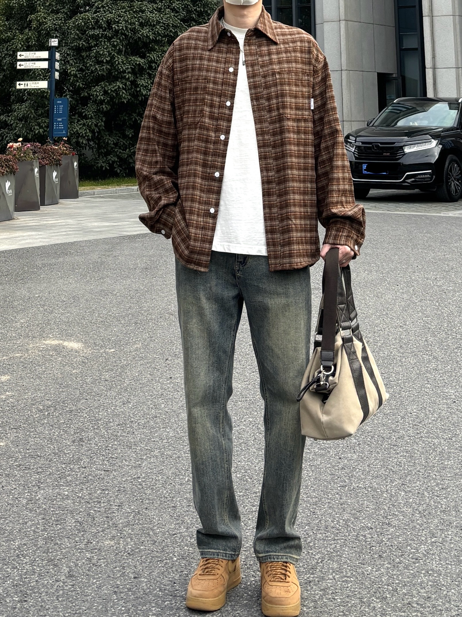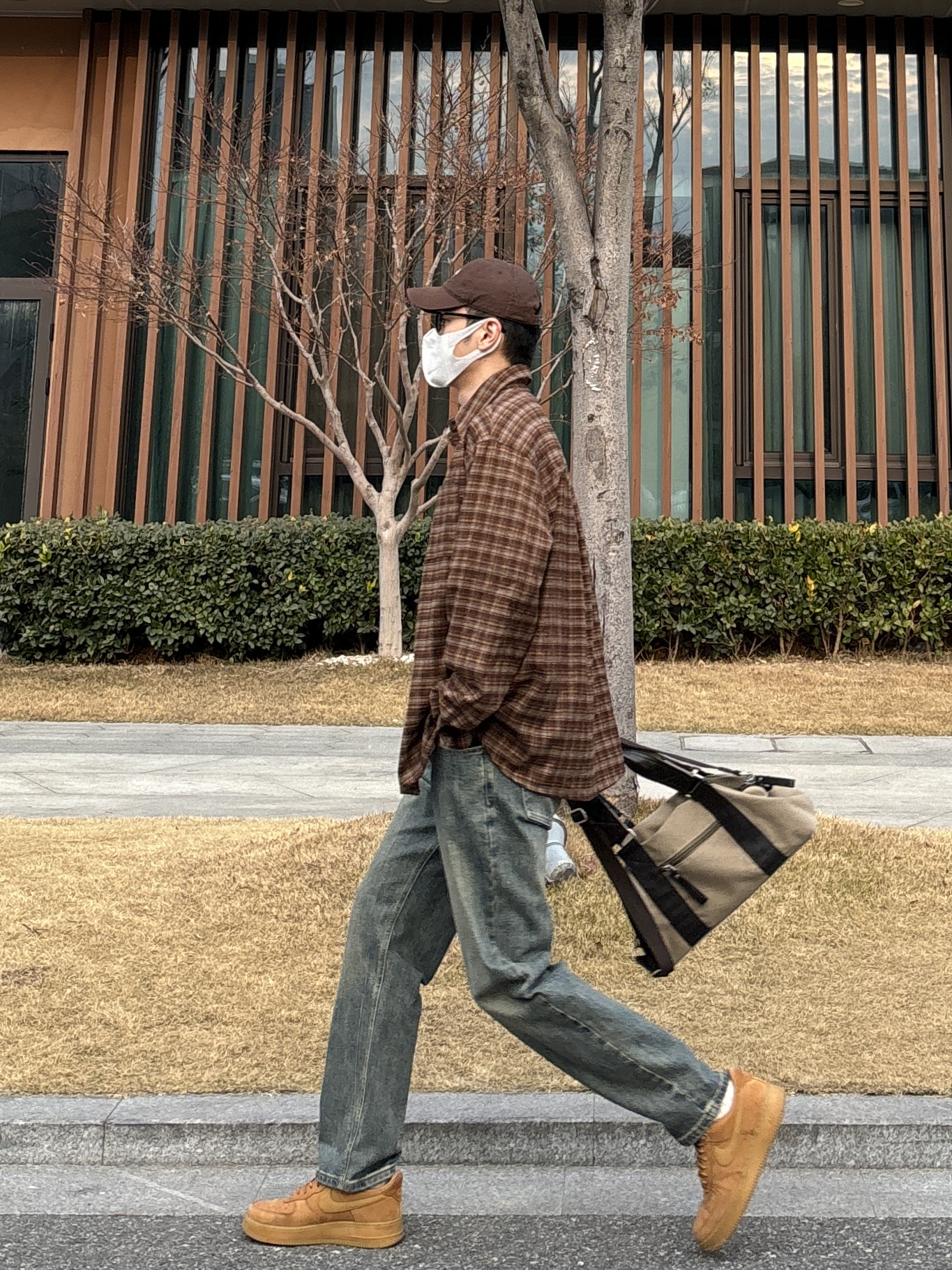 今天这套上衣穿了一件咖啡色宽松阔版磨毛格子衬衫 ⬇️ 裤子选择简约大方的蓝色水洗直筒牛仔裤 ⬇️ 鞋子上脚经典百搭的小麦色af1 ⬇️ 接着拿一个大容量卡其色帆布拼接手提包 ⬇️ 最后代一顶棒球帽呼应下衣服鞋子的颜色 - 今日搭配 衣服裤子:NICE LILI 鞋子:AF1小麦