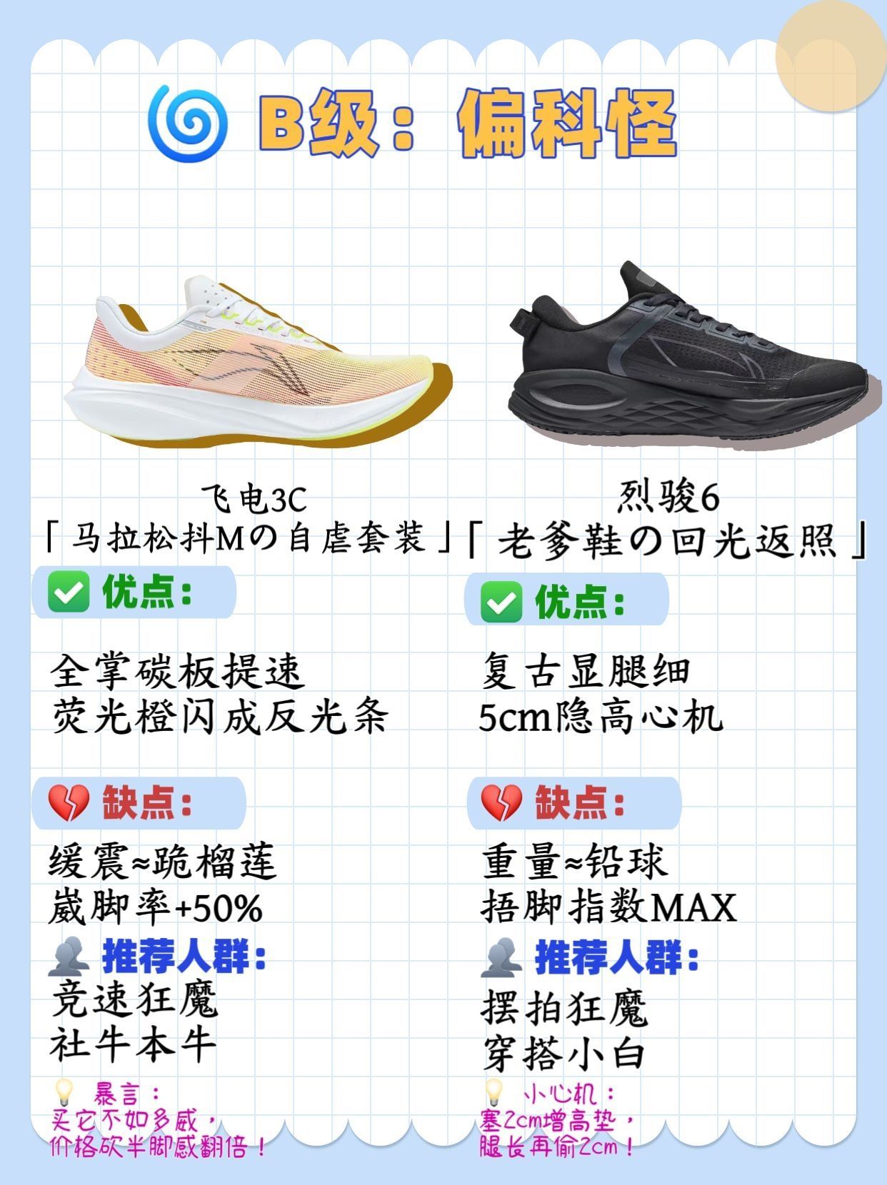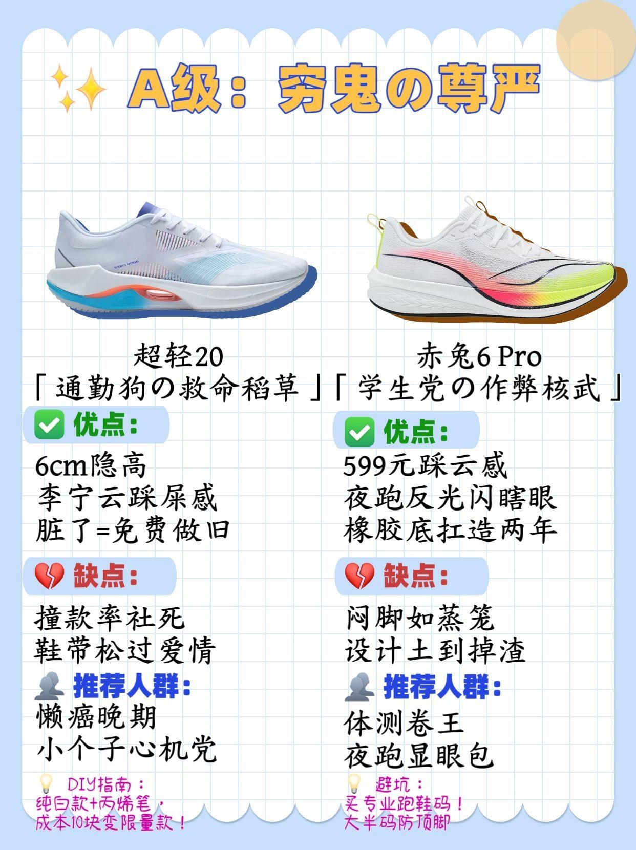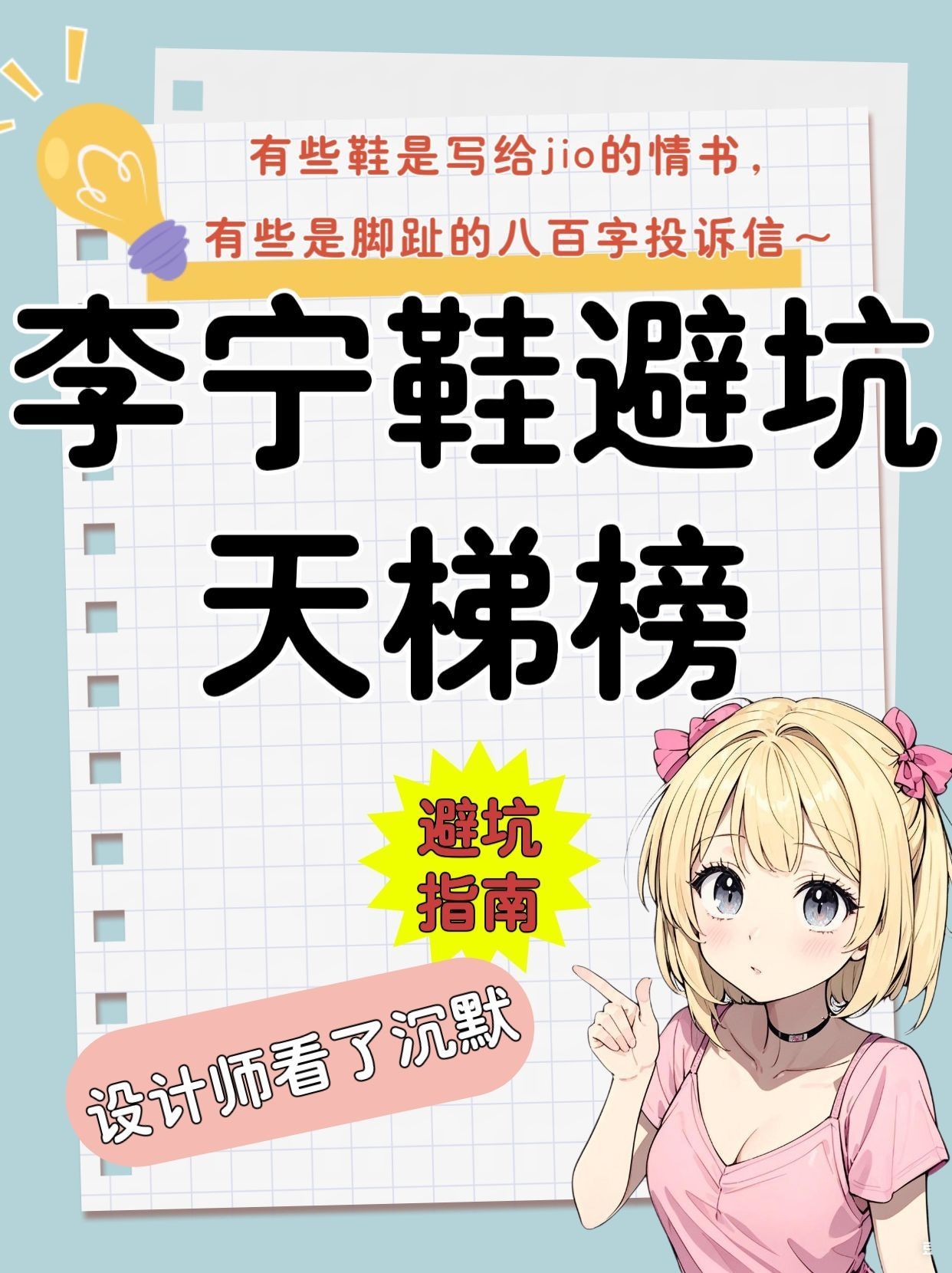 💌李宁鞋选购实用指南 核心原则:按需选鞋,拒绝营销洗脑! 一.脚型适配 ✅ 宽脚党:驭帅16 V2|反伍2(魔术贴) ✅ 瘦脚党:闪击9|全城9 💣 雷区:韦德10(窄楦)|绝影(压脚背) ⚠️ 扁平足快逃:空袭9|音速9 二.材质红黑榜 ✅ 抗造:头层牛皮|䨻丝网布|深纹橡胶底 💣 快逃:水晶底(氧化快)|人造革(硬壳)|薄网布(脆) 三.场景公式 ✅ 通勤:超轻20(隐高)|赤兔...