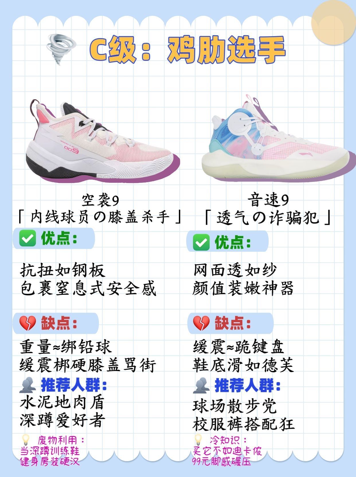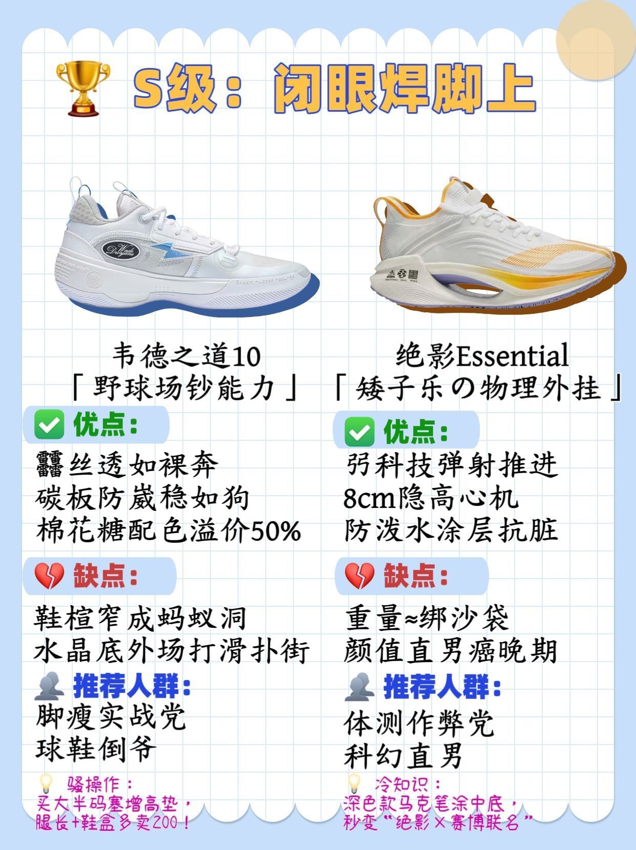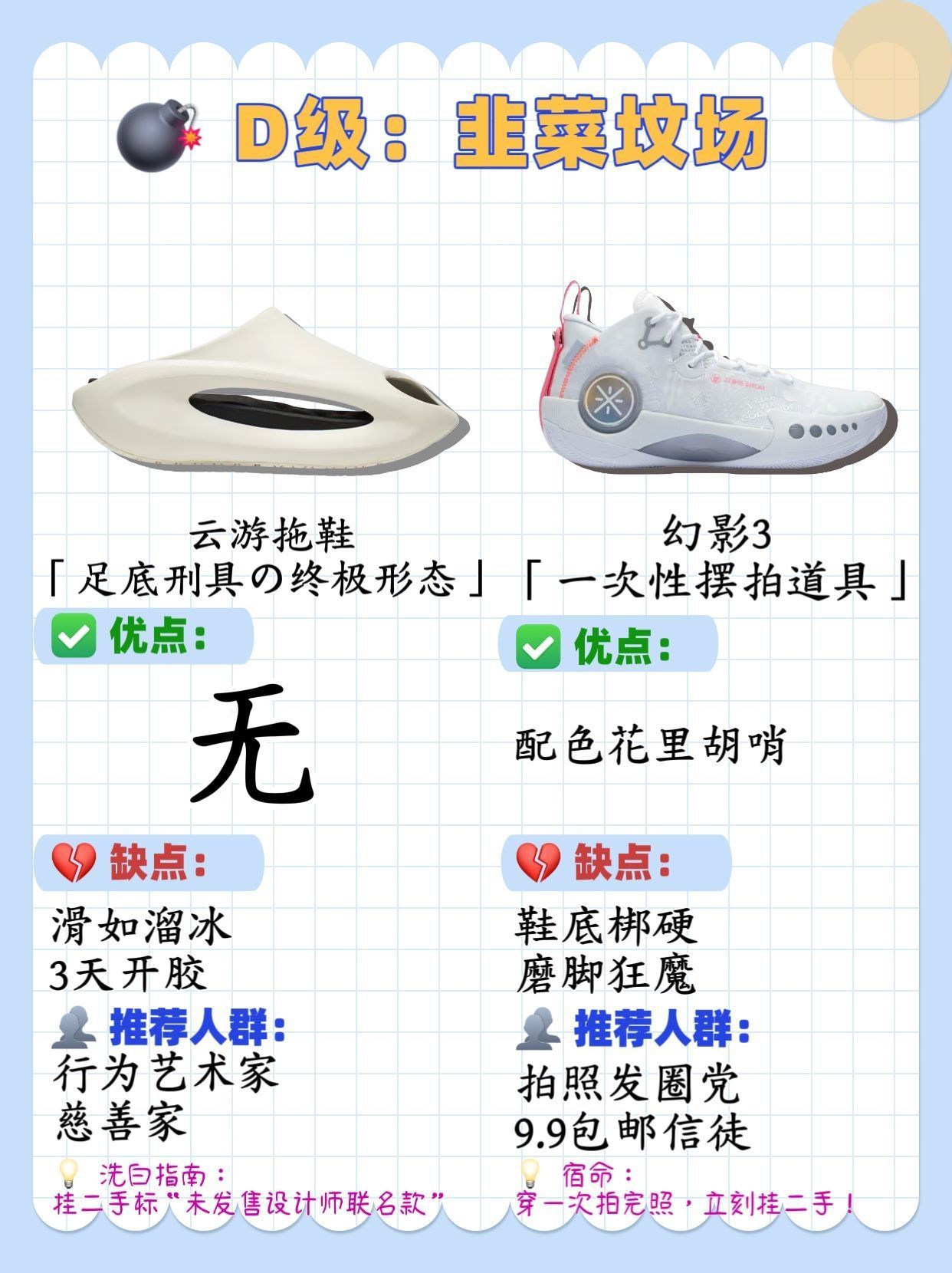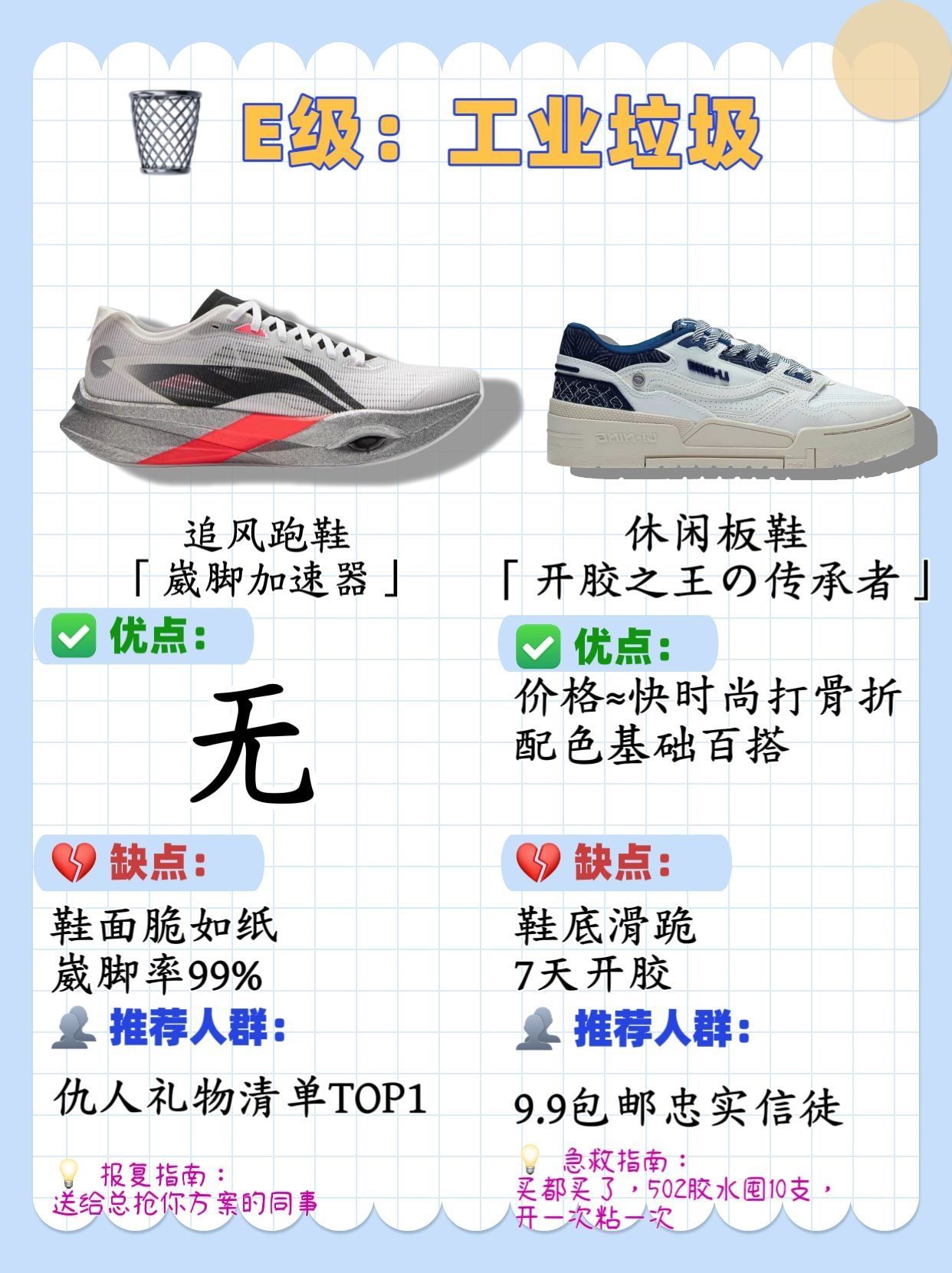 💌李宁鞋选购实用指南 核心原则:按需选鞋,拒绝营销洗脑! 一.脚型适配 ✅ 宽脚党:驭帅16 V2|反伍2(魔术贴) ✅ 瘦脚党:闪击9|全城9 💣 雷区:韦德10(窄楦)|绝影(压脚背) ⚠️ 扁平足快逃:空袭9|音速9 二.材质红黑榜 ✅ 抗造:头层牛皮|䨻丝网布|深纹橡胶底 💣 快逃:水晶底(氧化快)|人造革(硬壳)|薄网布(脆) 三.场景公式 ✅ 通勤:超轻20(隐高)|赤兔...