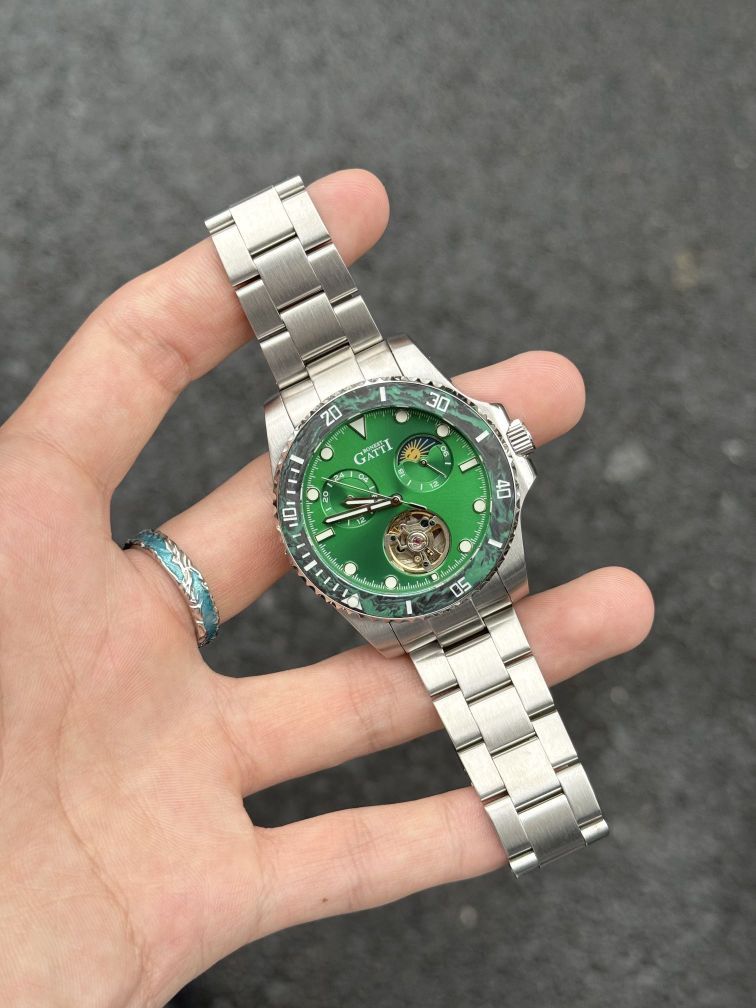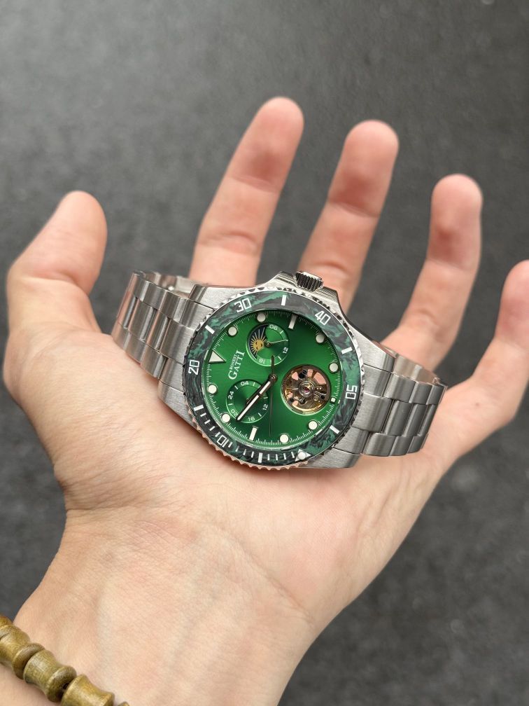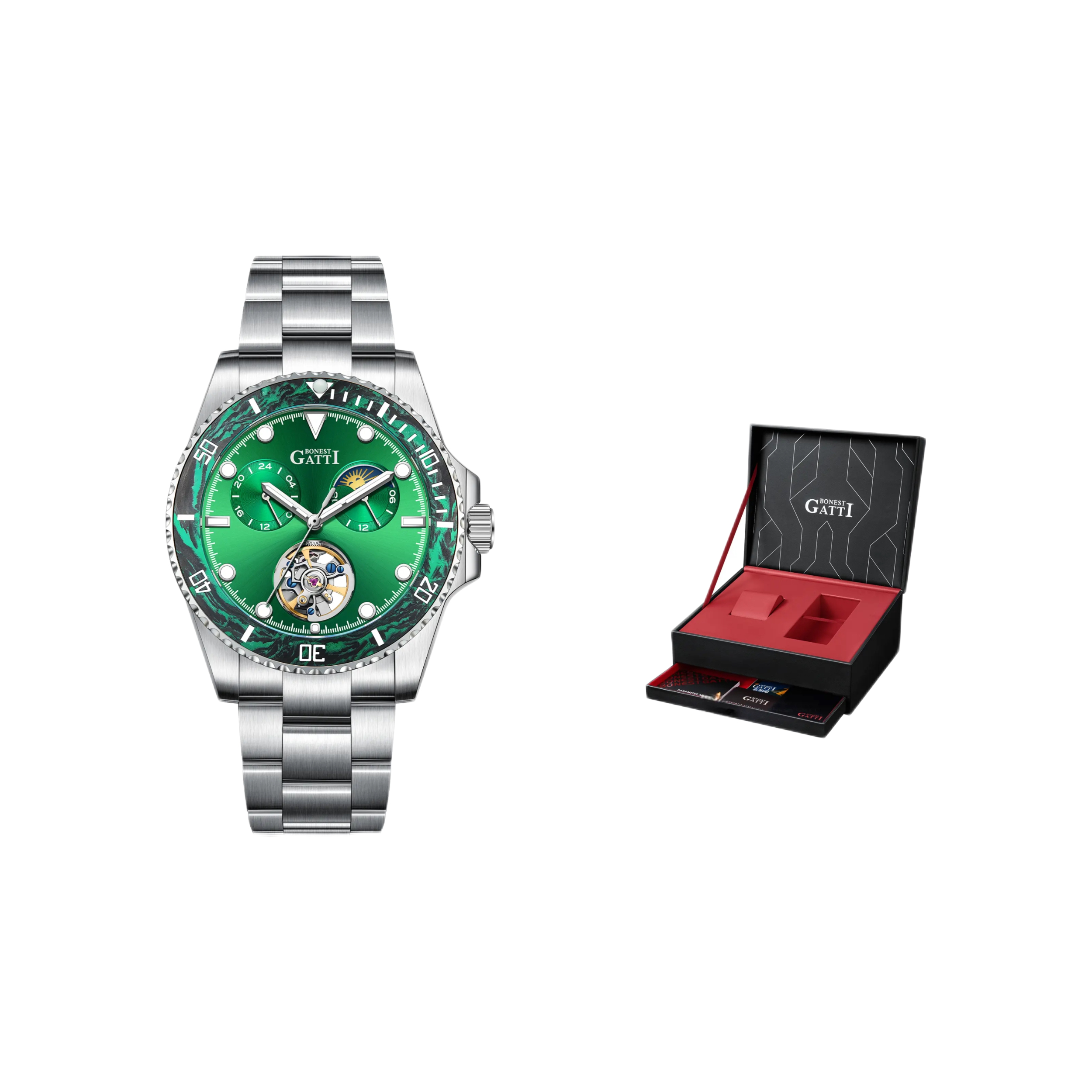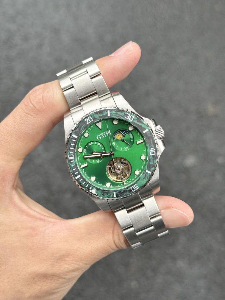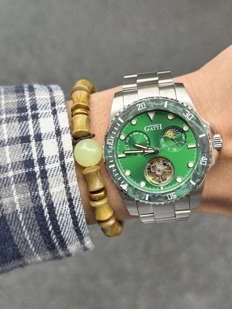 本篇笔记关联了BONEST GATTI/布加迪 水鬼系列 碳纤维潜水多功能潜航者轻奢商务夜光防水运动24小时制月相蚝式可旋转表圈自动机械男士手表 【礼盒装】绿色 BG8003-S3等商品,为用户提供真实的使用体验和购买参考。