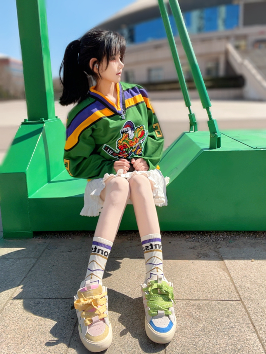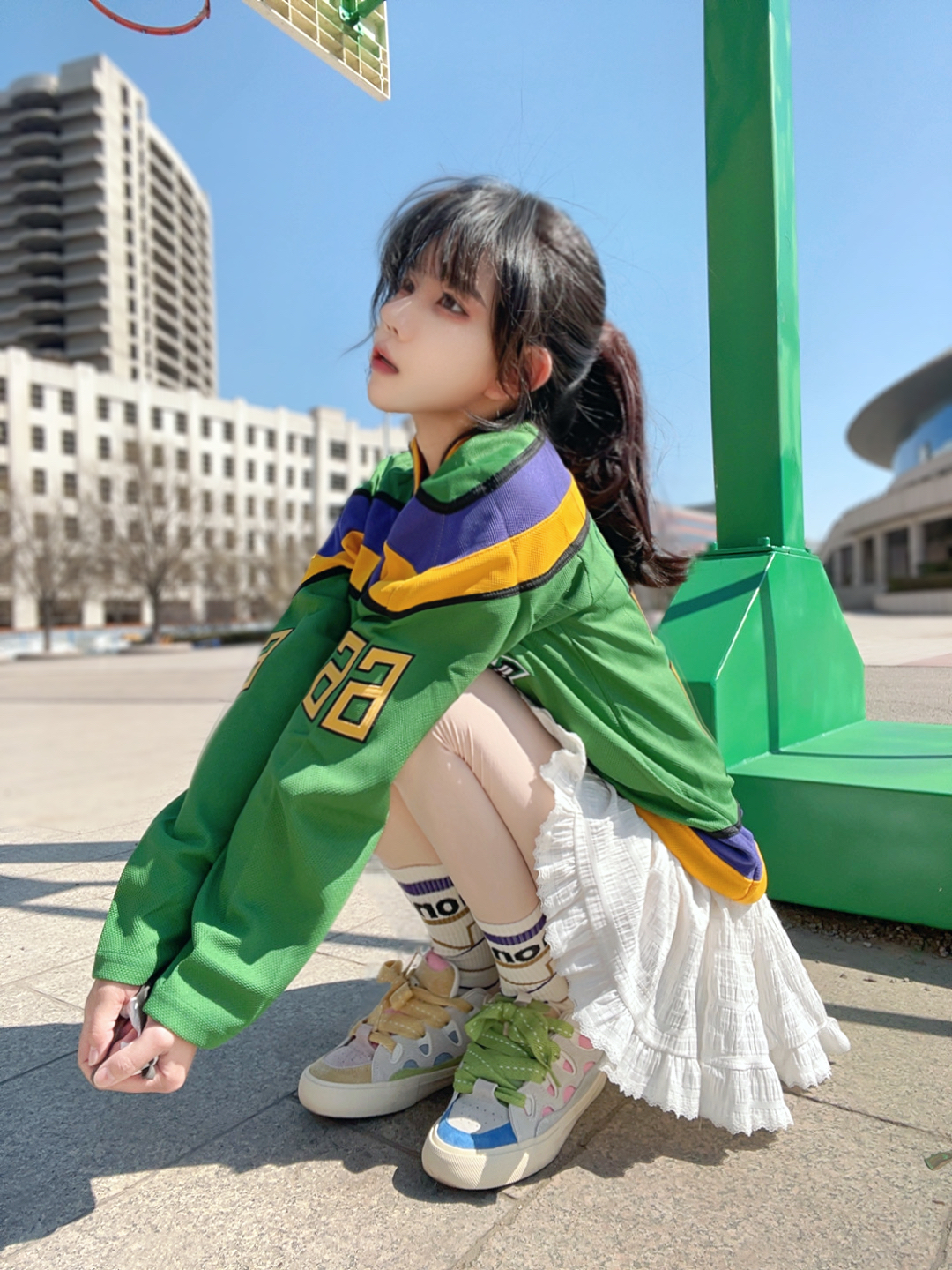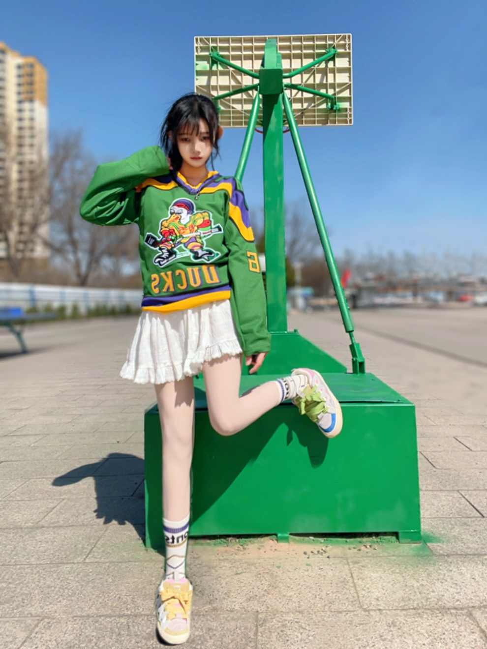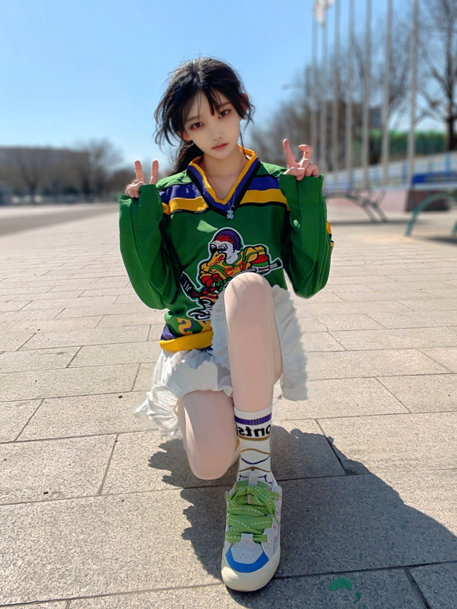 忙碌一周发现学校随意拍照都好好看~穿一件拼接球衣搭配白色短裙,混装的就是很耐看👀 脚踩一双鸳鸯面包鞋,脚感软软的很舒适,再配上我的篮球袜,今天甜度拉满🥰