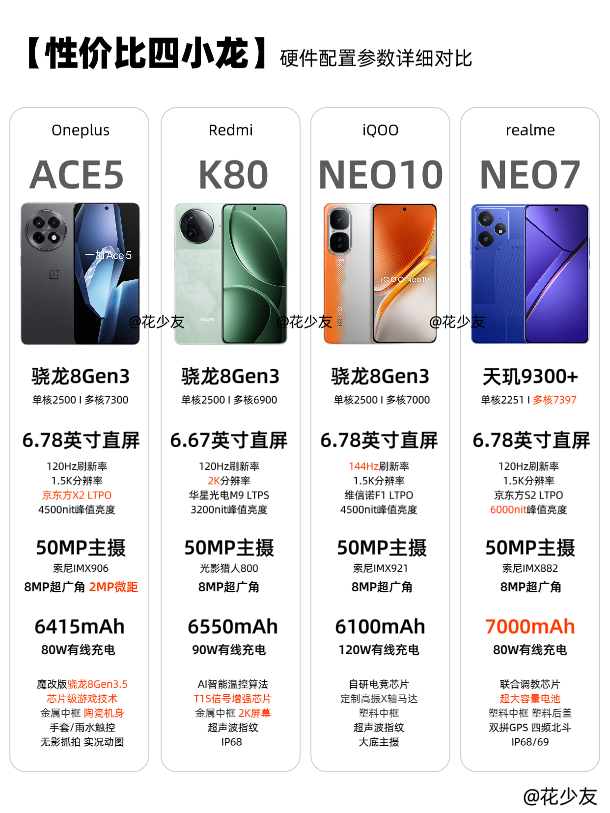 从硬件配置和使用体验来看,目前一加Ace5、红米K80、iqooNeo10、真我Neo7热度最高,到底该买哪一款更靠谱呢? 🏆一加Ace5 • 硬件配置:一加把性能调教深入到芯片底层,发挥出了骁龙8 Gen3的高强战力。配合风驰游戏内核,能突破安卓内核限制。 二代京东方护眼直屏效果出色,支持8T LTPO 1-120Hz可变刷新率,操作流畅且跟手。 6415毫安冰川mAh电池,支持80W快充。 ...