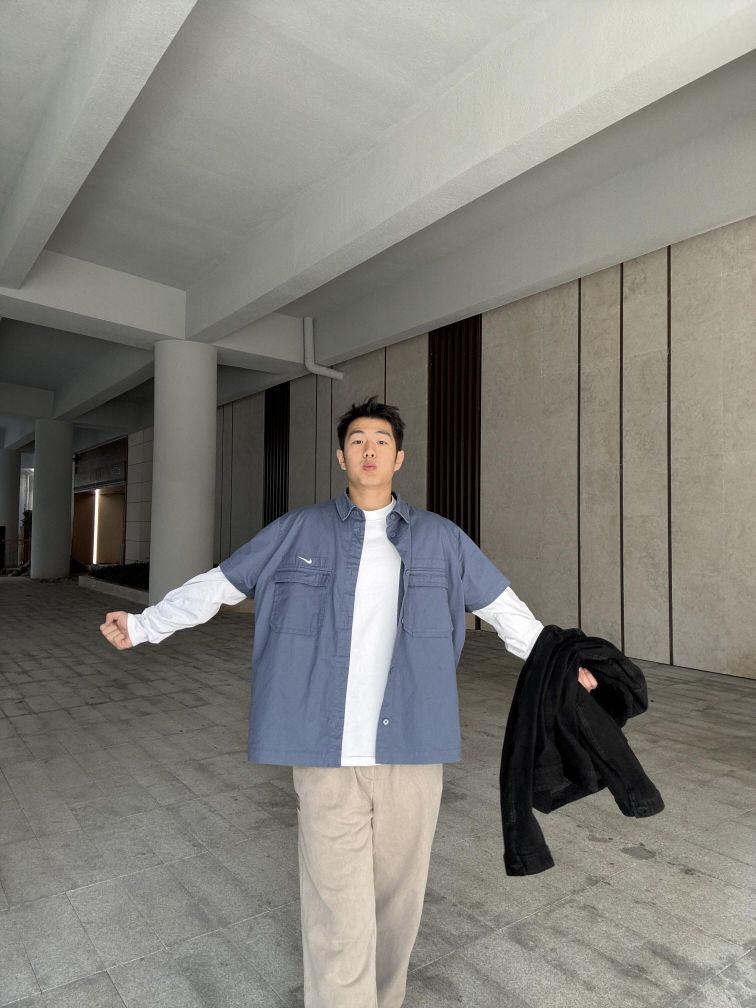 ✨最近真的酷爱日系工装搭配 就感觉这样的穿搭方式,很舒适,宽宽大大的,还特别有逼格 短袖衬衫👔➕马甲,再配一条版型异常宽松的工装裤,公式牢牢记住了哈 衬衫面料厚实有质感 灰蓝色真的超有男友力 属实是我的宝藏短袖衬衫了 真的很有日系少年感~ 🉑单穿或外穿 低调又不失个性 图源网络侵删