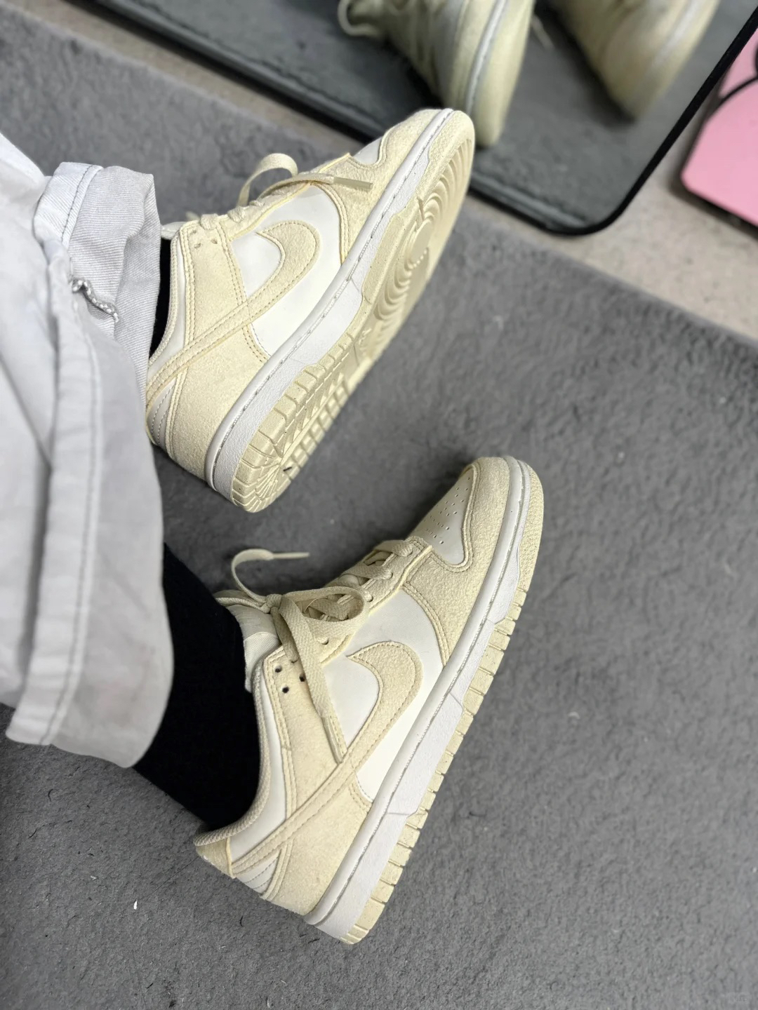 这双鞋Dunk的复古板鞋型 搭配海滩浅黄的细节点缀 百搭又耐看、适合日常穿着上脚后感觉很舒适 鞋底软软长时间走路也不会累 我搭配白色T恤+宽松牛仔裤 你们觉得这双鞋适合什么风格?