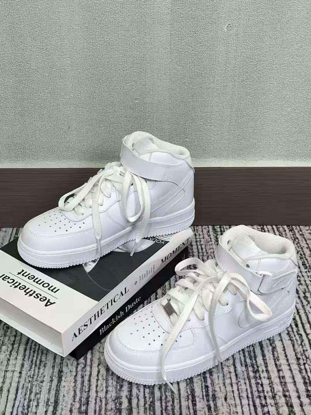 设计风格 经典高帮造型,利落又不失个性,能有效修饰脚踝线条。全白配色纯粹干净,简约大气,无论是休闲装、运动风还是酷帅的街头穿搭,它都能轻松适配,轻松成为整体造型的点睛之笔,百搭属性堪称一绝。 材质细节 鞋面采用高品质皮革,质地柔软且富有光泽,手感细腻。精心设计的透气孔分布合理,不仅增加了鞋子的时尚感,还能提升空气流通性,减少脚部闷热。鞋舌和内衬部分选用柔软的织物,贴合脚部肌肤,避免磨脚...