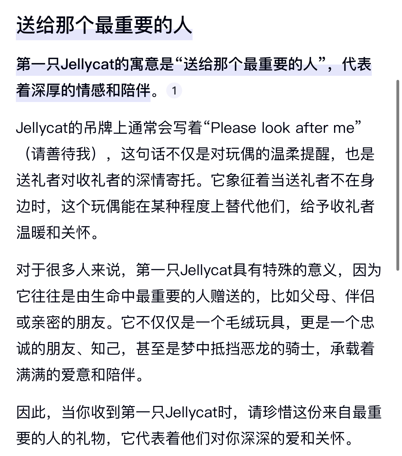 第一只Jellycat的寓意是“送给那个最重要的人”,代表着深厚的情感和陪伴。 Jellycat的吊牌上通常会写着“Please look after me”(请善待我),这句话不仅是对玩偶的温柔提醒,也是送礼者对收礼者的深情寄托。它象征着当送礼者不在身边时,这个玩偶能在某种程度上替代他们,给予收礼者温暖和关怀。 对于很多人来说,第一只Jellycat具有特殊的意义,因为它往往是由生命中最重要的人...