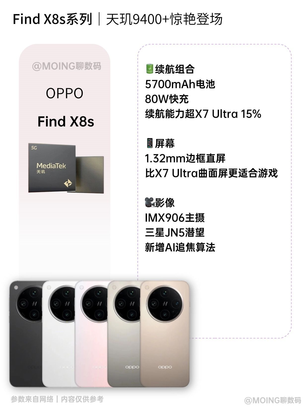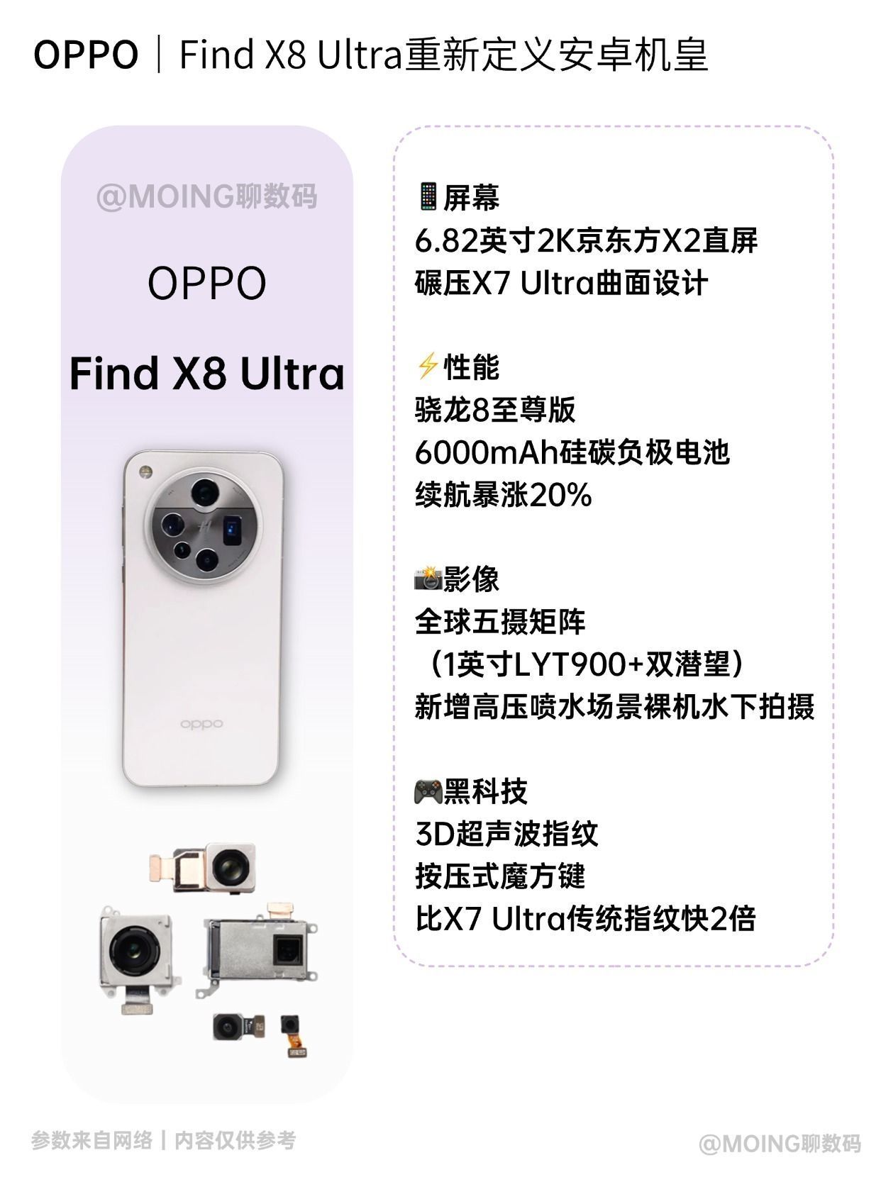 🔥「直屏党狂喜!Find X8 Ultra重新定义安卓机皇」 📱屏幕:6.82英寸2K京东方X2直屏,碾压X7 Ultra曲面设计 ⚡性能:骁龙8至尊版+6000mAh硅碳负极电池,续航暴涨20% 📸影像:全球首款五摄矩阵(1英寸LYT900+双潜望),新增高压喷水场景裸机水下拍摄 🎮黑科技:3D超声波指纹+按压式魔方键,比X7 Ultra传统指纹快2倍 - ✨「小屏旗舰Find X8s系列:天玑...