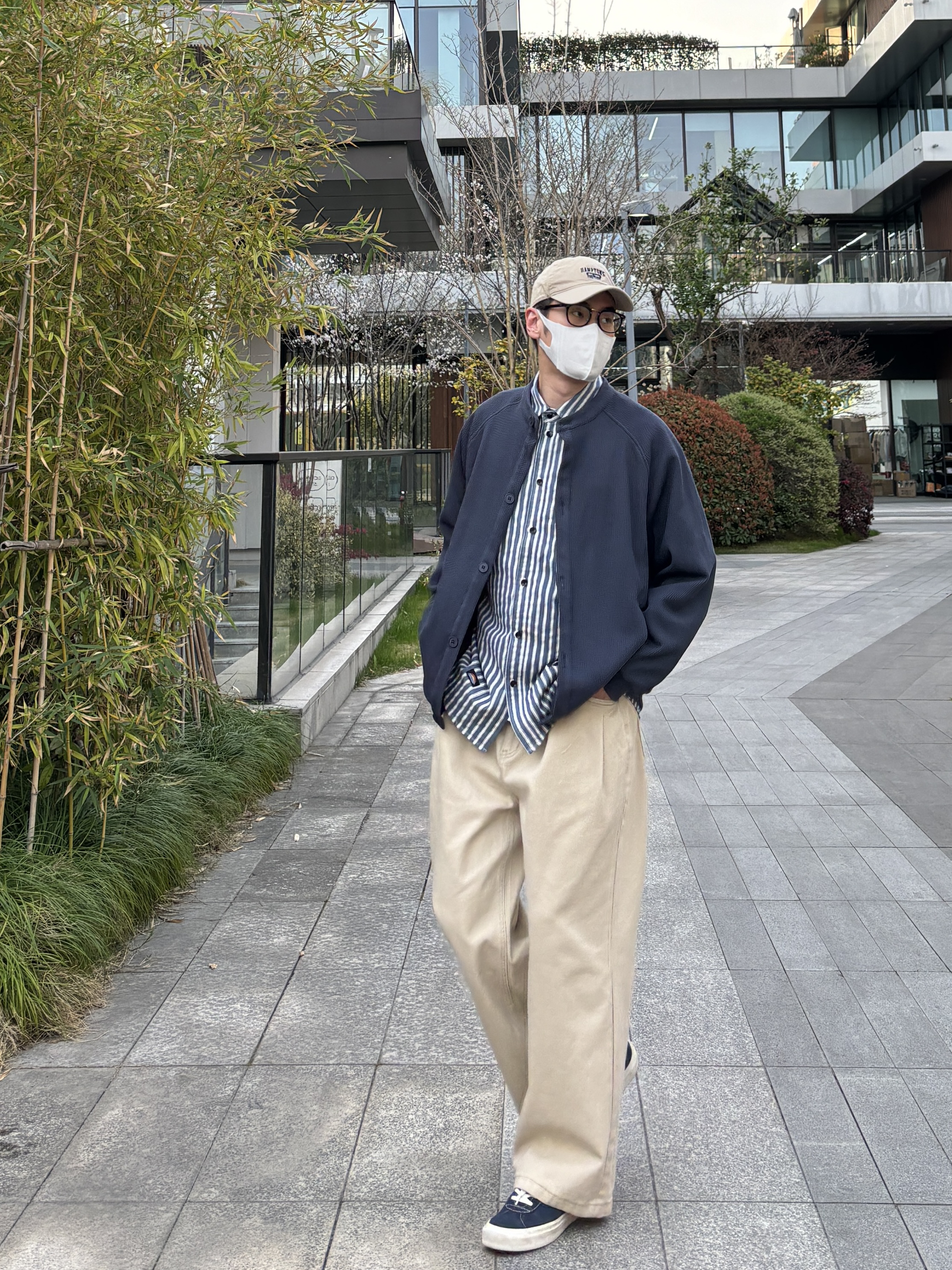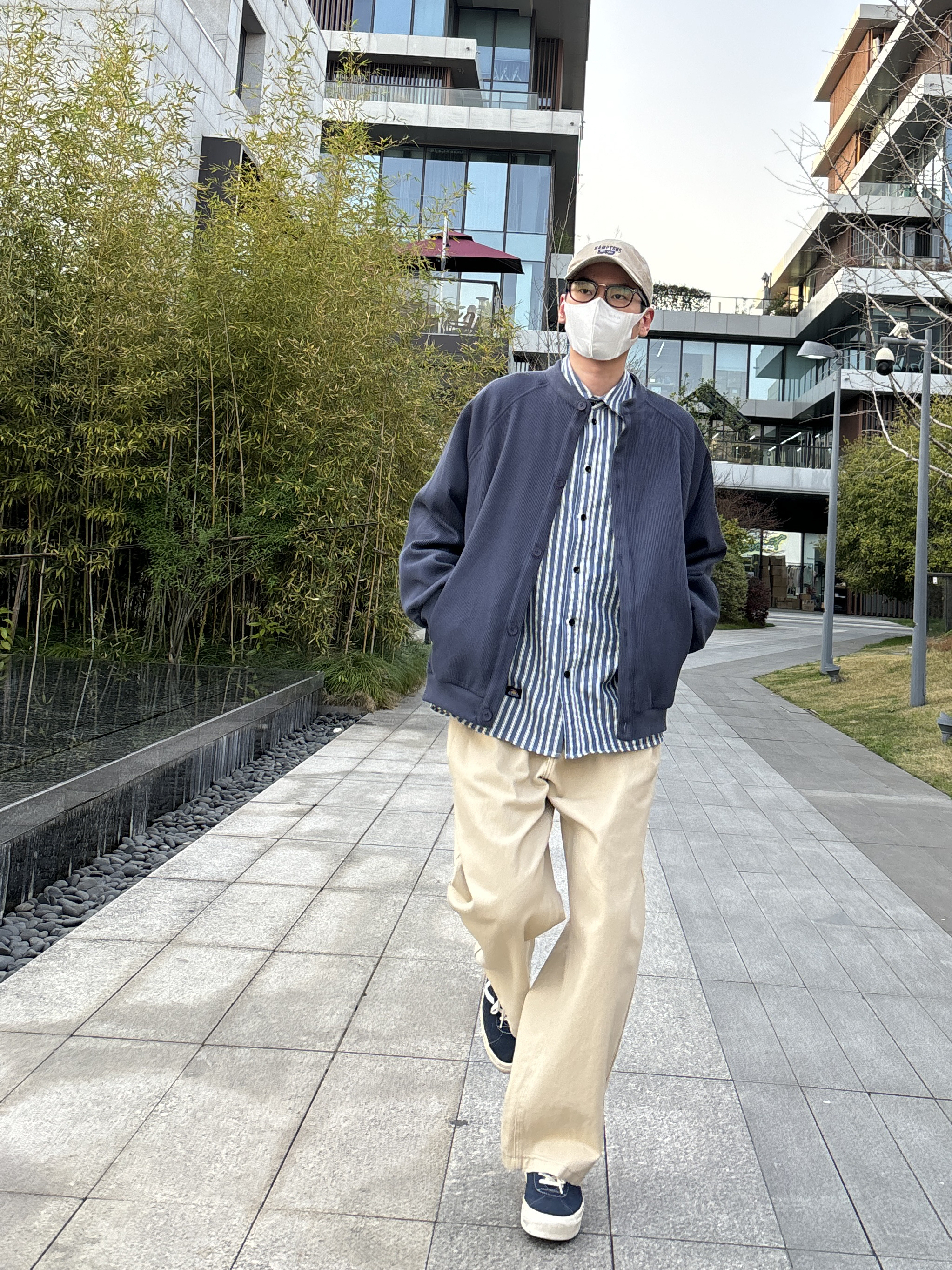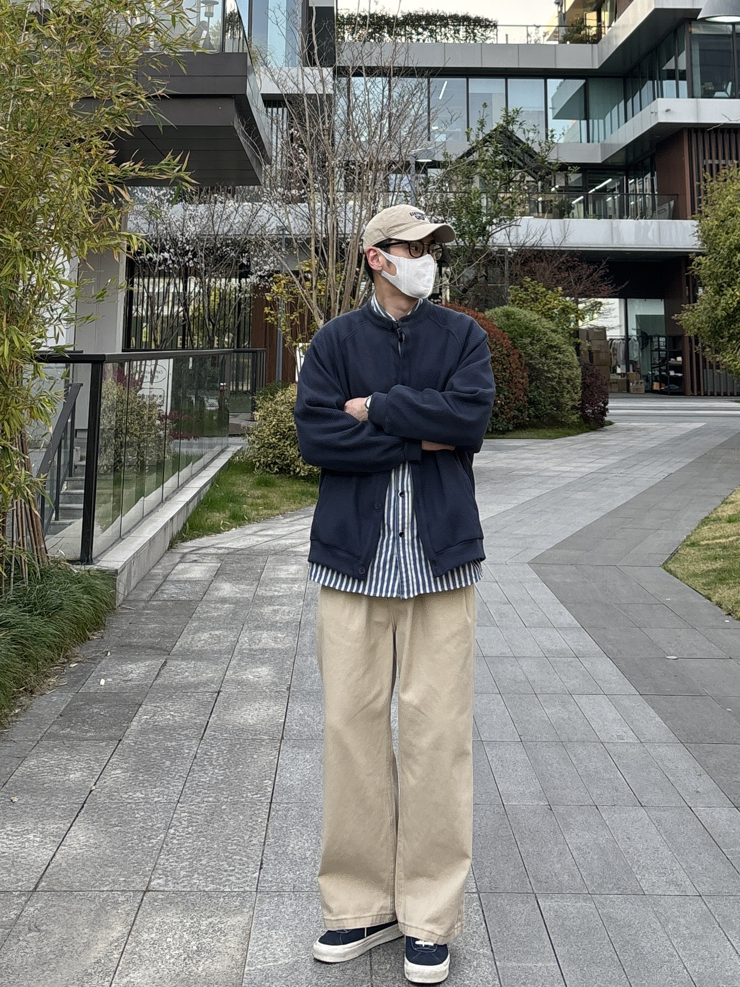 今天这套先用少年感十足的蓝色条纹休闲衬衫做内搭 ⬇️ 裤子选择松弛感十足的卡其色直筒垂感工装裤 ⬇️ 鞋子上脚简约百搭的海军蓝复古低帮板鞋 ⬇️ 接着套上藏青色宽松阔版华夫格亨利领开衫卫衣 ⬇️ 最后戴一顶棒球帽呼应下裤子的颜色 - 今日搭配 衣服裤子:NICE LILI 鞋子:vans