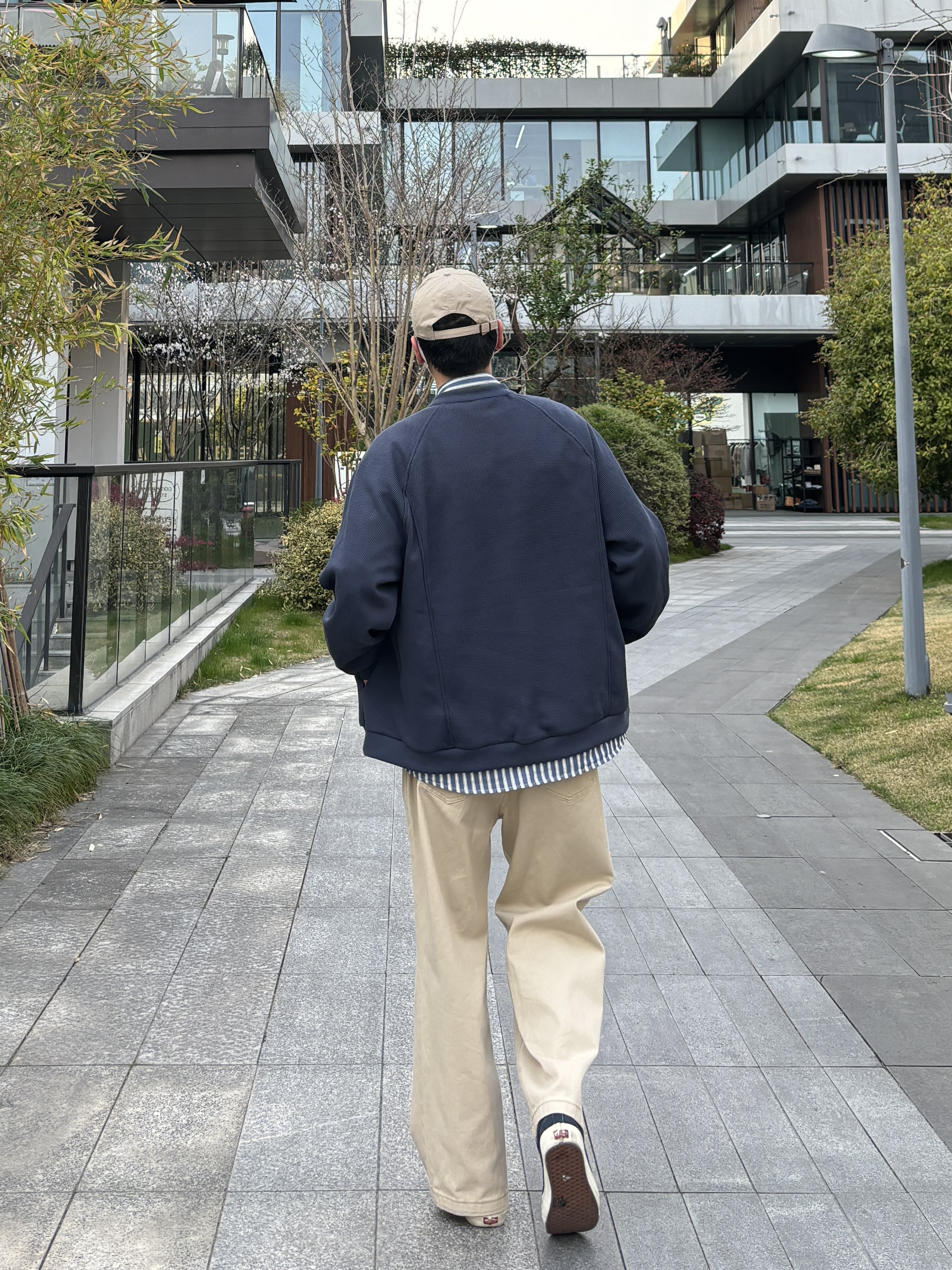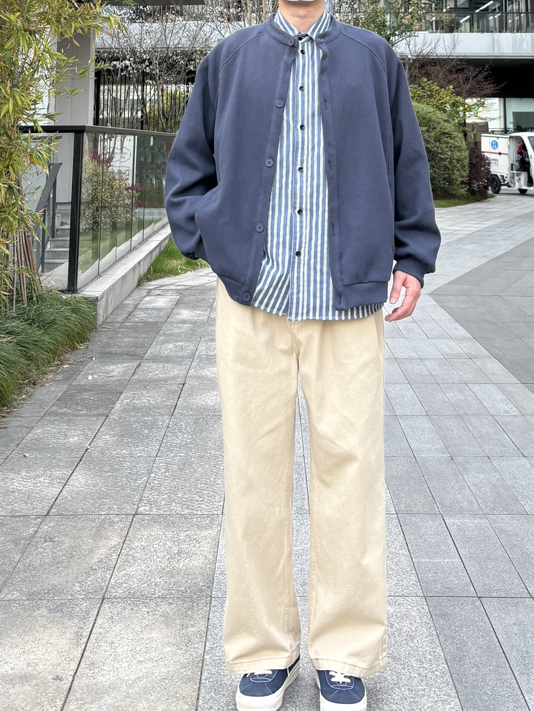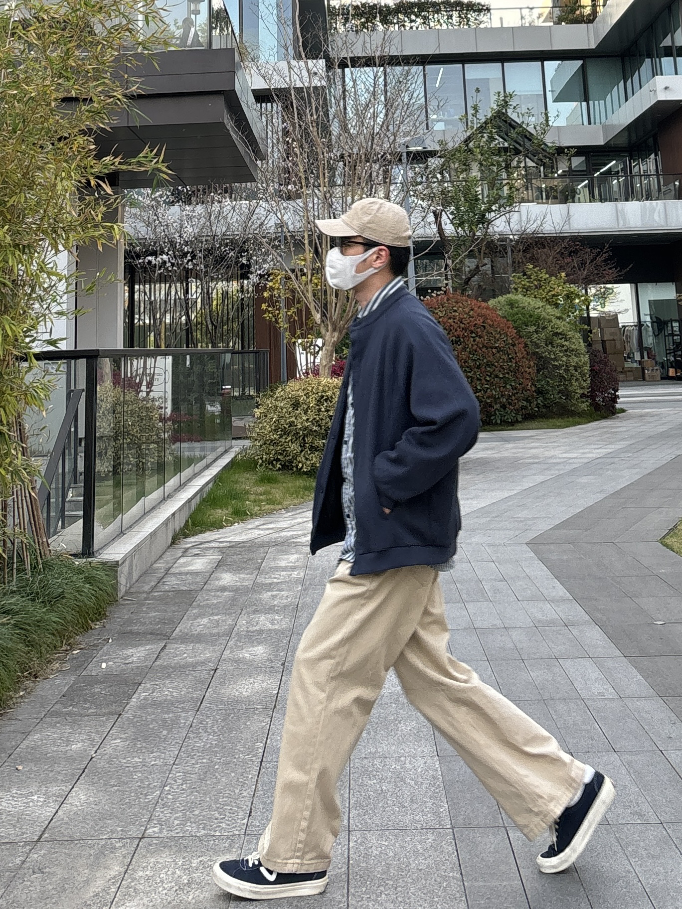 今天这套先用少年感十足的蓝色条纹休闲衬衫做内搭 ⬇️ 裤子选择松弛感十足的卡其色直筒垂感工装裤 ⬇️ 鞋子上脚简约百搭的海军蓝复古低帮板鞋 ⬇️ 接着套上藏青色宽松阔版华夫格亨利领开衫卫衣 ⬇️ 最后戴一顶棒球帽呼应下裤子的颜色 - 今日搭配 衣服裤子:NICE LILI 鞋子:vans