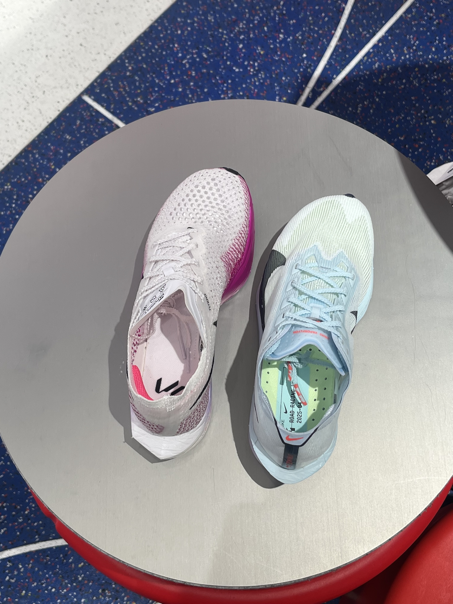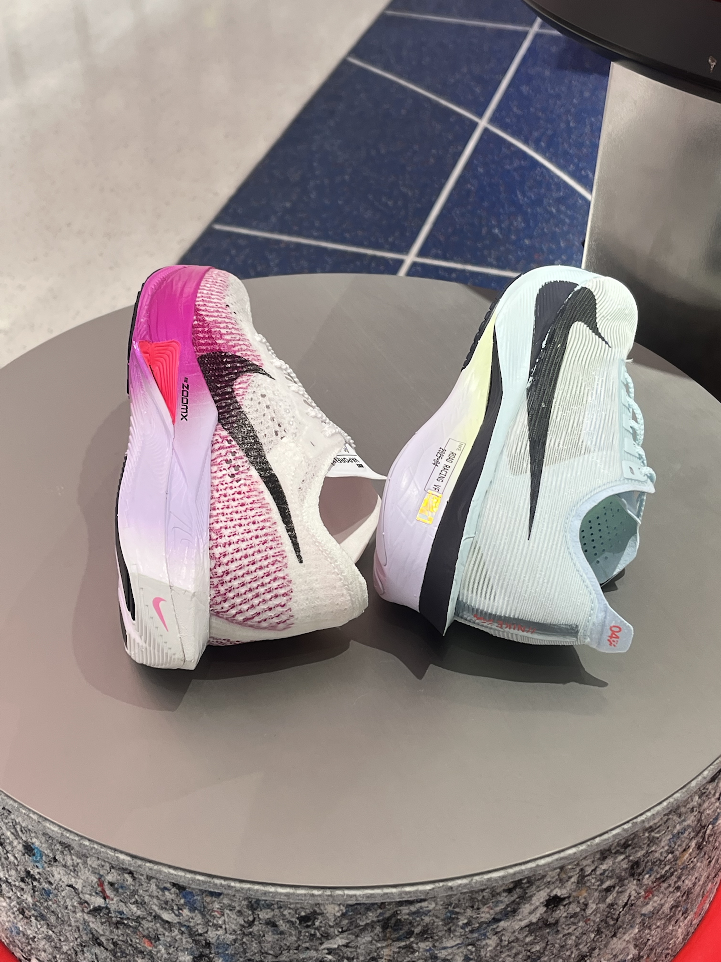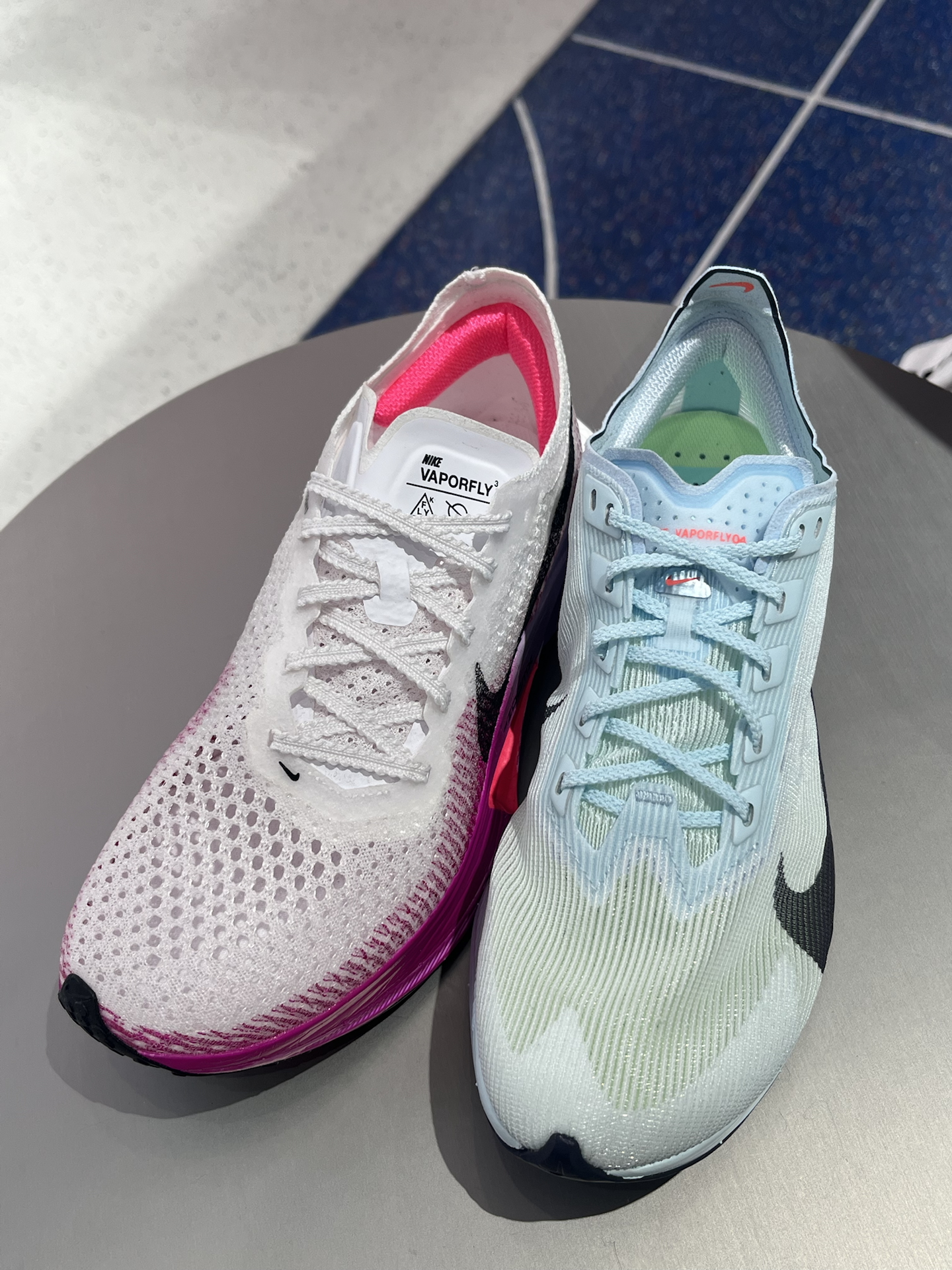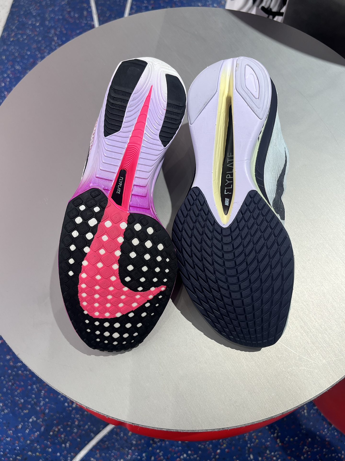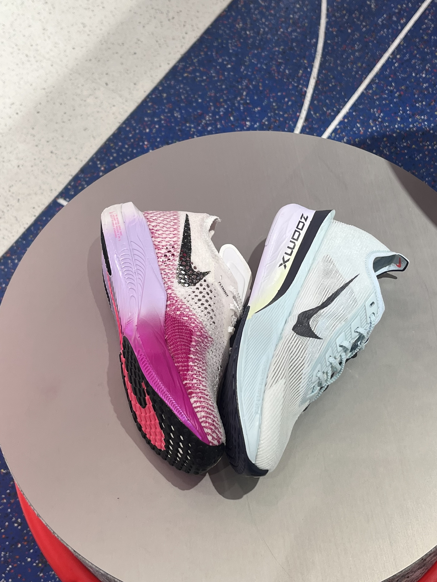 🤩VaporFly4代冰川蓝和VaporFly3火龙果,两双鞋同时放在一起,但依旧不少人选择3代,毕竟发售近2年先入为主,但论性能来说4代会更好~ 🆚4代会比3代的重量更轻10%左右,后跟内收所以宽脚劝退;鞋面虽然没有那么大网眼,但却比3代更透气,包裹感也更强。 🔥相同点就是,中底配置同样都是ZoomX泡棉中底+全掌碳板,但4代脚感会比3代更韧弹。 ✔️两双都是前掌橡胶,主要适合前掌落地的跑法,再...