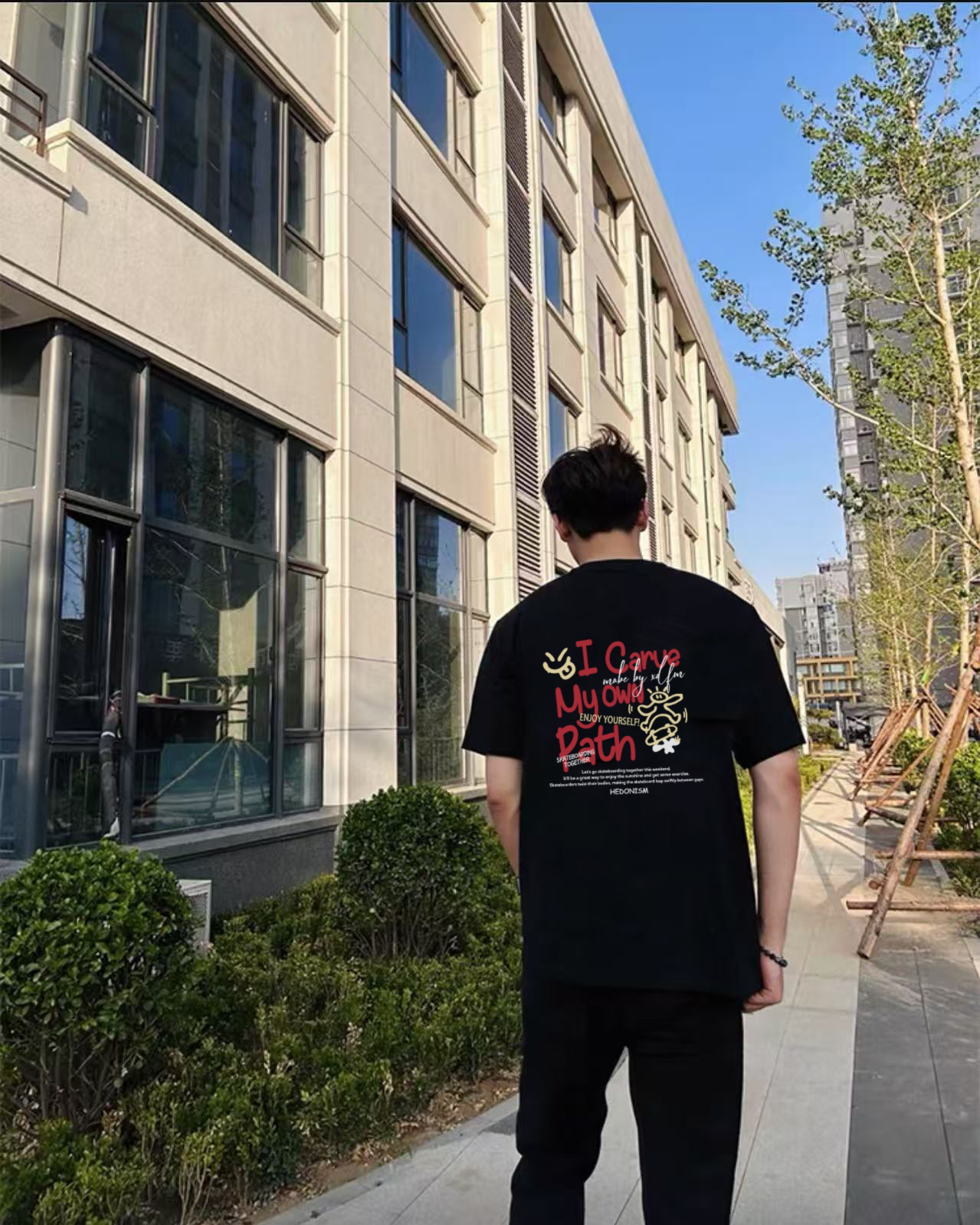 春夏的万能黑T 黑色系上身很容易给人一种酷酷的感觉 舒适又百搭 胸前的图案设计增加了时尚感 日常出门搭个牛仔裤 简简单单一套通勤搭配 就hin帅气