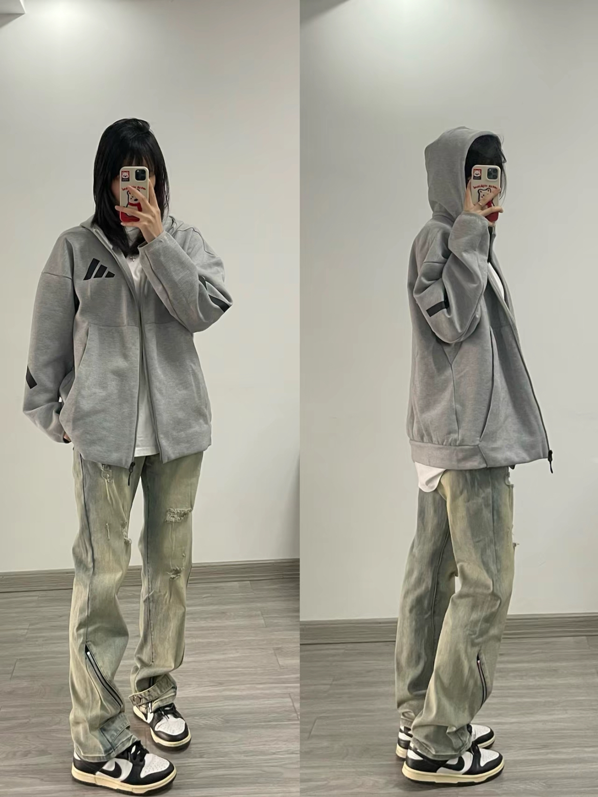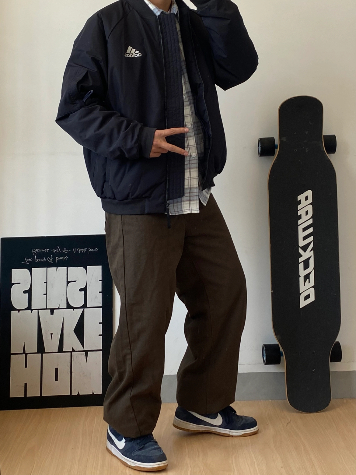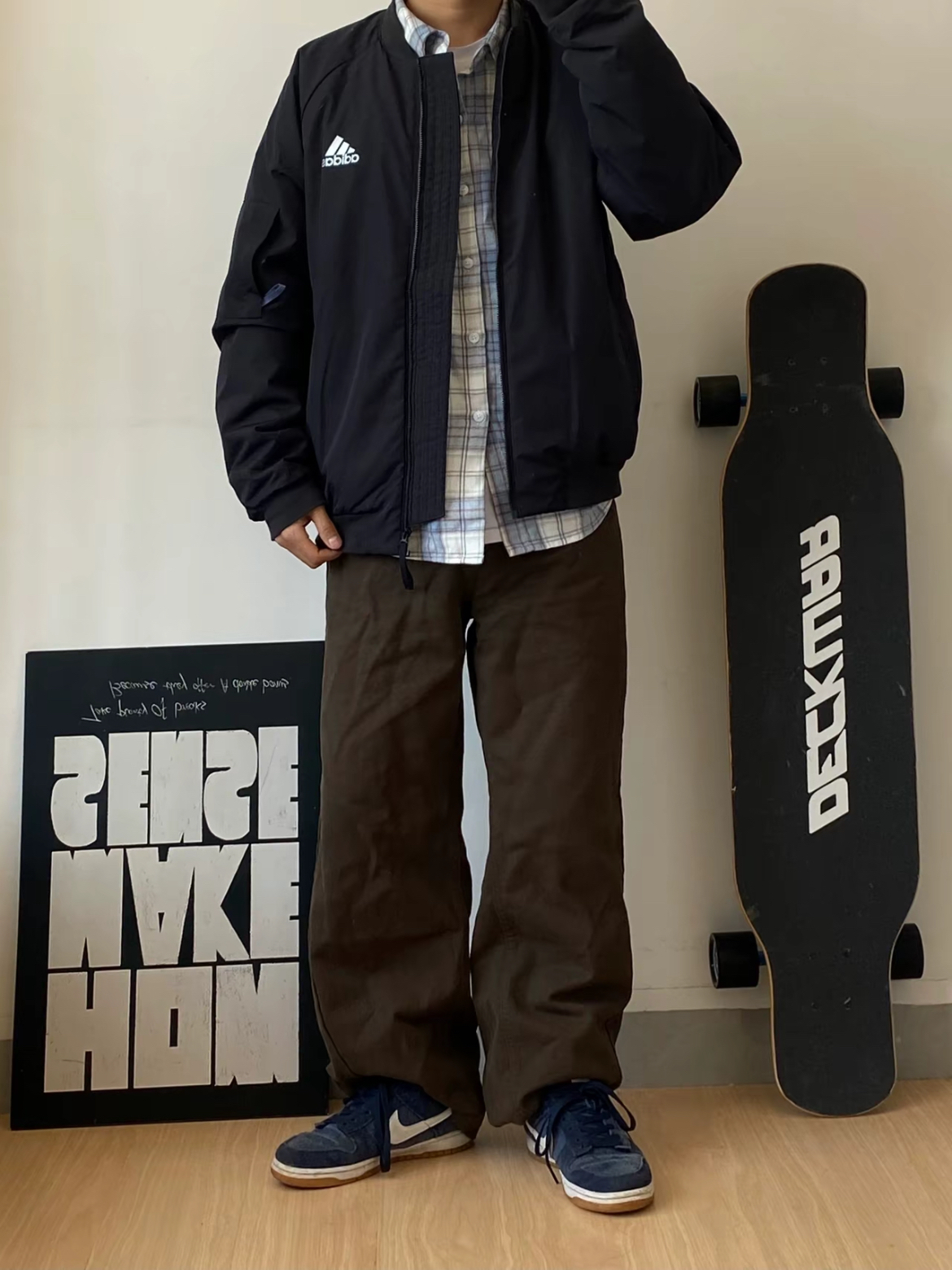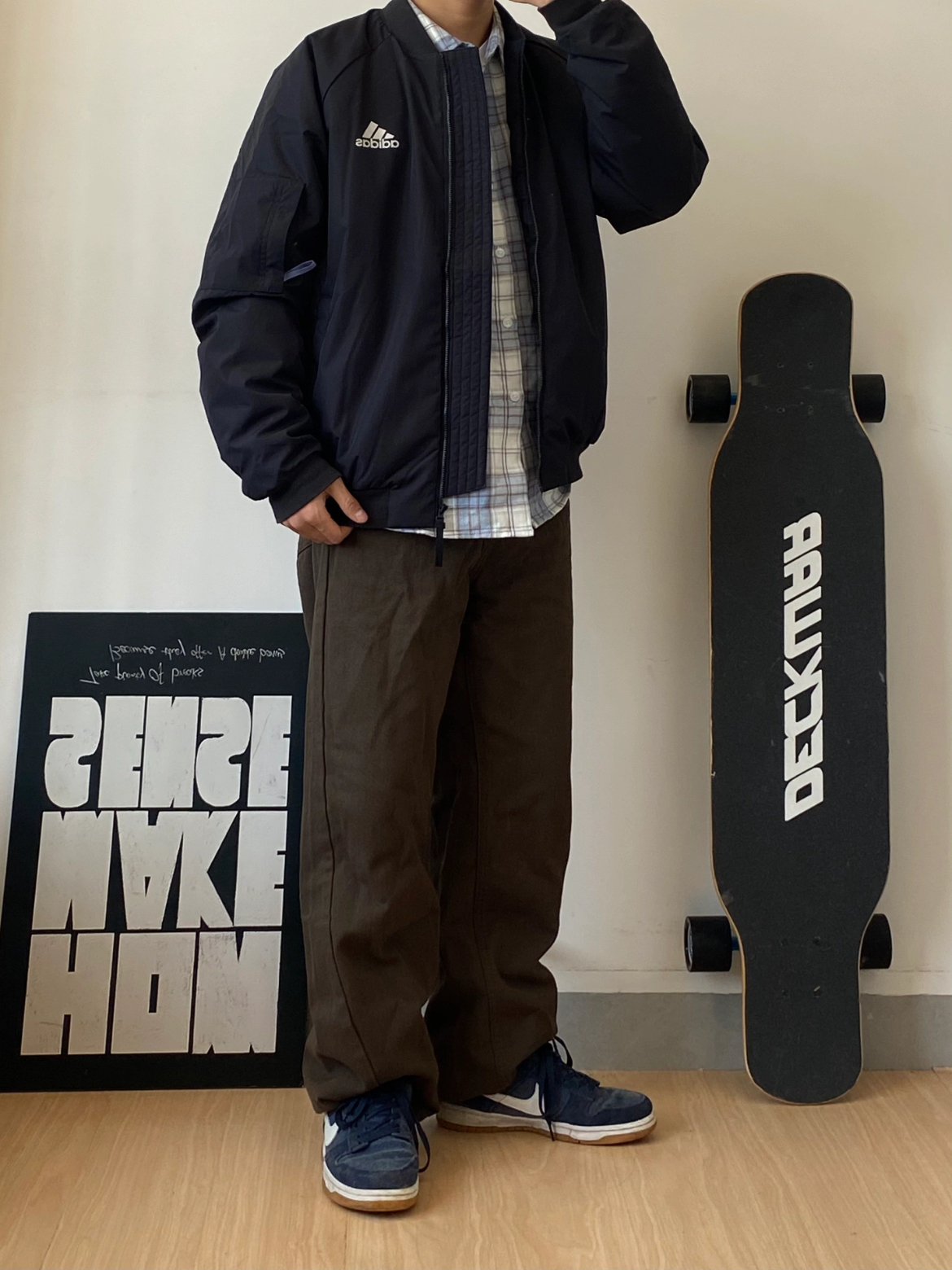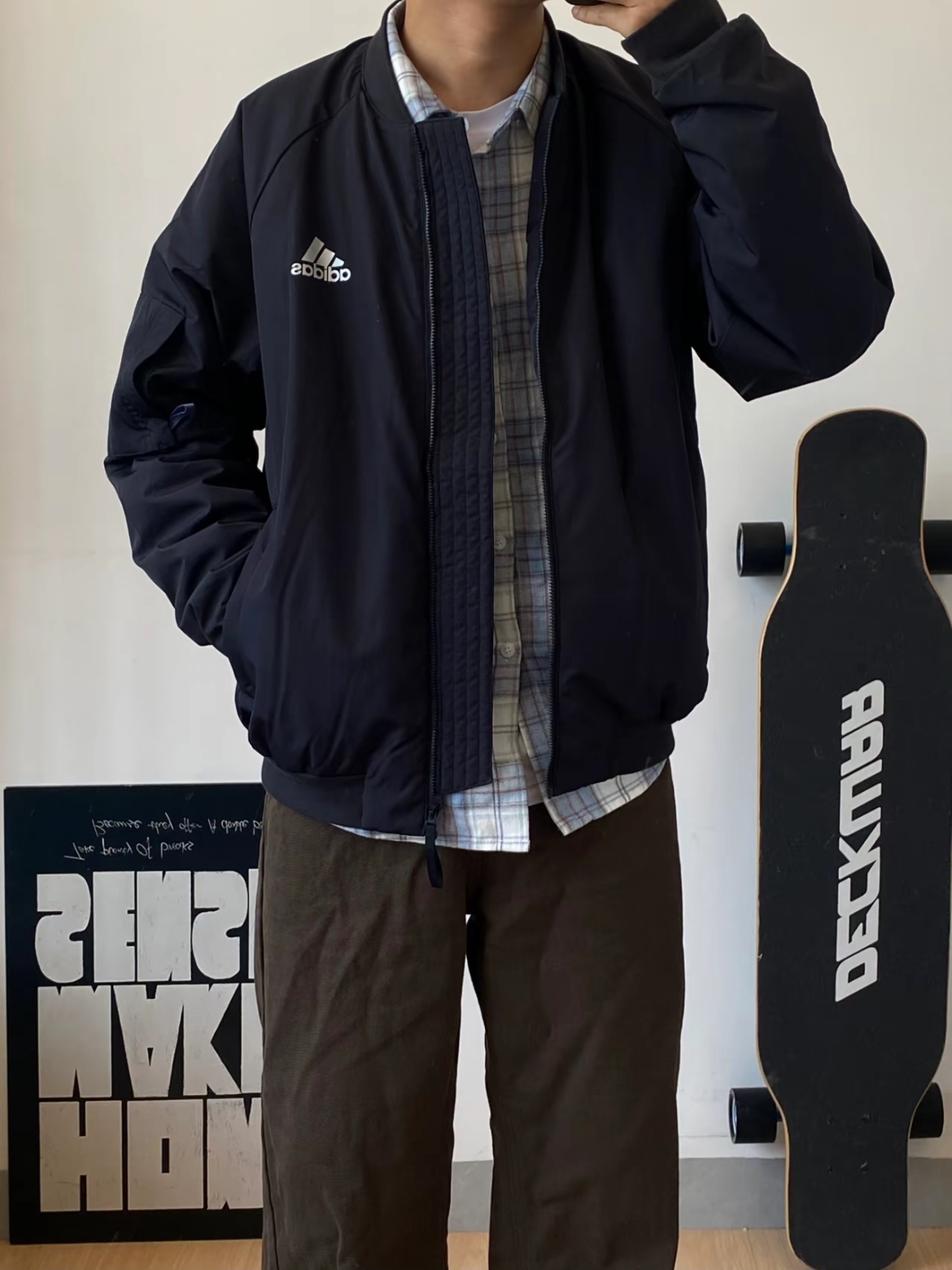 今日穿搭 阿迪夹克外套内搭格子衬衫 下身搭配卡其色休闲裤和耐克板鞋 蛮喜欢这种休闲感的穿搭 日常不会夸张 黑色简约随性 搭配浅色系裤子也蛮那看看
