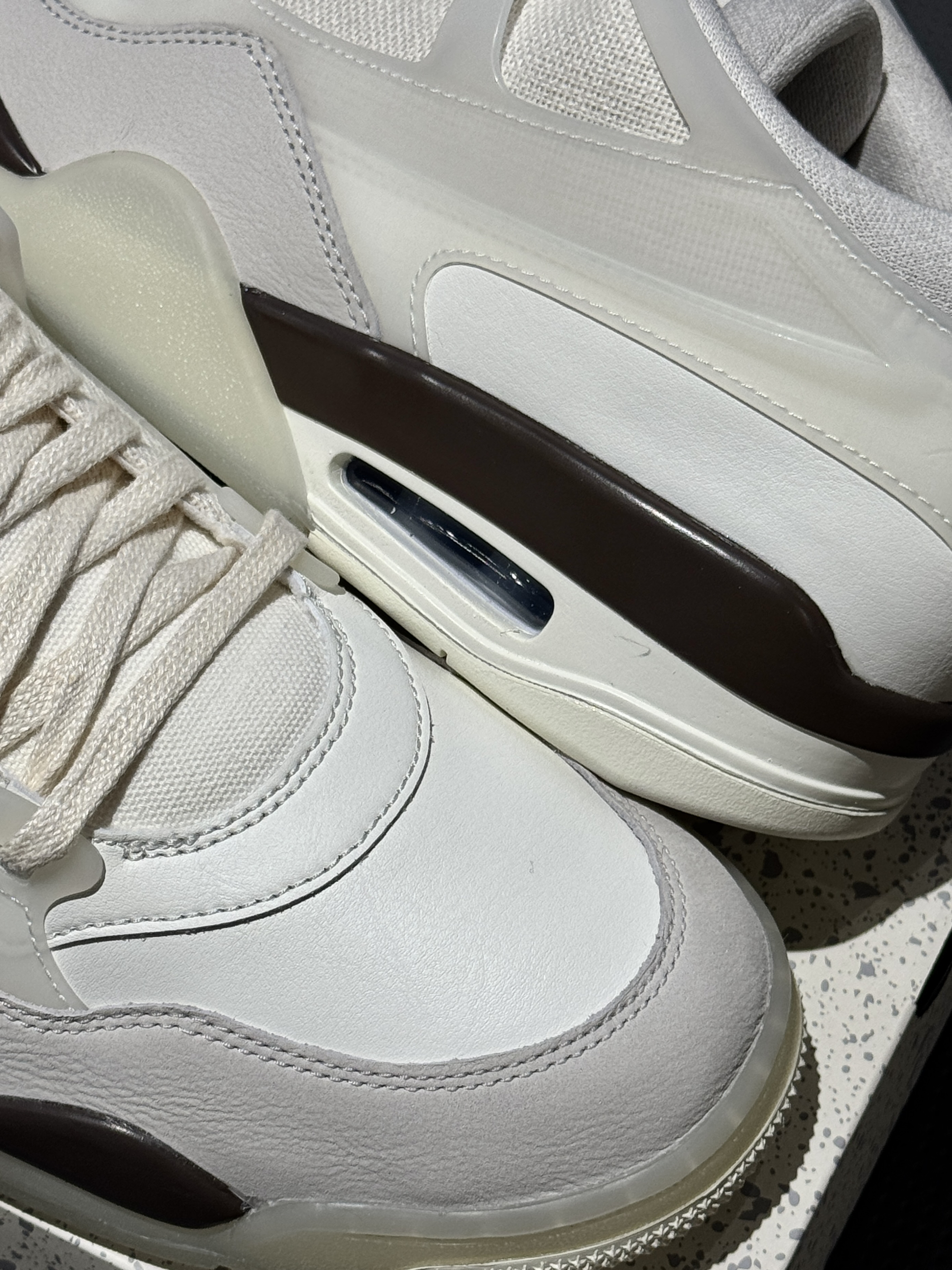 🤠Hello大家好我是CZen王世军,你的球鞋搭子。 📦今天跟大家开箱分享AJ4RM米棕色,这颜色很特别,看起来很美式休闲的感觉,上脚也特别好搭。 👟鞋面主要以皮面为主,在鞋舌周围用了少量的织物,同时织物和鞋带用了类似较粗糙纺纱,搭配上米棕色看起来就很舒服。 🔍皮面部分为牛皮革加合成革,整体质地非常柔软细腻,穿起来也很舒服。鞋侧的橡胶换成了半透明的软胶,和鞋底的外漏水晶底呼应。 ✨在Logo和线条...