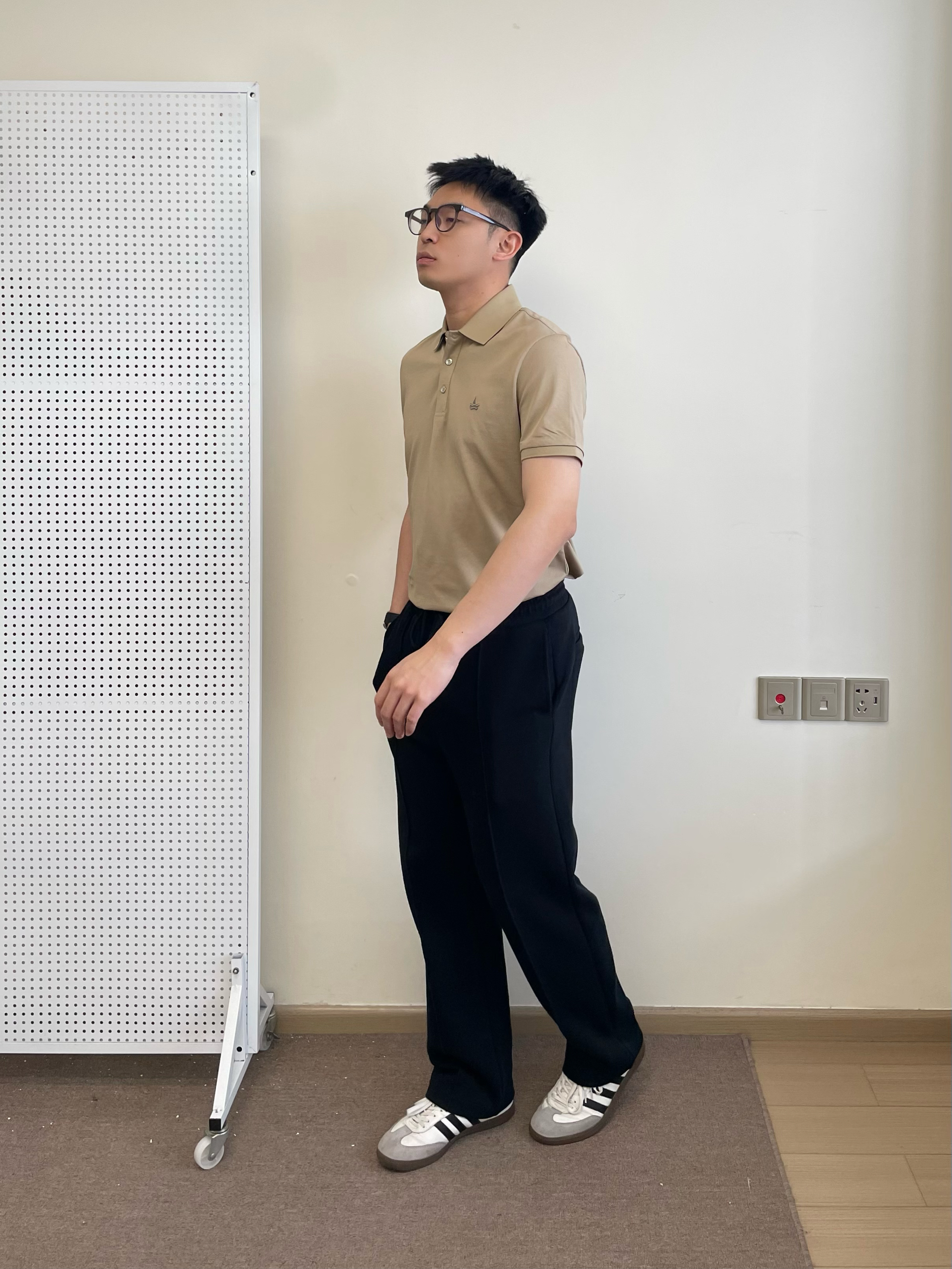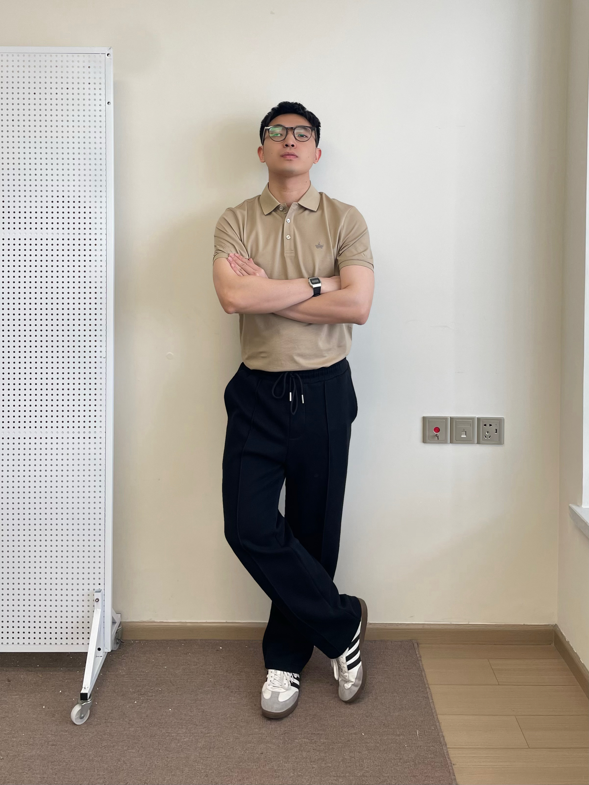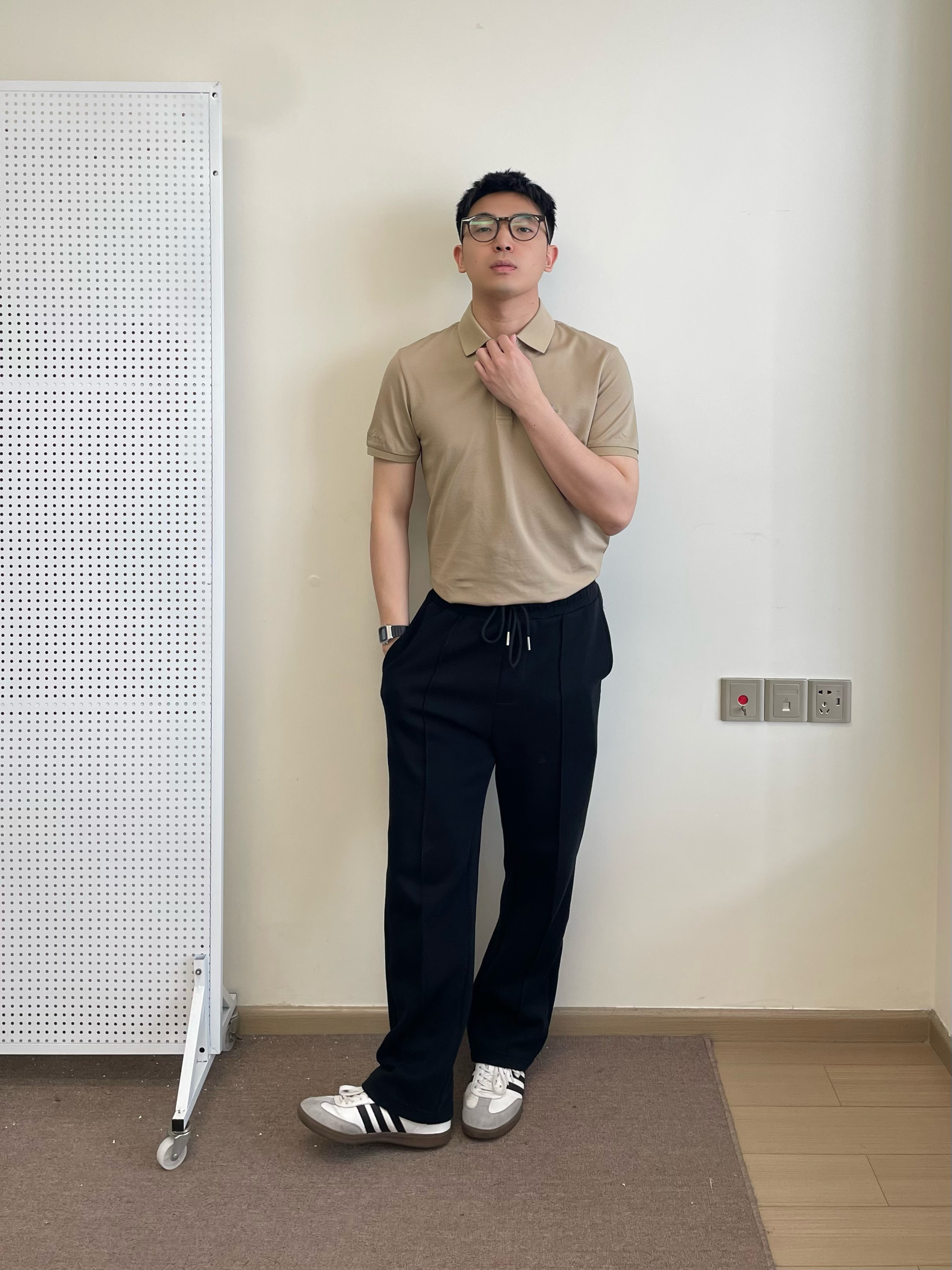 又到了一年一度的春招了,今天上身一件 navigare 意大利小帆船polo短袖,选择了比较耐看的浅咖色,低调好看。简约的小logo修饰一下。 裤子调了一条直筒黑色卫裤,比较好走动,版型也是简约款。搭配一双经典德训鞋就挺好看。